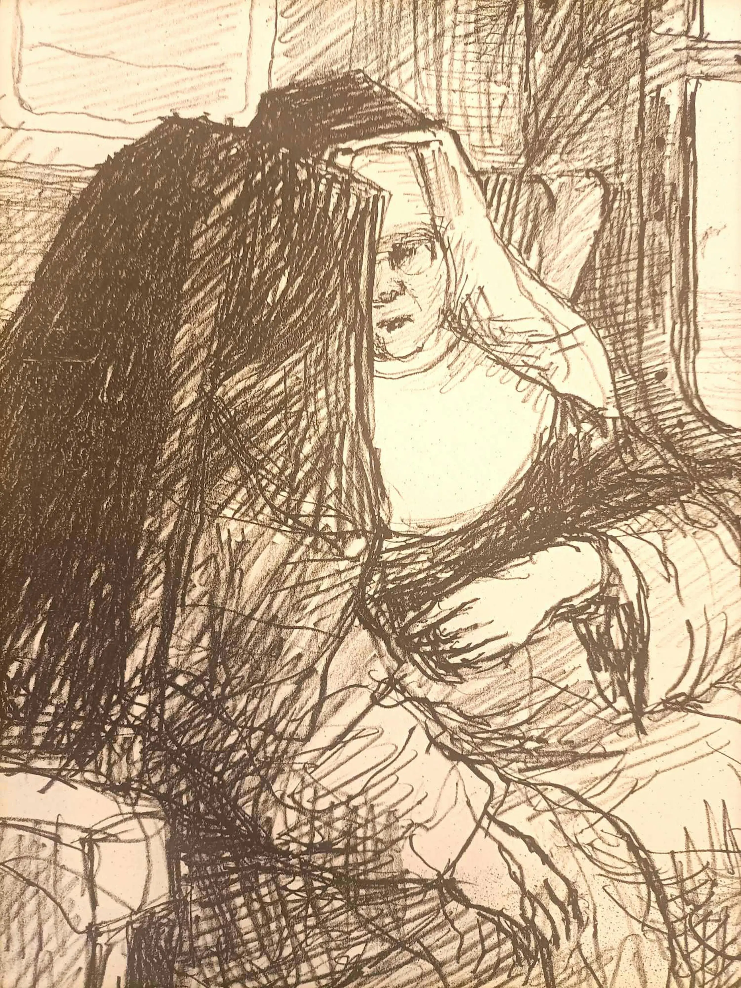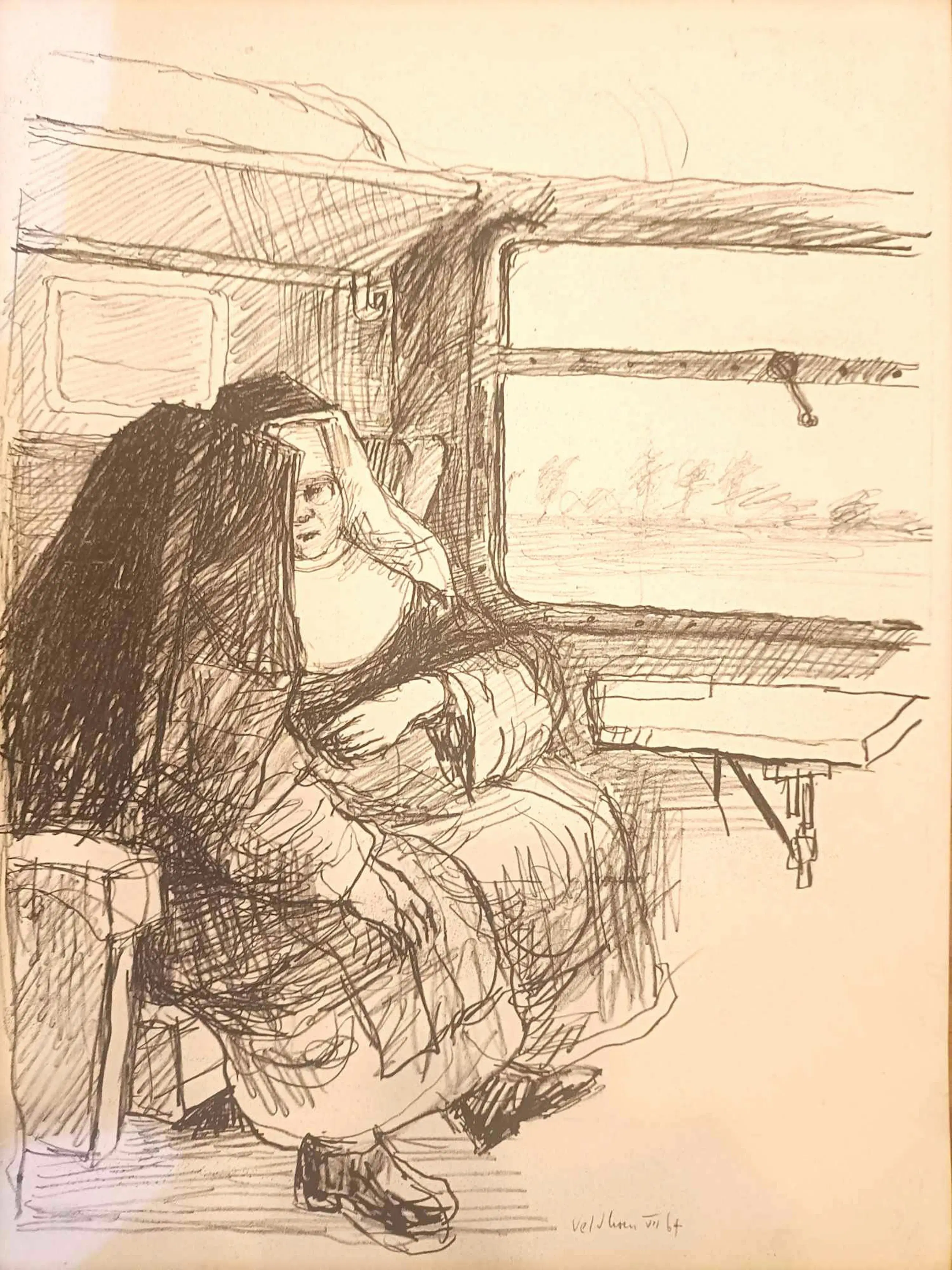 Rotaprint met Twee Nonnen in een Trein erop, wordt in koker verzonden. Drukgesigneerd.