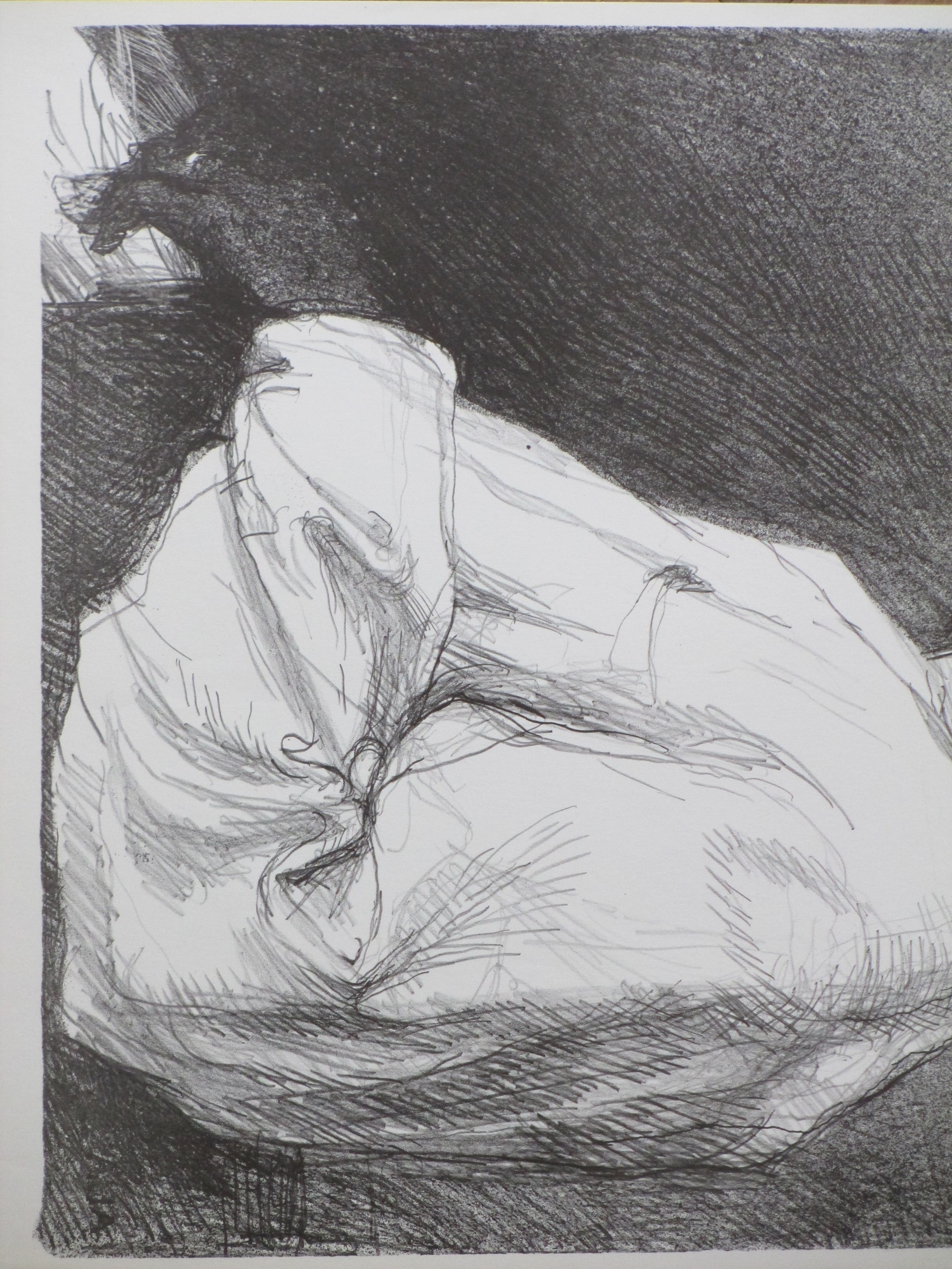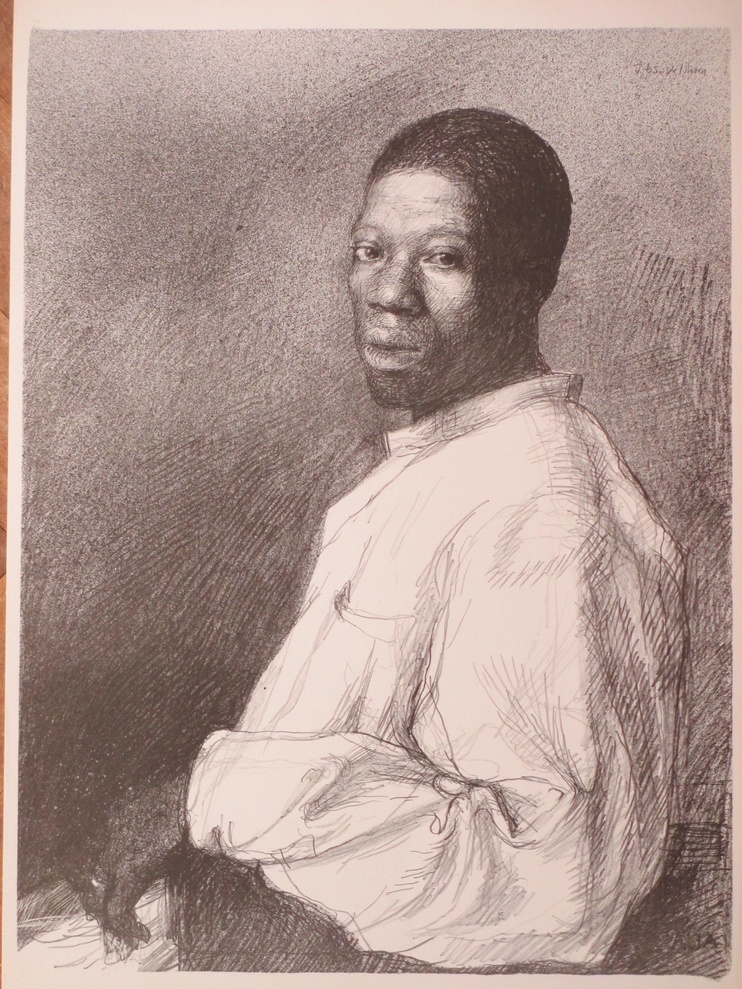 Rotaprint door Aat VeldhoenVoorstelling van een zittende donkere manLosbladig, beeldmaat 44x33, bladmaat 50x34Gedateerd en gesigneerd in de druk r.b. ' V 65 - Veldhoen' Authenticiteit volledig gegarandeerd