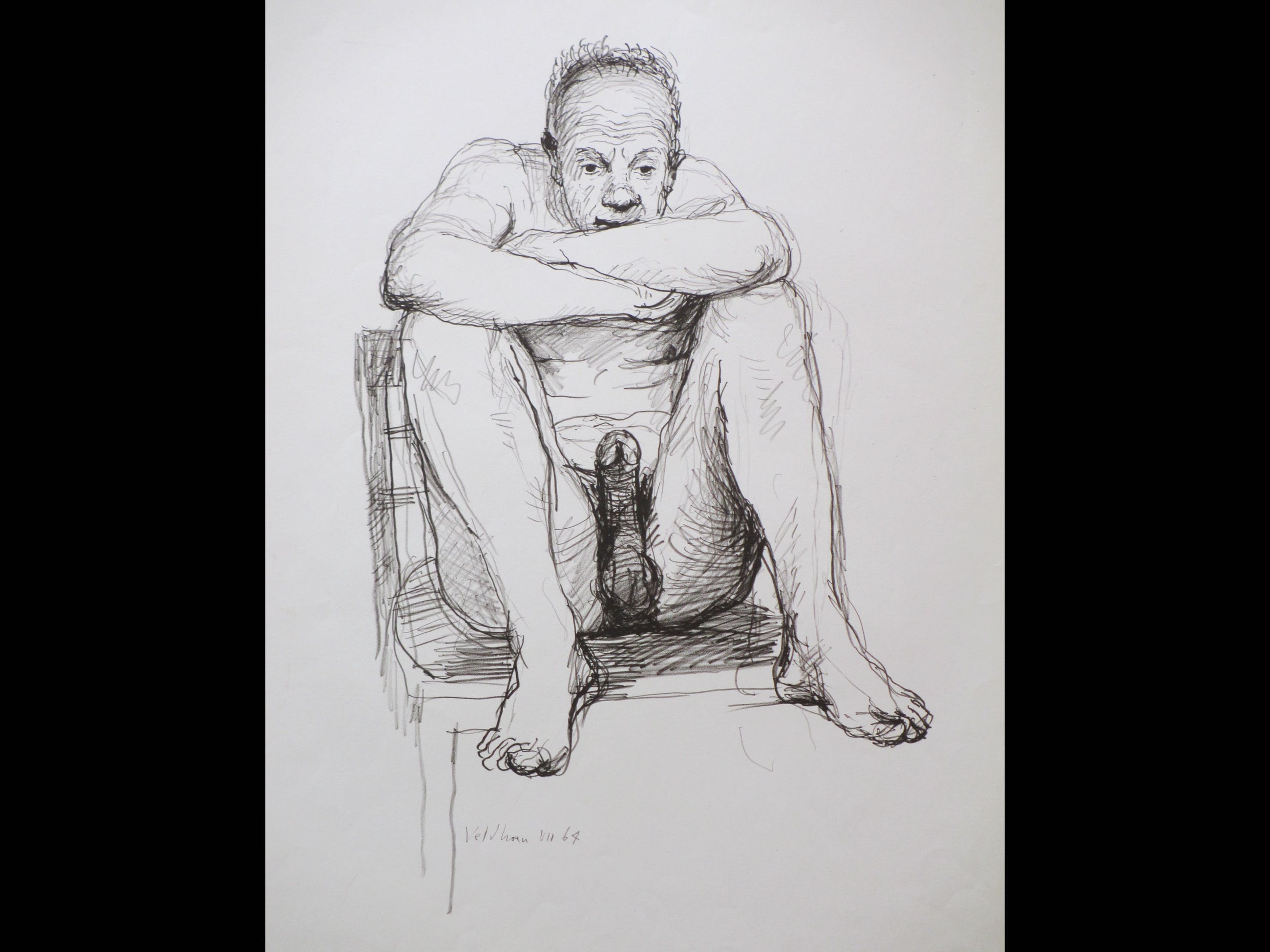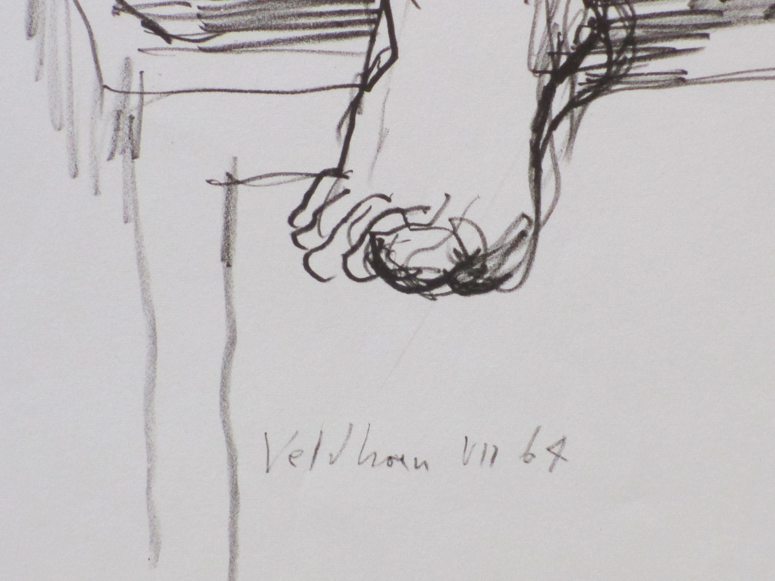 Rotaprint in de Veldhoen welbekende stijl.Voorstelling van een zittende naakte man op een stoel.Losbladig, beeldmaat 35x24, bladmaat 50x36.Gesigneerd en gedateerd 'Veldhoen VII 64' middenkader. Authenticiteit volledig gegarandeerd.