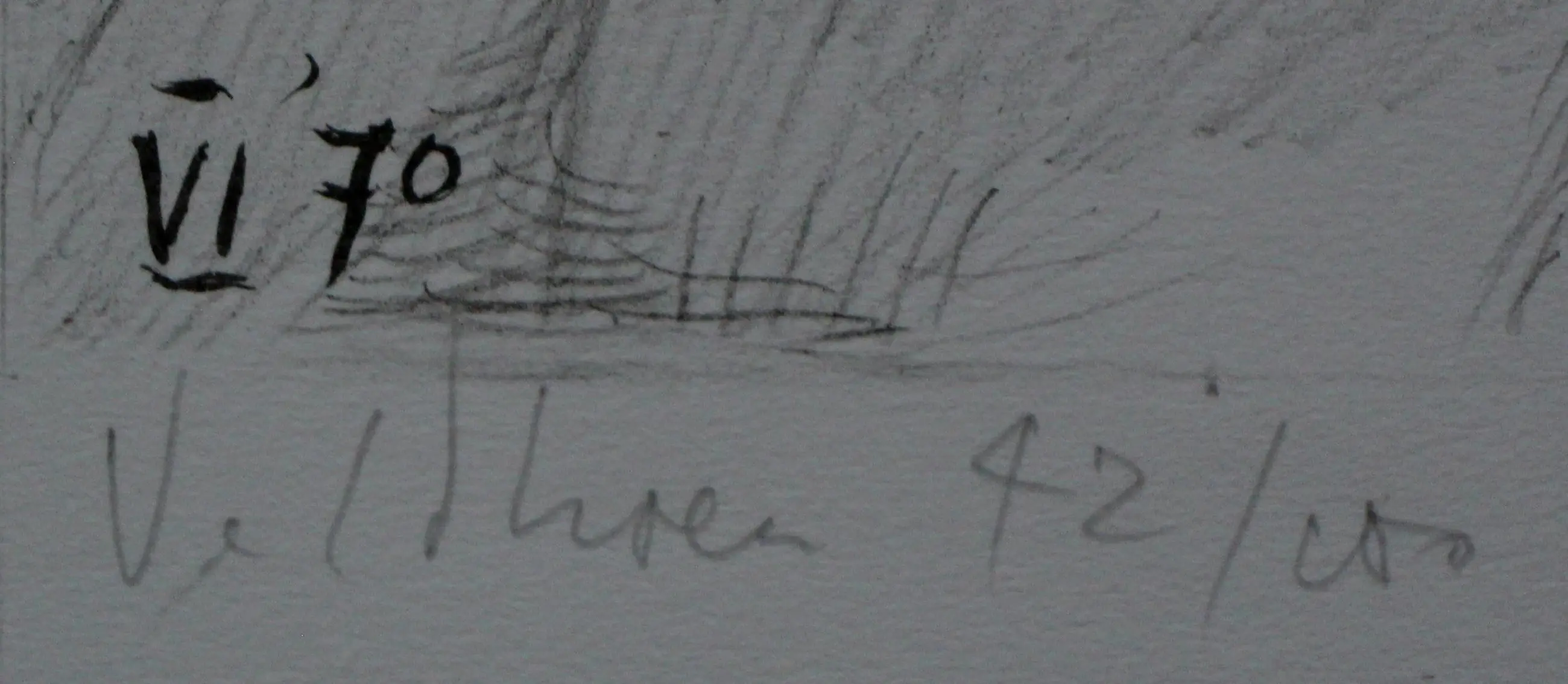 Litho van Aat Veldhoen. Jaar: 1970. Oplage: 42/100. Nr: VI. Afmetingen blad: H56 x b76cm. Afmetingen voorstelling: H46 x b58cm. Het werk is links onderaan, met potlood gesigneerd, door de kunstenaar. De authenticiteit van het aangeboden werk wordt volledig gegarandeerd. Een certificaat van echtheid kan, op aanvraag worden gemaild.