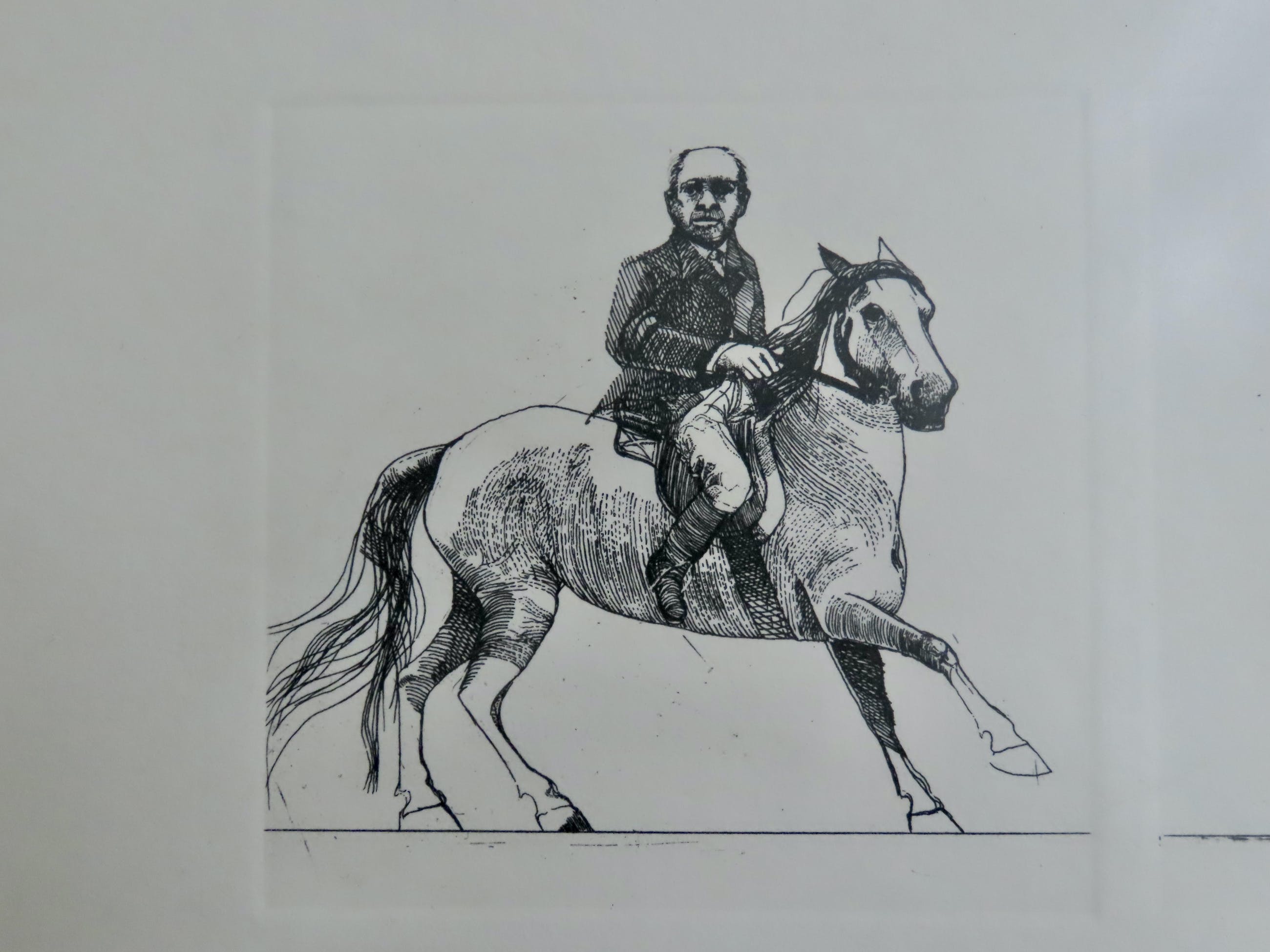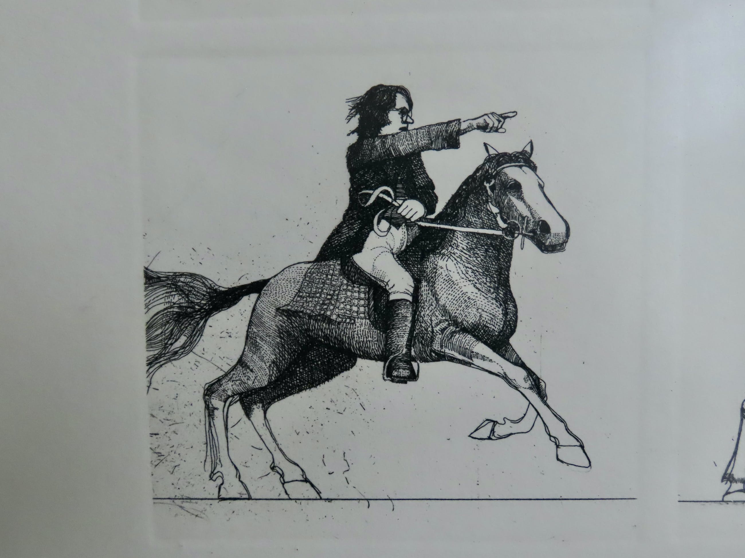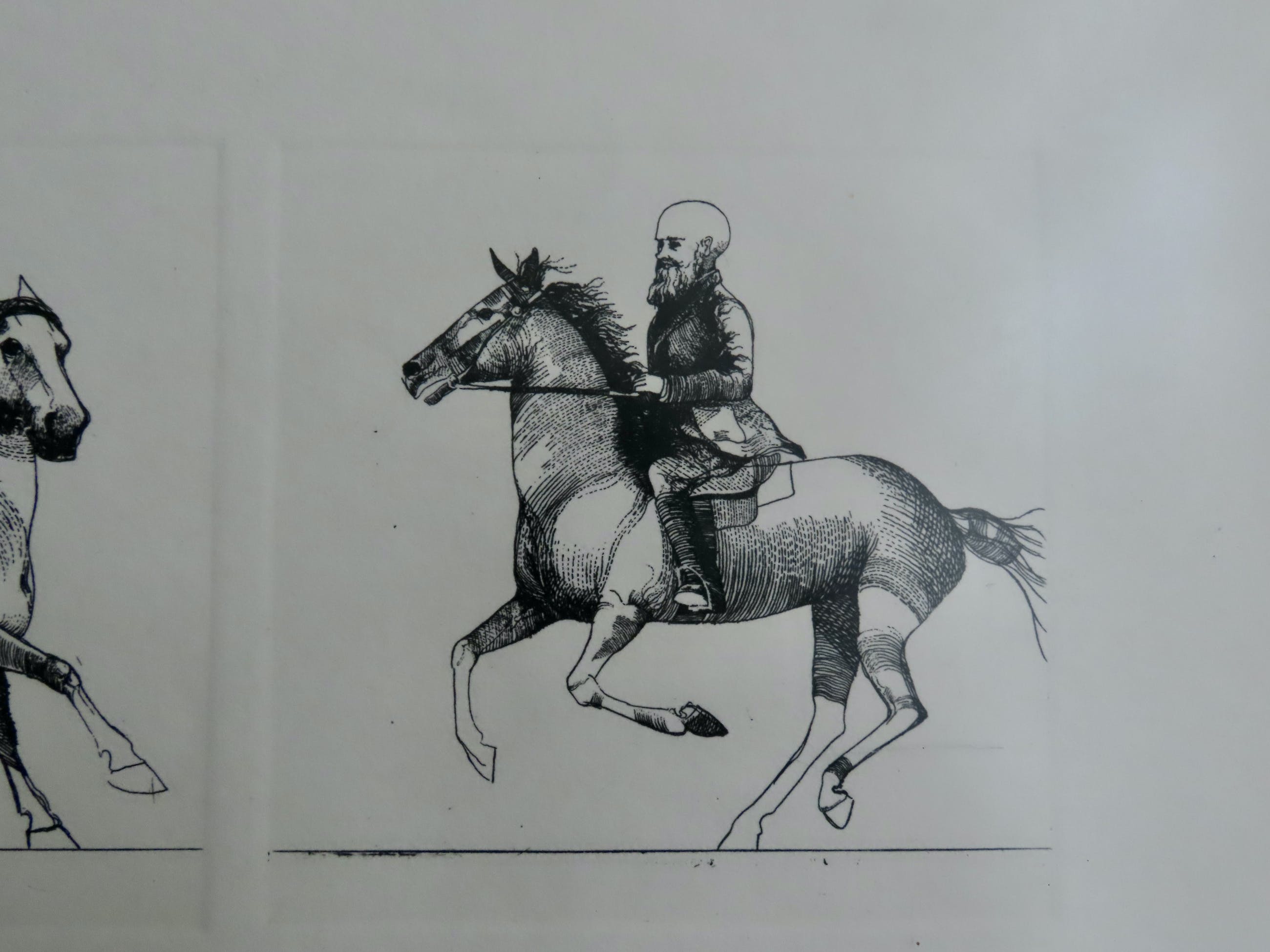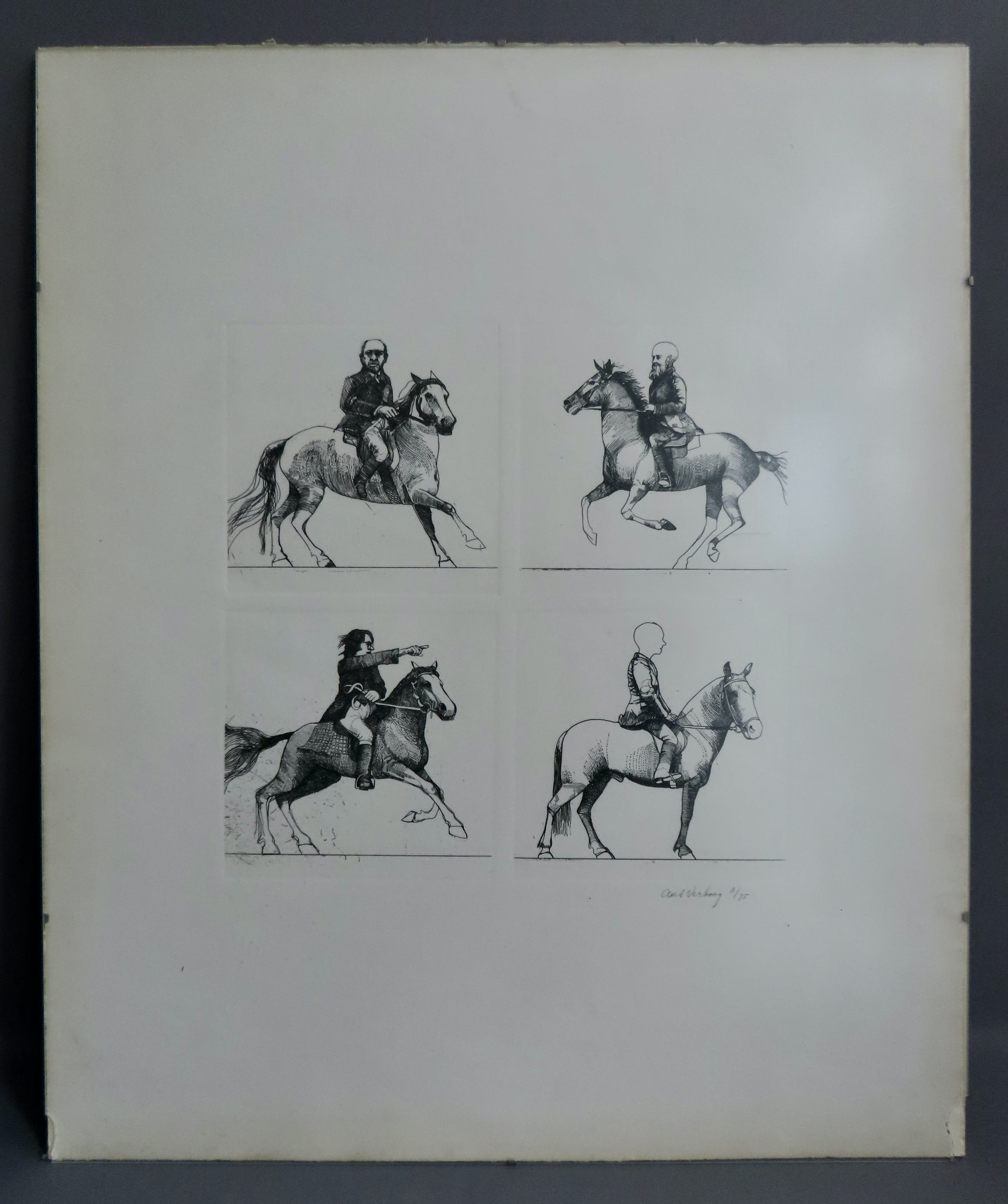 Vier ruiters te paard, in beweging, enigszins abstract. De ets op papier is gemaakt door de bekende kunstenaar Aat Verhoog (1933-).