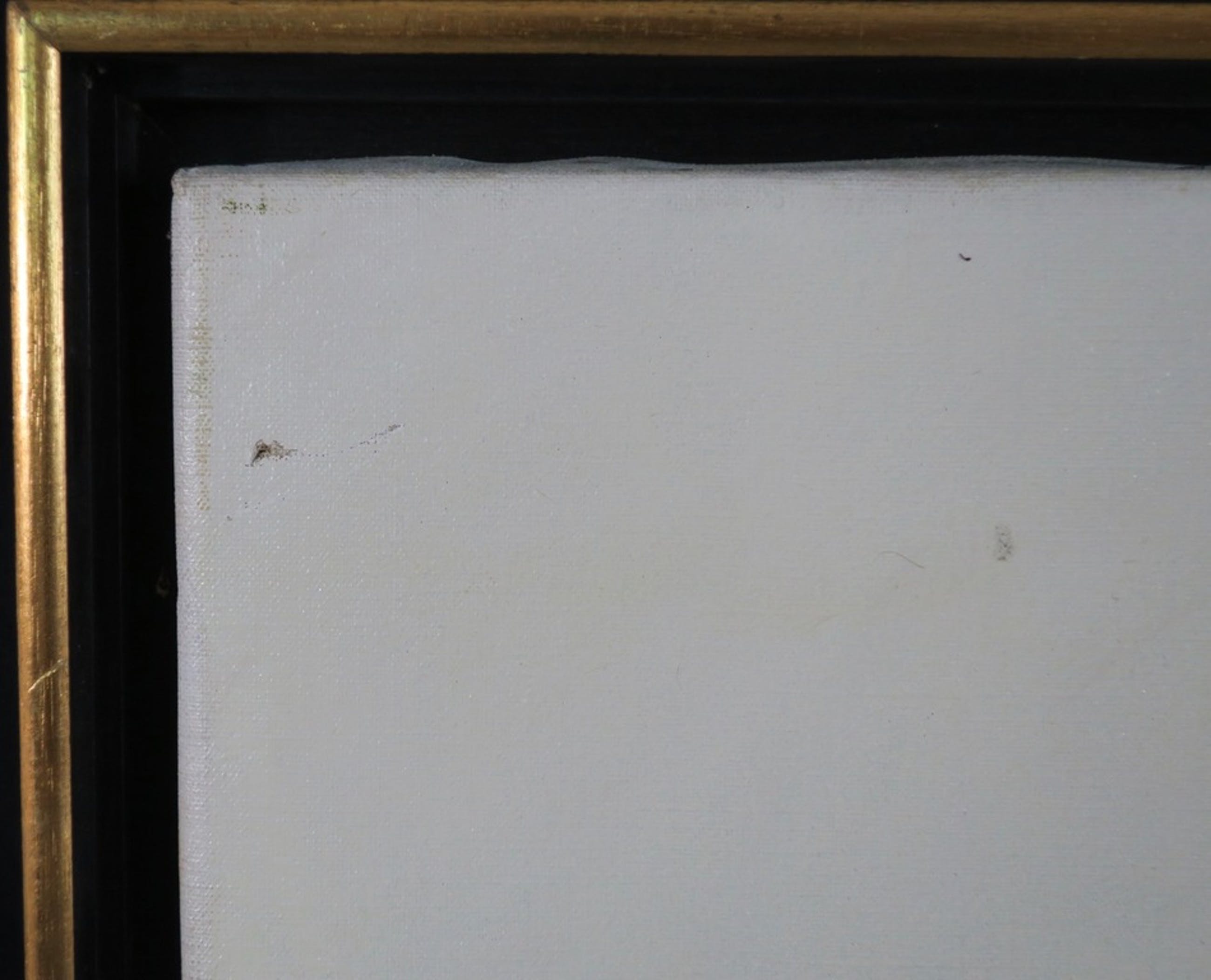 Conditie:In goede staat, maar met een kleine buts in het doek linksboven (zie detailfoto) en paar stipjes verfverlies rechtsonder (in het rood).