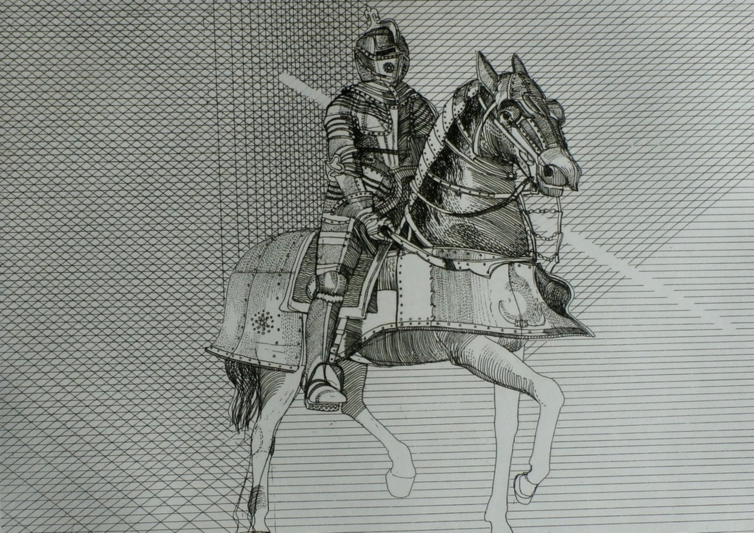Ets van Aat Verhoog. Titel: ridder op paard. Nummer: 8/50. Afmetingen totale blad: H36 x b44,5 cm. Afmetingen ets: h25 x b32 cm. Handgesigneerd rechts onder en in de druk( februari 1971).