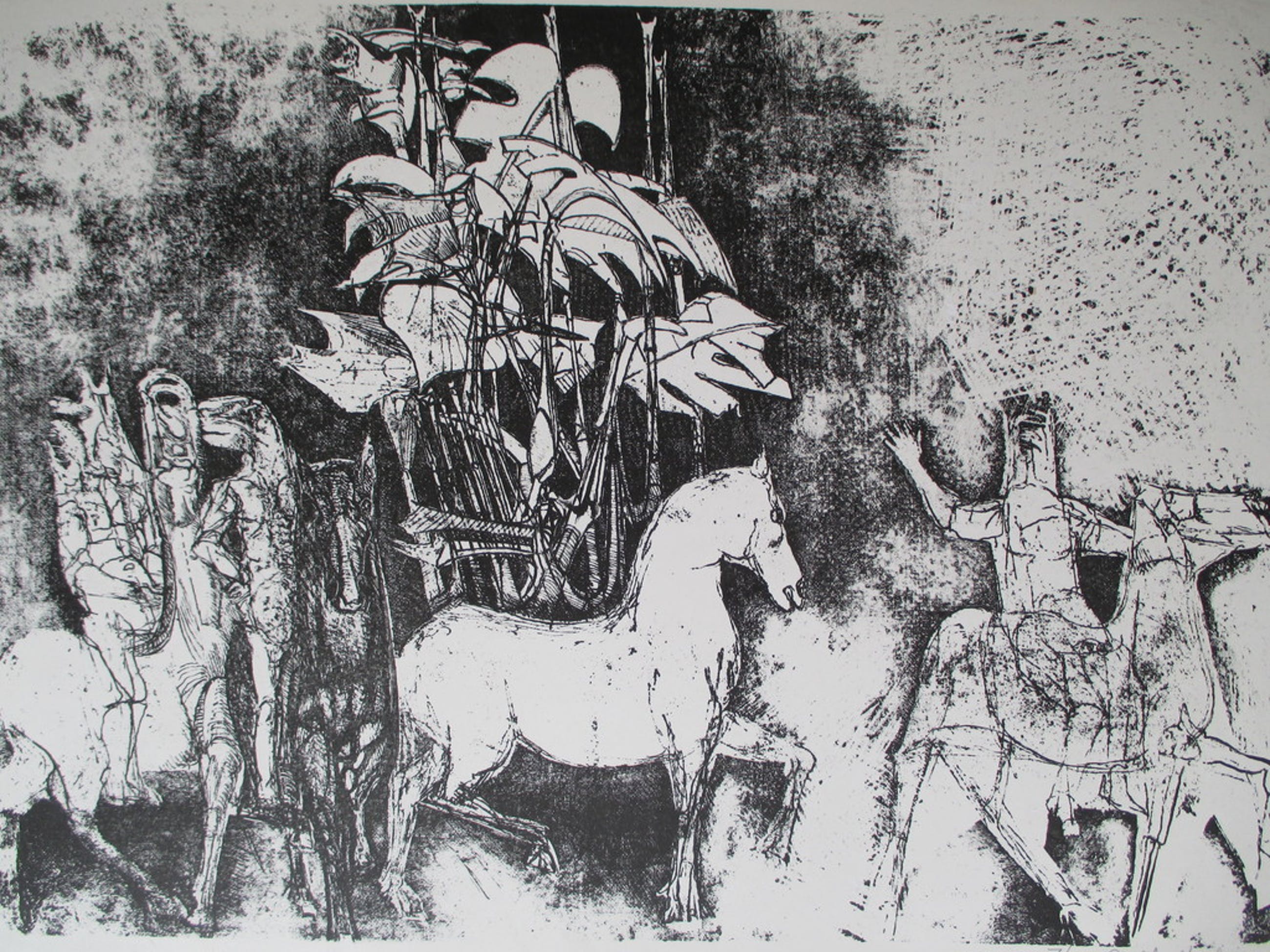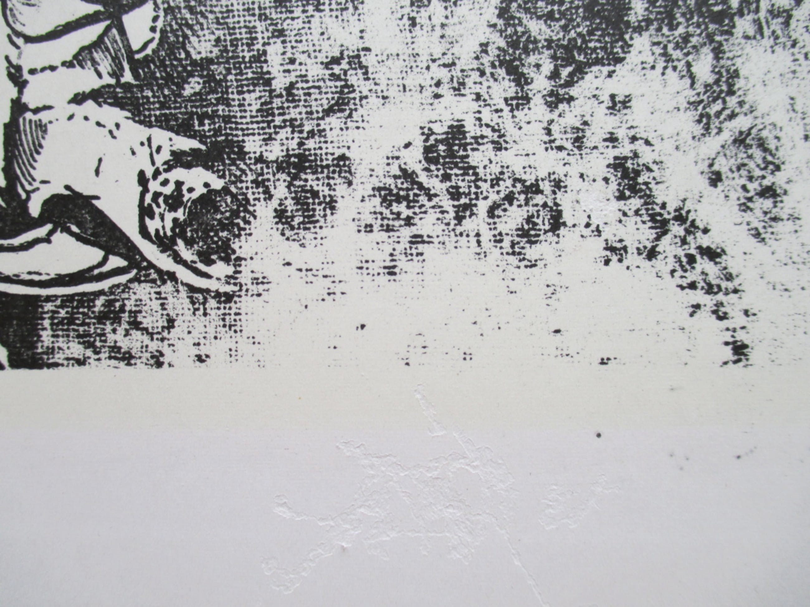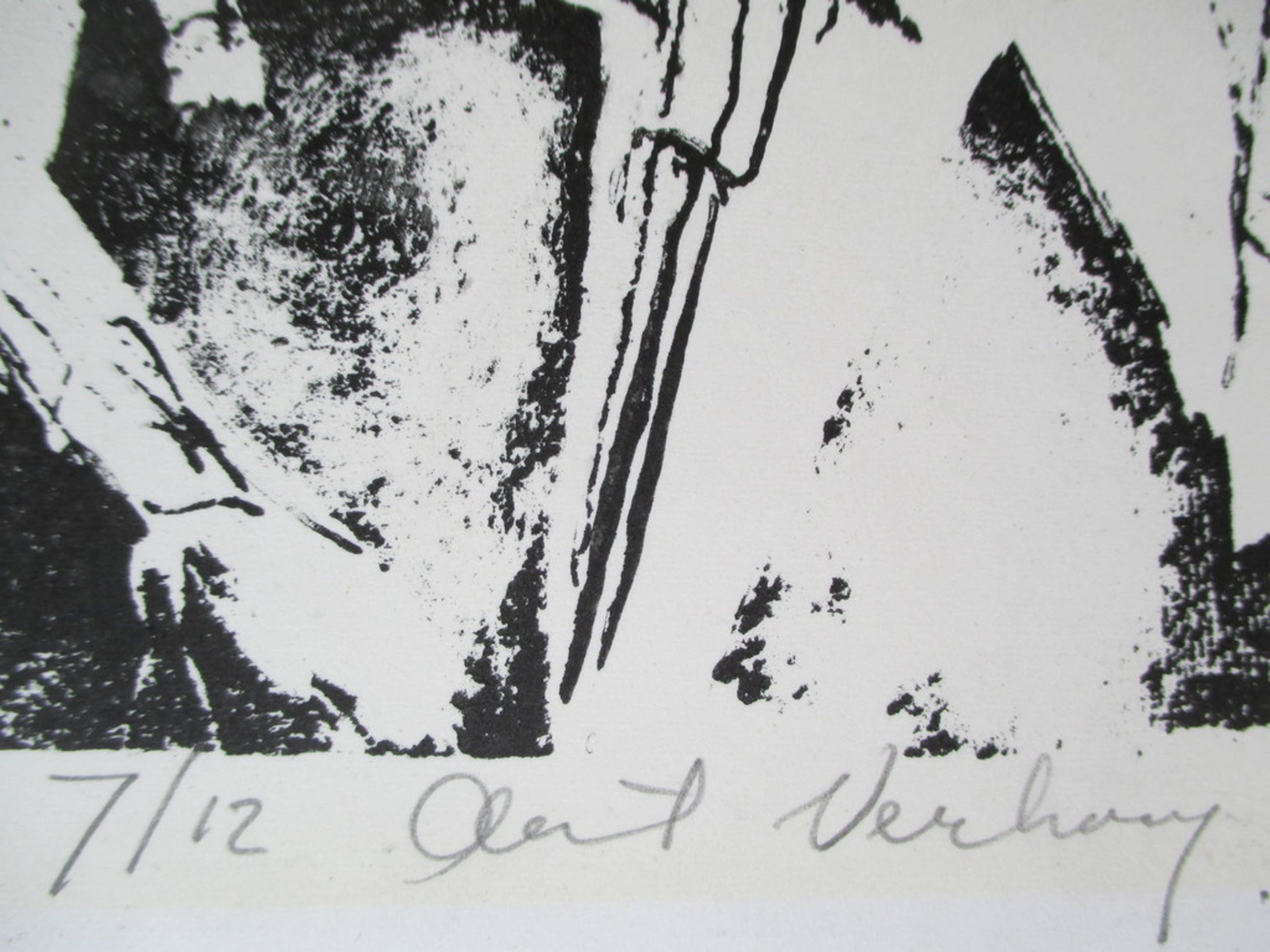 Grafiek op glad papier van Aat Verhoog, genummerd 7/12 en gesigneerd in potlood. Het blad is op karton geplakt. Afmeting karton ca 63x48, beeld 55,5x40 cm. Het beeld is licht vergeeld door een eerdere inlijsting, zie foto's. In de marge is er op een aantal plekken wat lichte schade aan het papier, zie foto 4, dit is niet in het beeld.