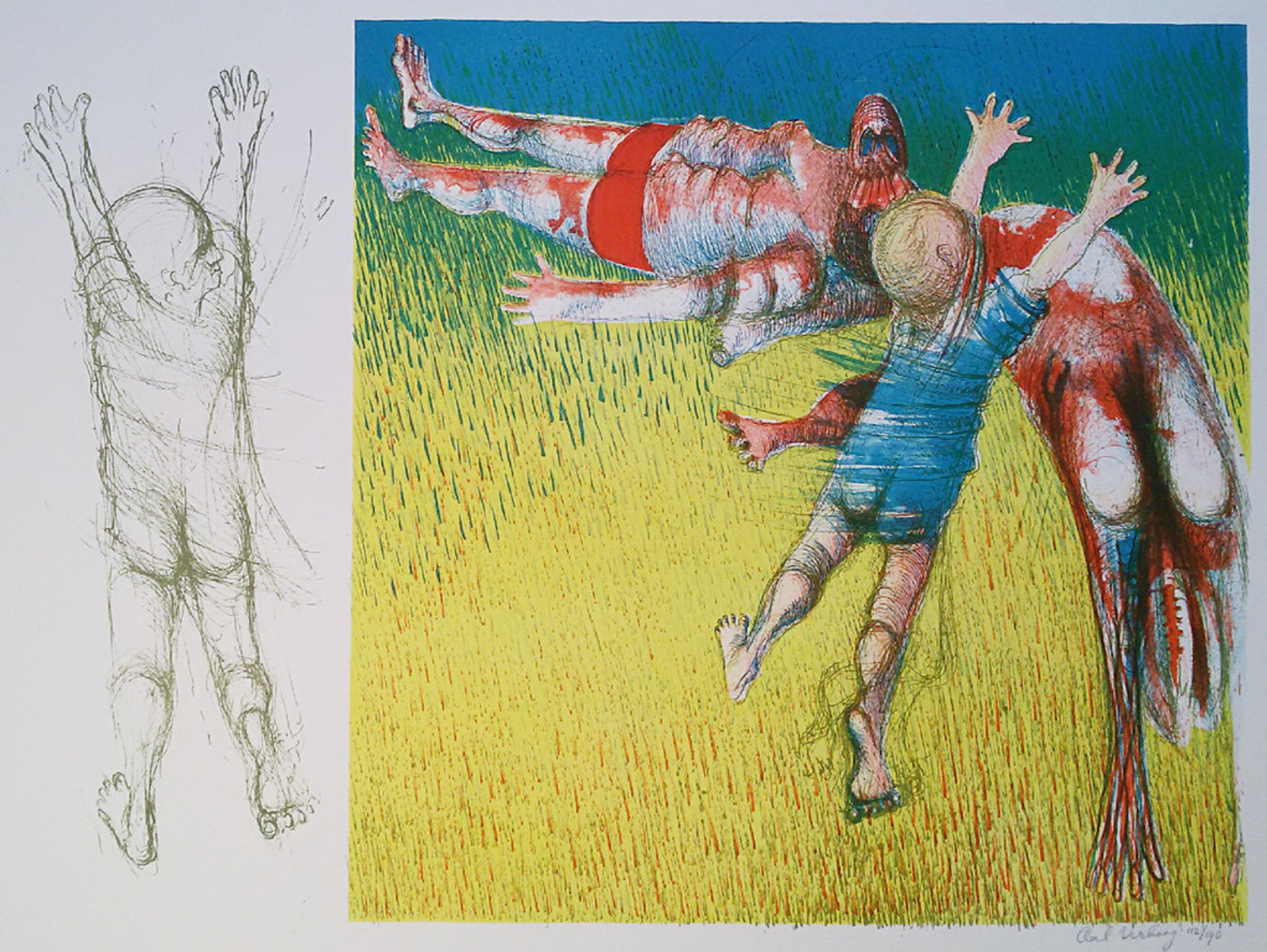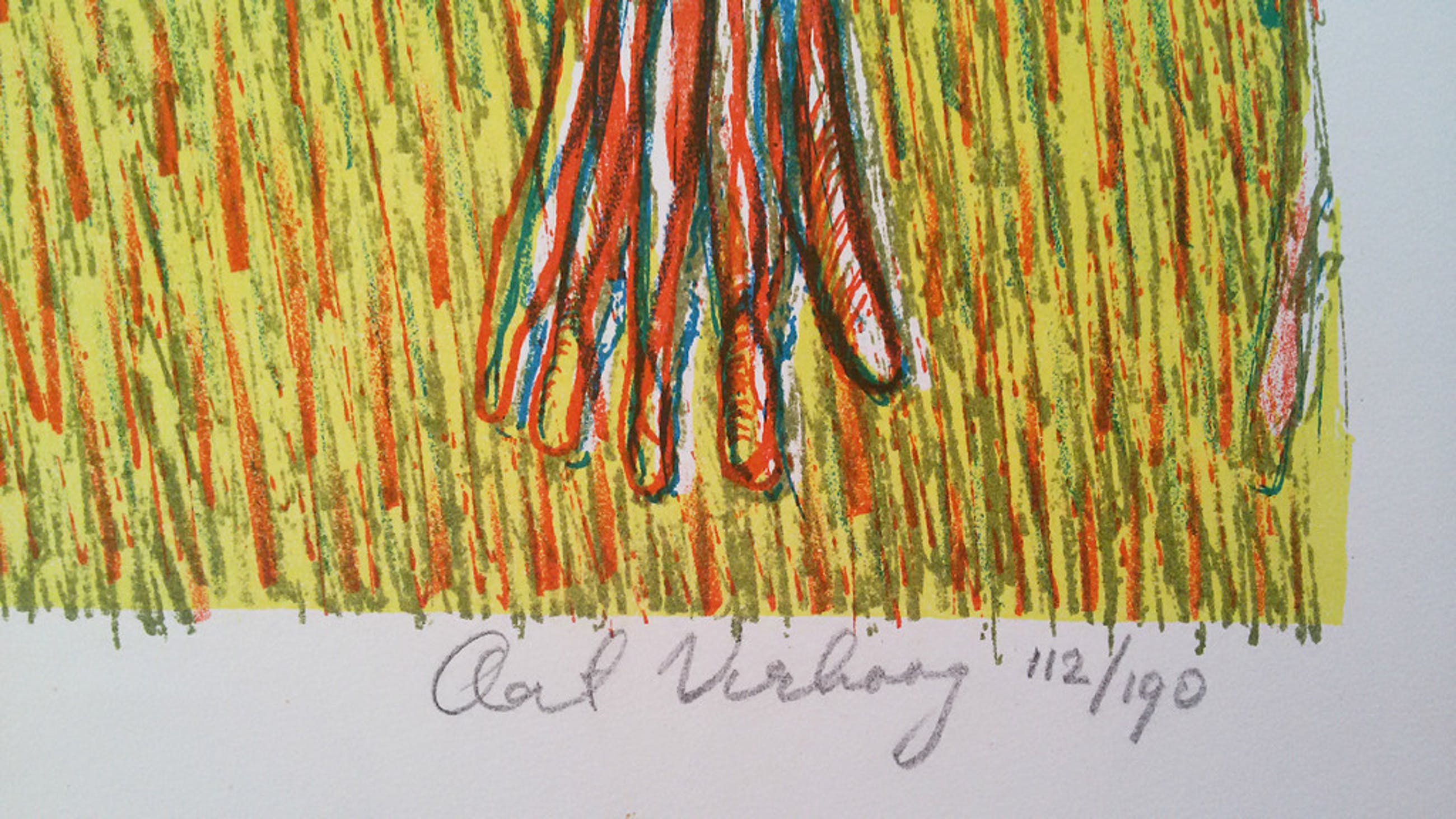 Grote litho uit 1965 van Aat Verhoog op geschept papier, uitgegeven door Prent 190. Met potlood gesigneerd en genummerd (112/190), met blindstempel van Prent 190. In zeer goede conditie; beeld is uitstekend, maar wat kleine kreukjes in de witte marge (goed ingelijst met passe-partout niks meer van te zien).