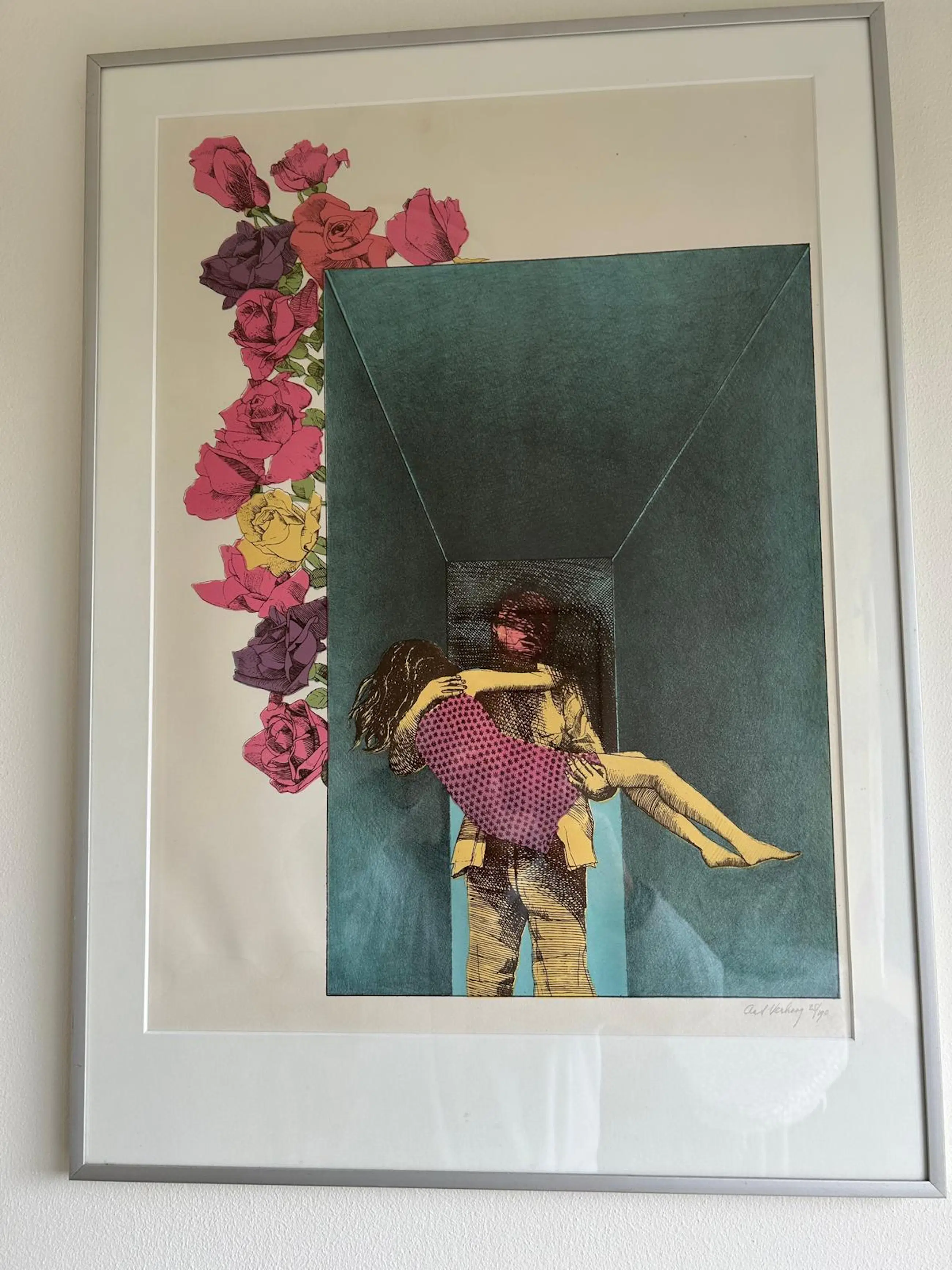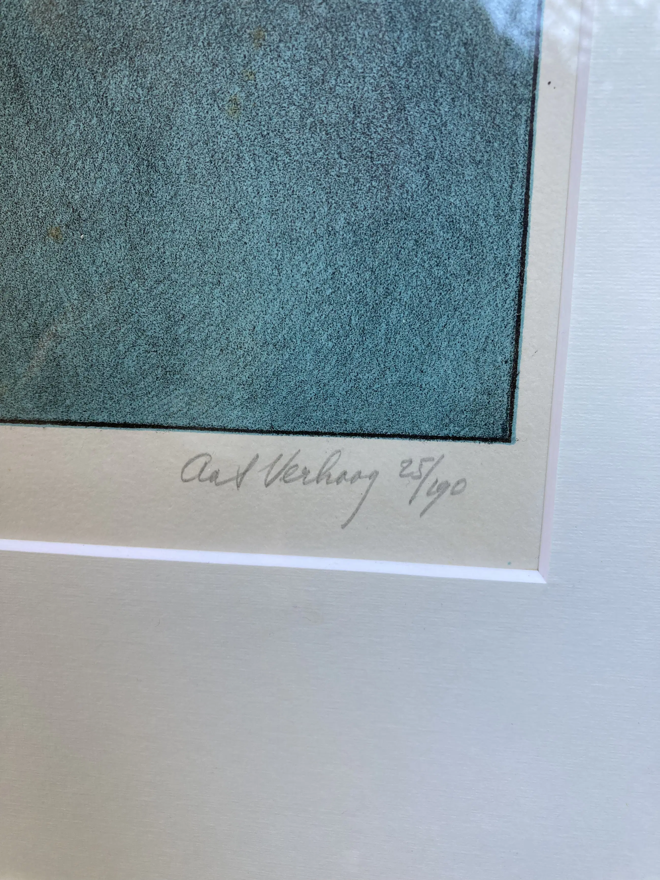 Prachtige ingelijste kleurenlitho op geschept papier van Aat Verhoog (1934). Het kunstwerk is voorzien van een lijst met de afmetingen 72 x 51 cm. De litho zelf meet 66 x 51 cm. Een uniek en sfeervol kunstwerk voor aan de muur.
