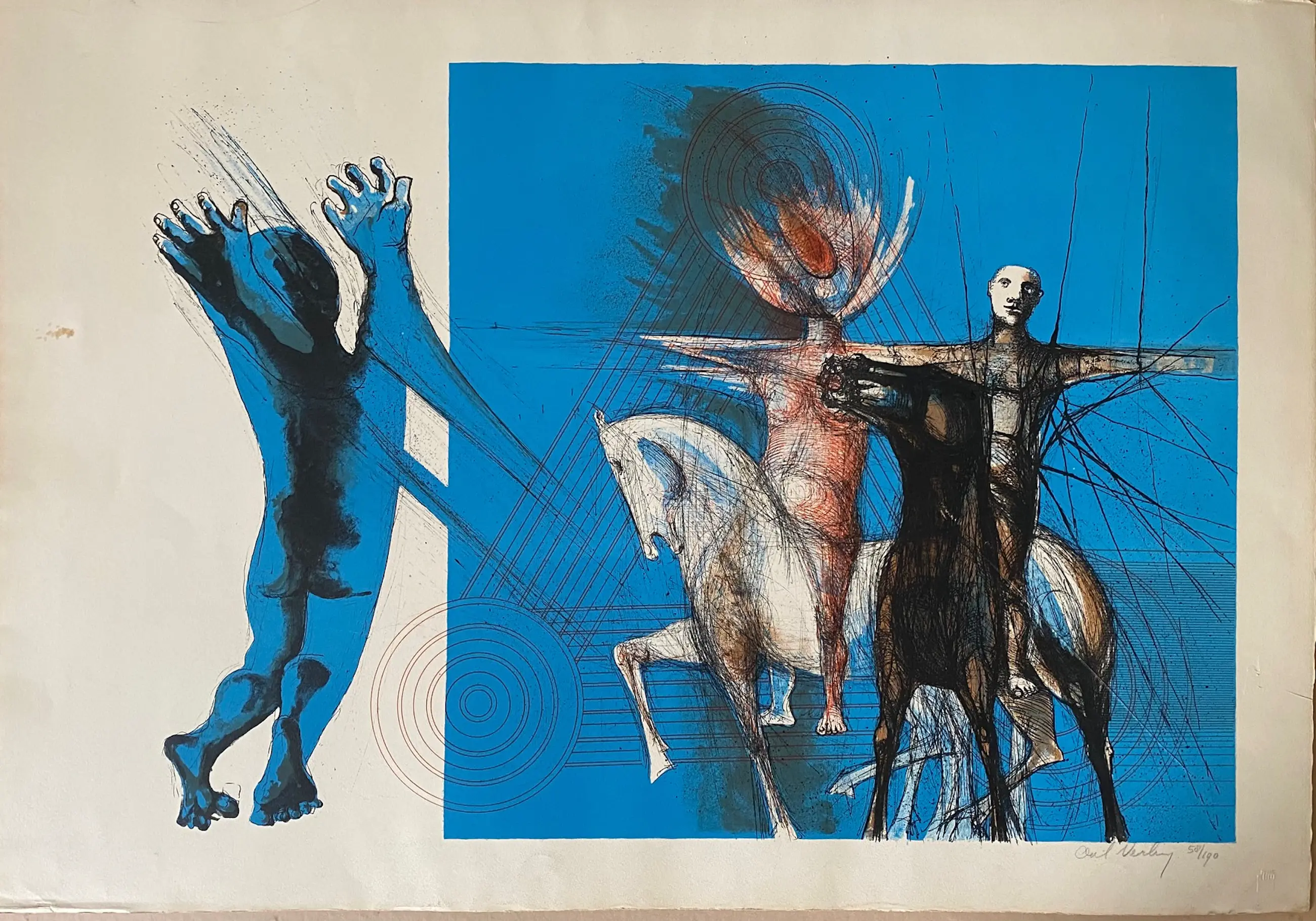 Litho van Aat Verhoog, getiteld 'de ruiters van de tijd' en genummerd (58/190) + stempel in relief. Uit 1965. Ook opgenomen in collectie van het Centraal Museum in Utrecht. Kleine vlek aan linkerzijde (zie foto's).