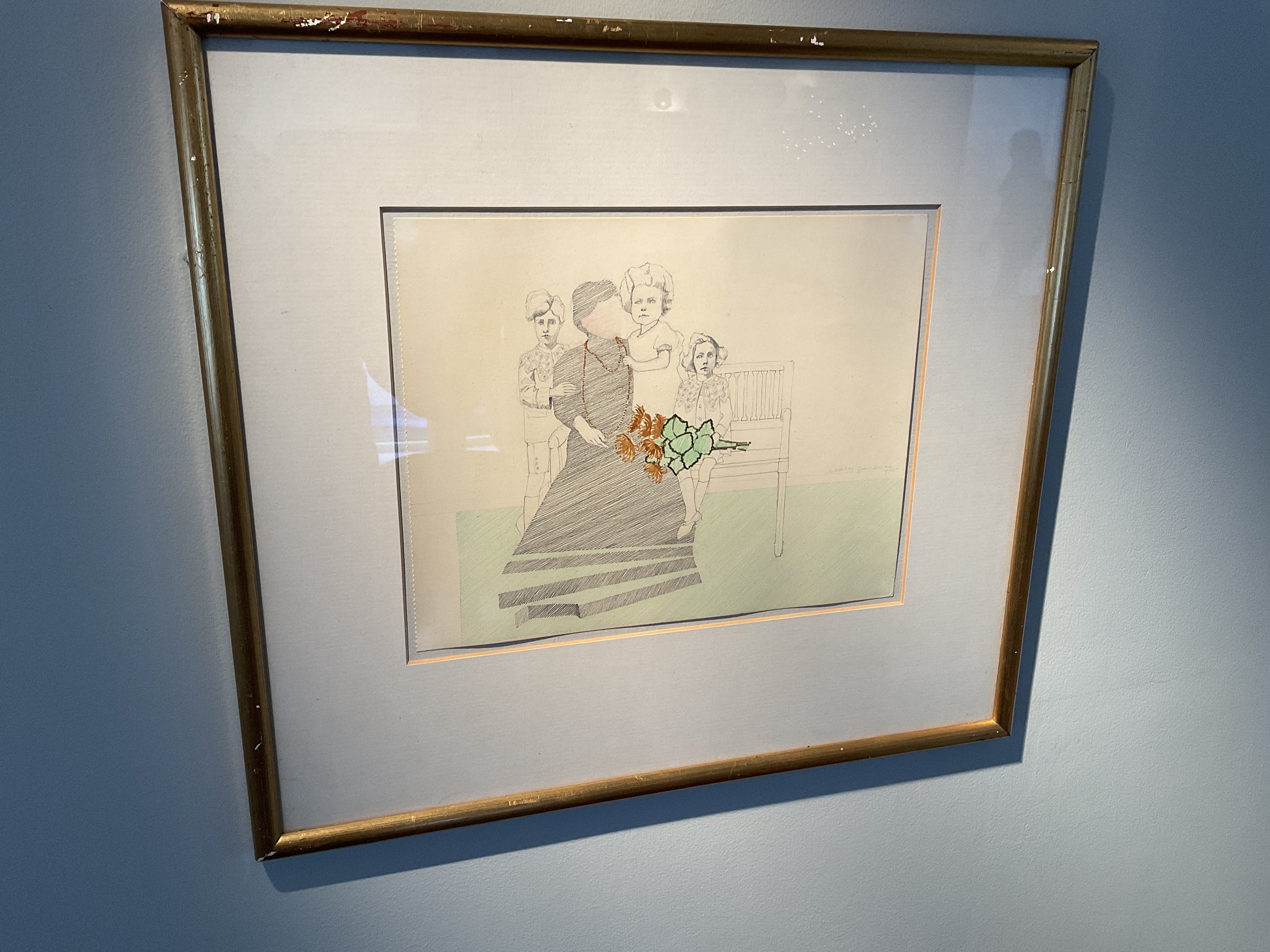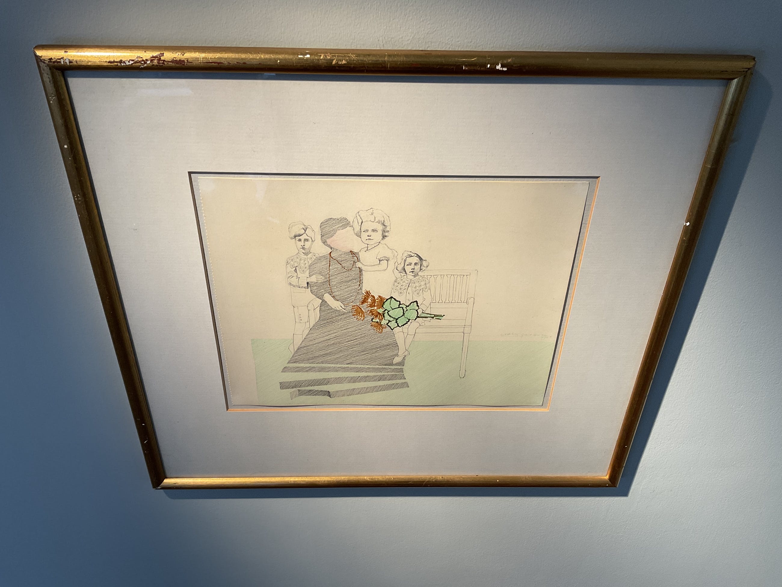 Het werk zit in een goudkleurige lijst met passé patrouille en glas