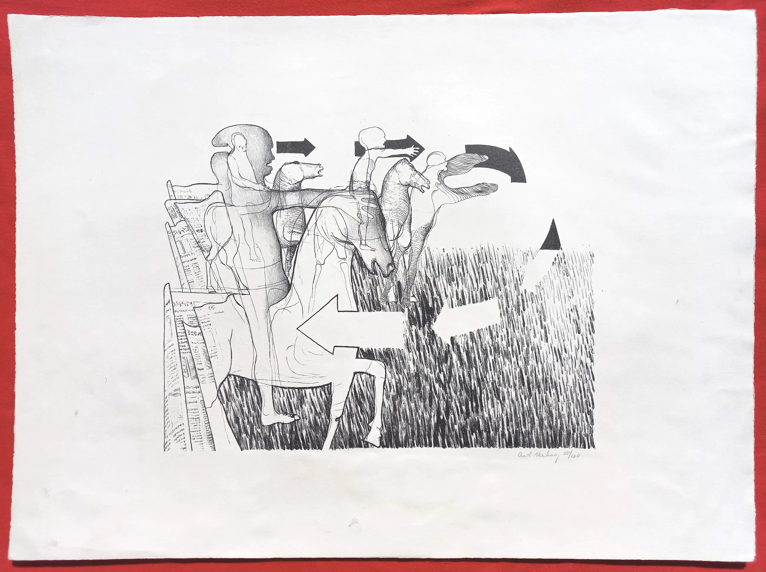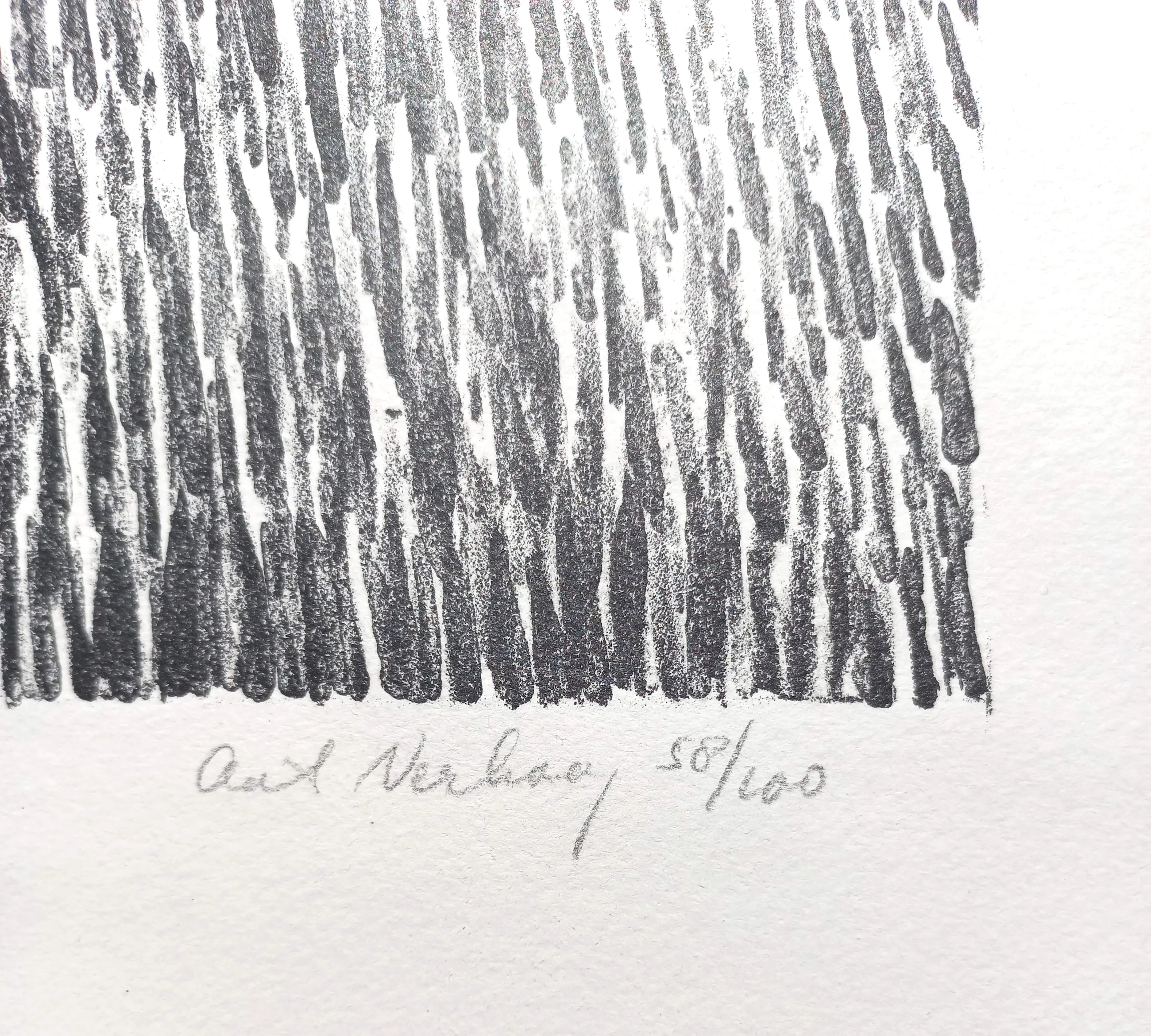 Typerend werk van Aat Verhoog uit de jaren 70. Litho op geschept papier, met potlood gesigneerd en genummerd (58/100). In goede conditie.
