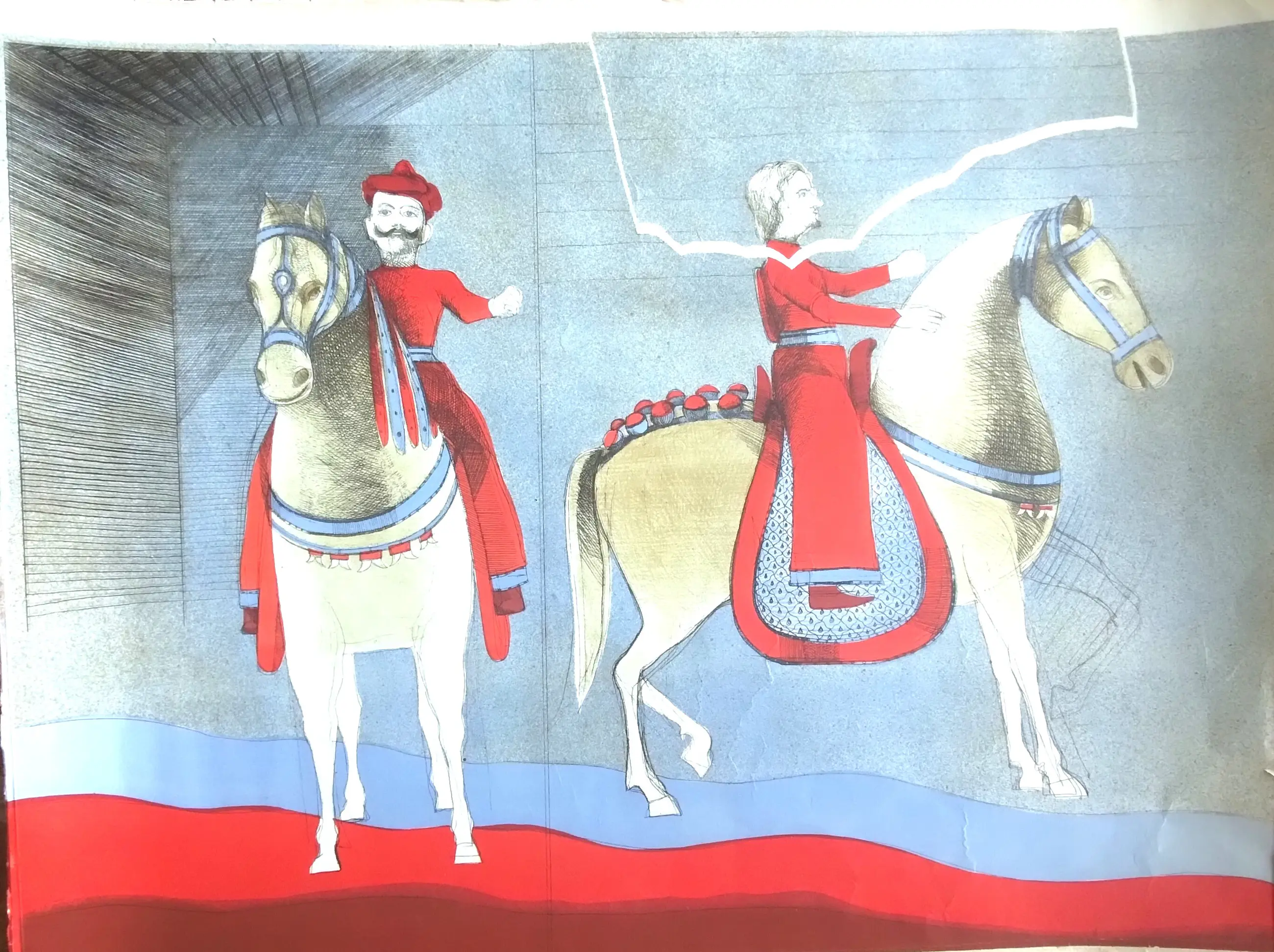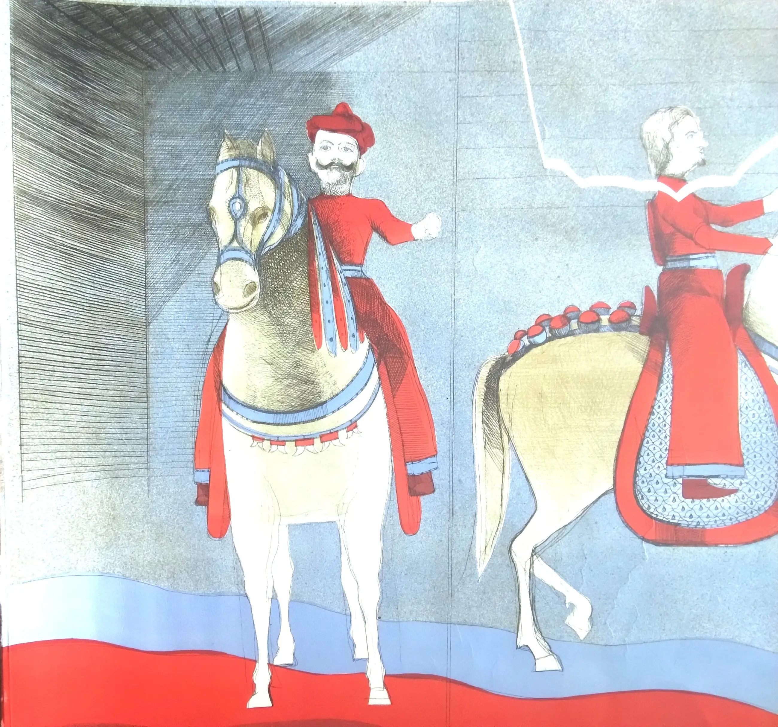 Kleurrijke zeefdruk van Aat Verhoog, Twee mannen te paard( waarvan 1 een zelfportret) Gesigneerd: linksonder