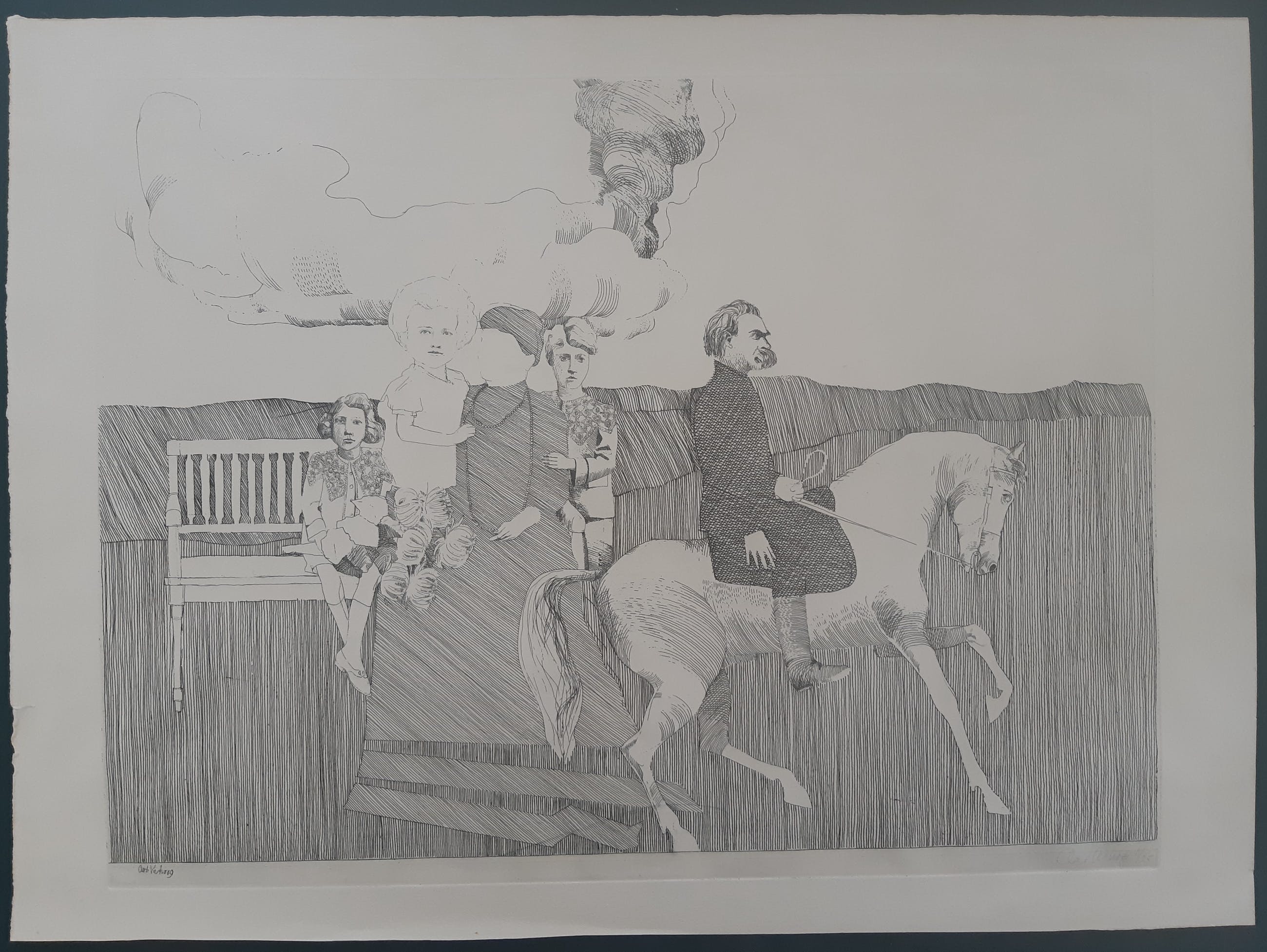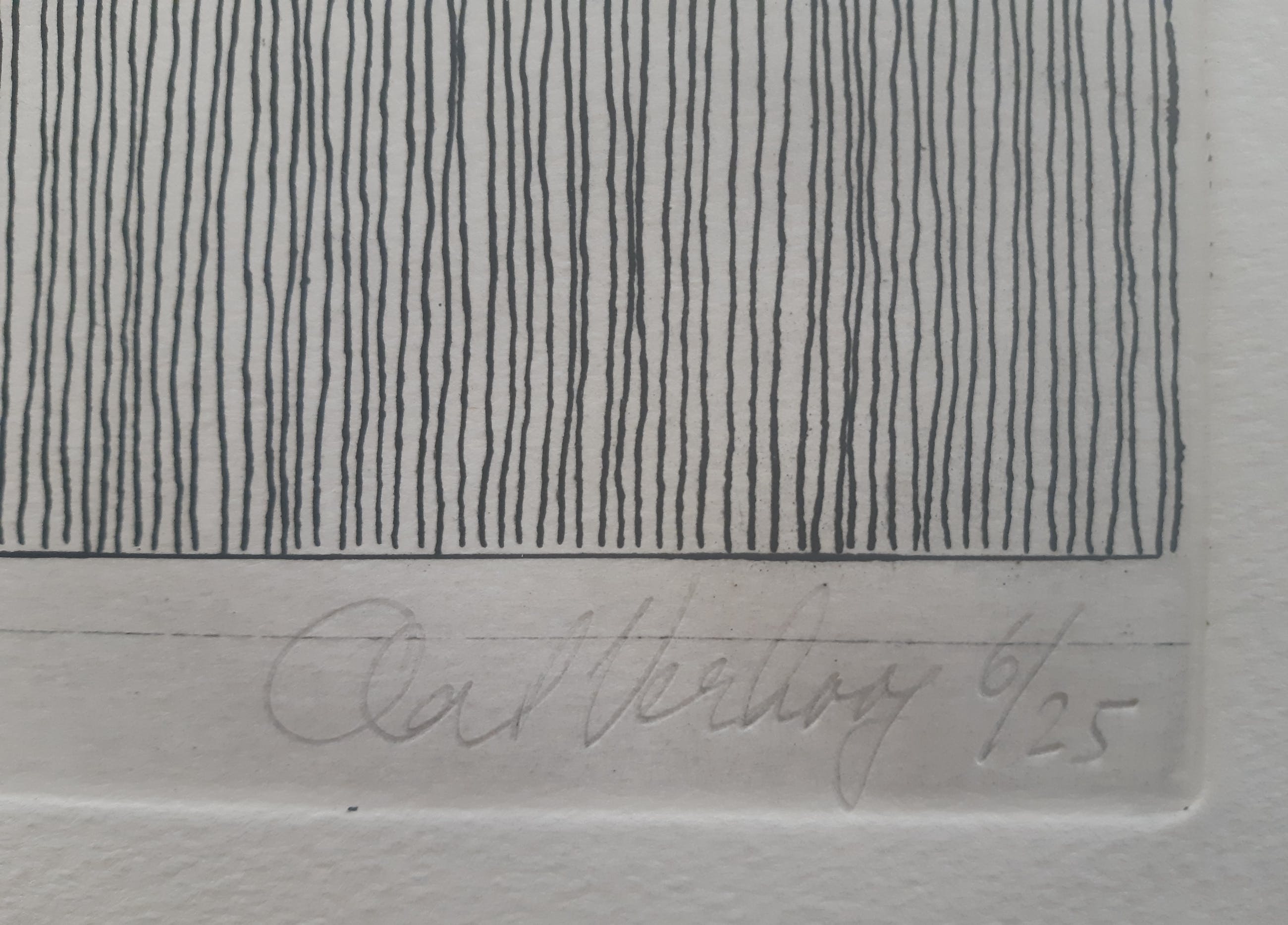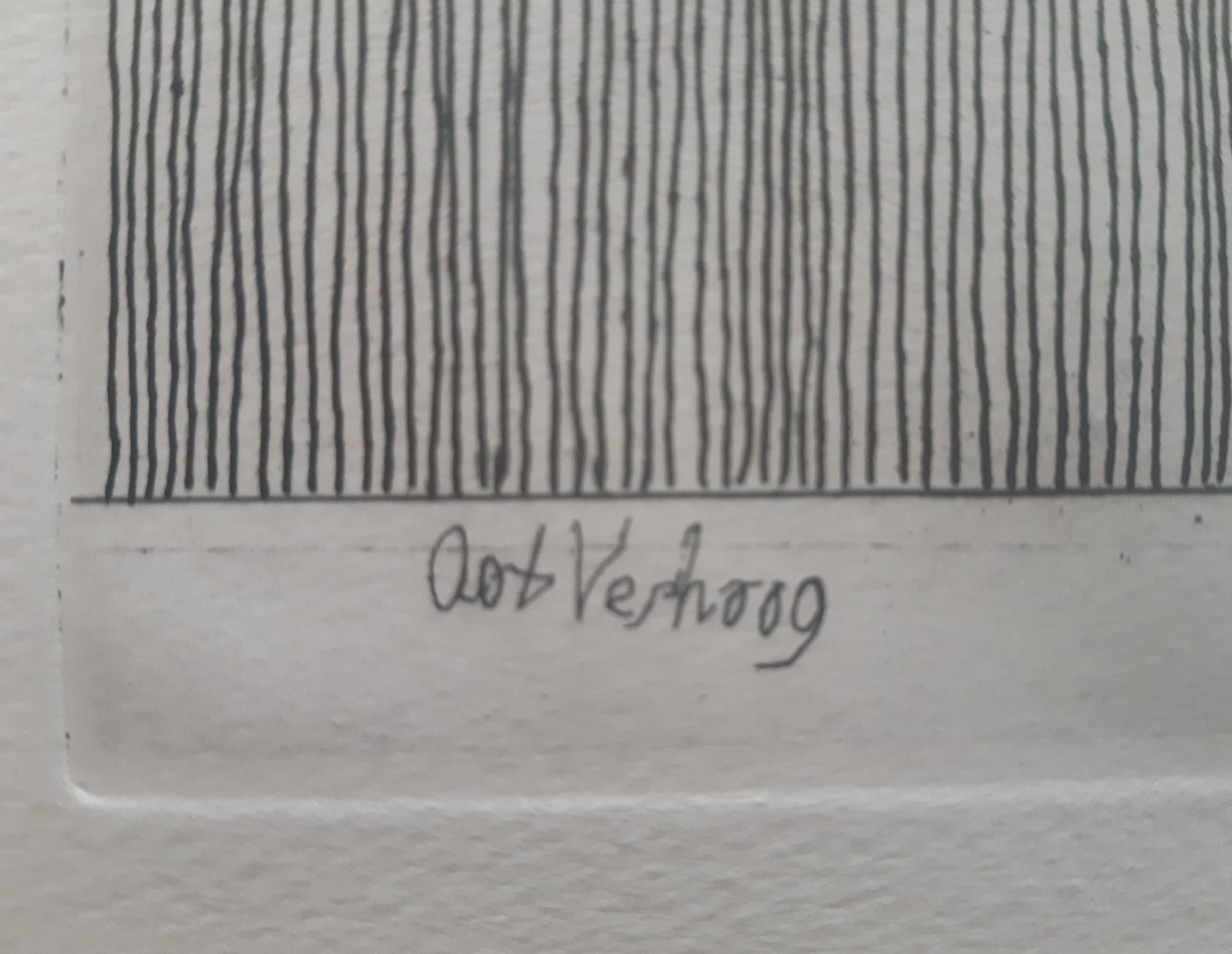Grote ets van Aat Verhoog. Zowel in de plaat als met potlood gesigneerd. Het beeld is 49 x 64 cm. De ets is nooit ingelijst geweest en in nieuwstaat, afgezien van scheurtje 1 cm in linkermarge (zie 2e foto).
