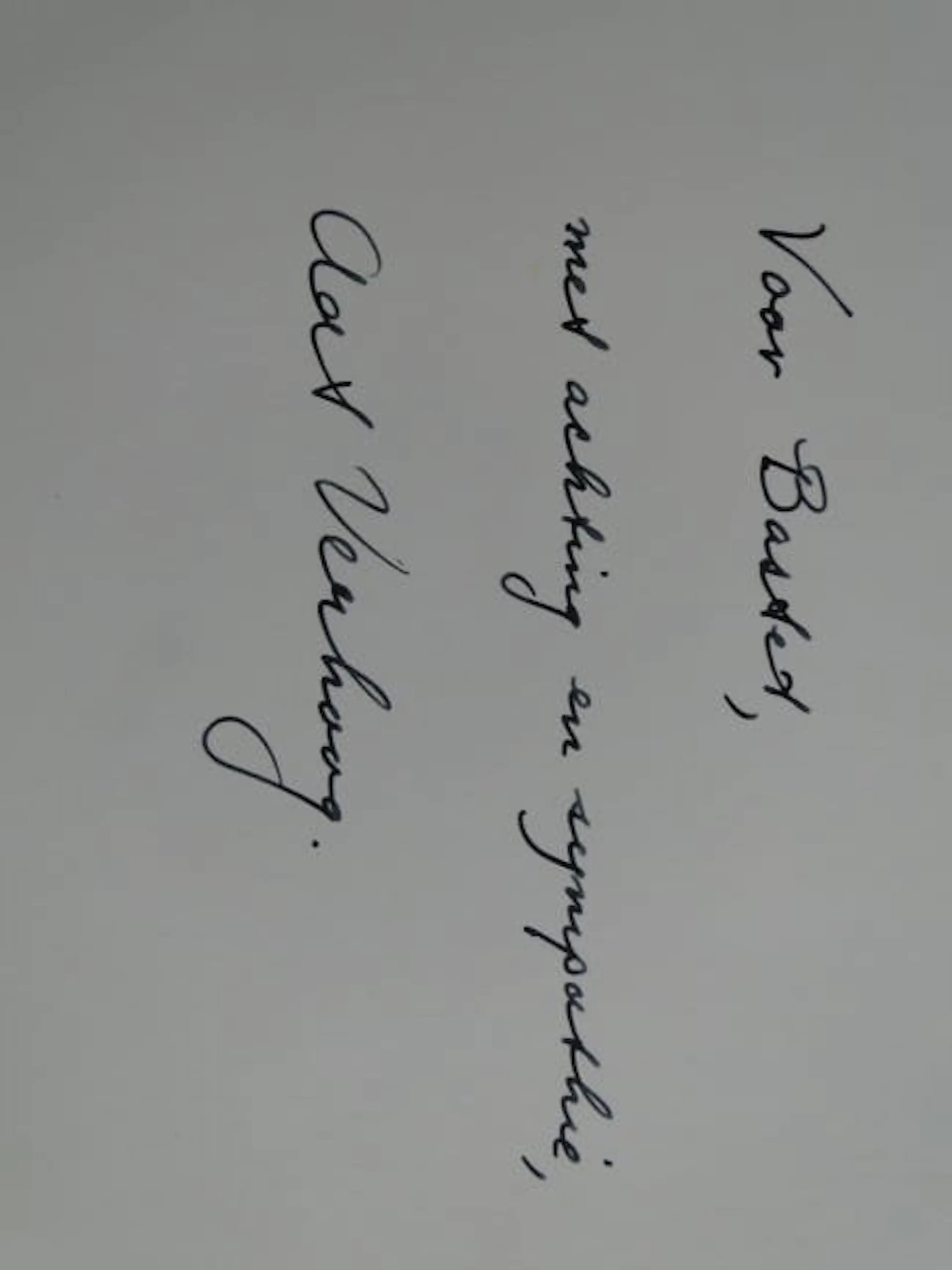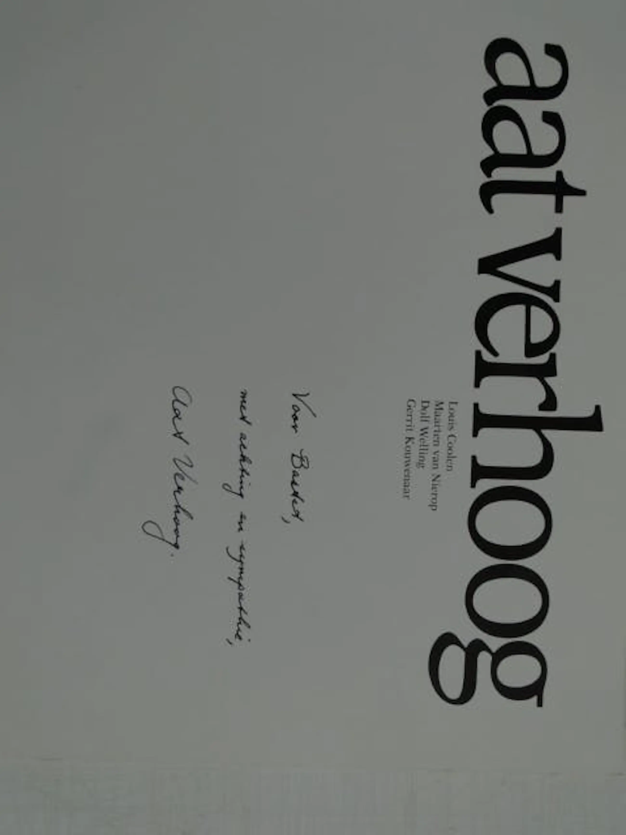 Fred Bastet en Aat Verhoog waren goede vrienden. De opdracht in het boek luidt: 'Voor Bastet. met achting en sympathie, Aat Verhoog.' Voorin is het ex libris van Bastet geplakt. Toegevoegd een brief van Verhoog aan Bastet, waarin hij Bastet bedankt voor de toezegging dat hij de tentoonstelling van Verhoog in Bergen op Zoom wil openen. 2 pagina's, met oorspronkelijke envelop. Toegevoegd een uitnodigingskaart voor de expositie in Museum Het Princessehof in Leeuwarden. in 1993. Leuke set.
