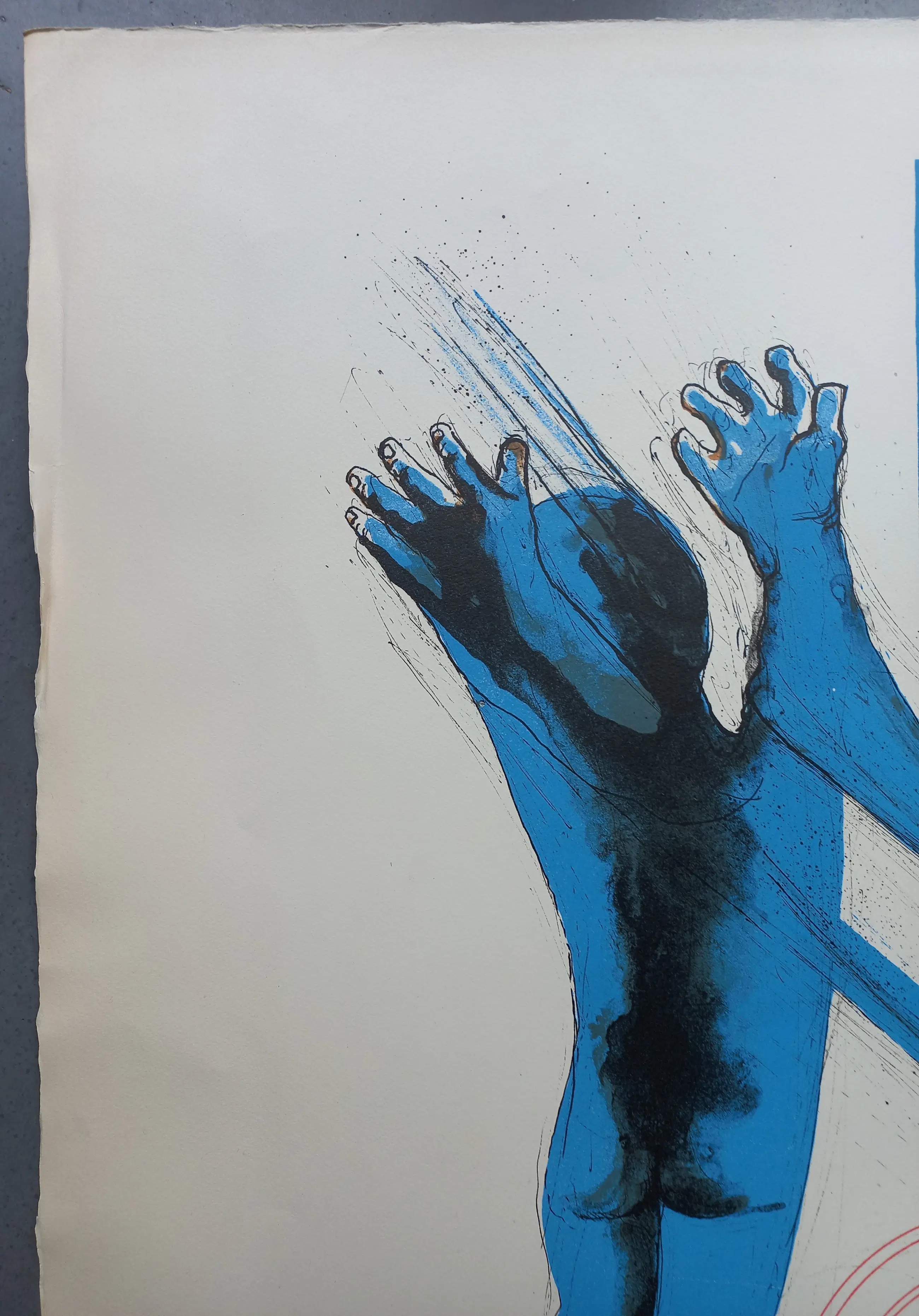 Aan de randen van het papier zitten vouwen, rechts zit een scheur in het papier van ca. 2.5 cm en een vlek (beide buiten beeld) In het beeld zitten 4 punaise gaatjes en is er een lichte kras van ca 20 cm zichtbaar.