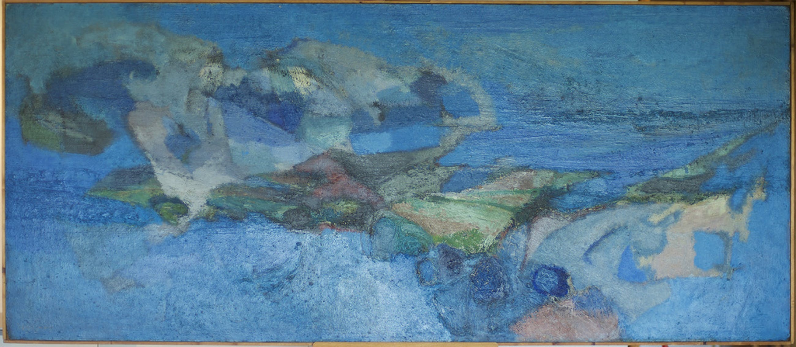 Olieverf op board, 1962, afmeting 216 x 94 cm. Het werk is in 1963 van de kunstenaar zelf gekocht. Het werk heeft door het expressieve kleurgebruik en omvang een mooie uitstraling in de ruimte. Het is links onder gesigneerd met jaartal. De lijst is origineel door Ab Jongmans aangebracht.