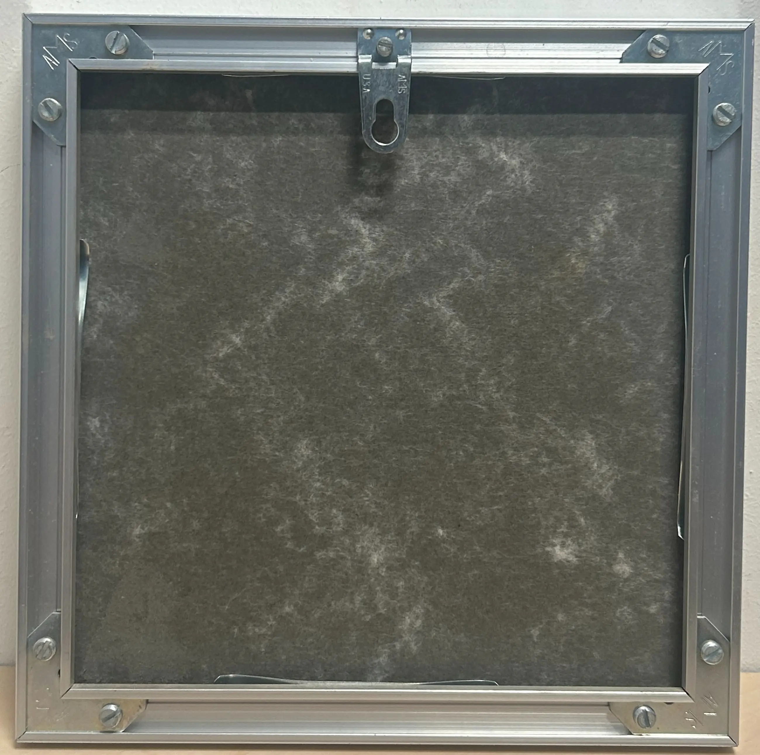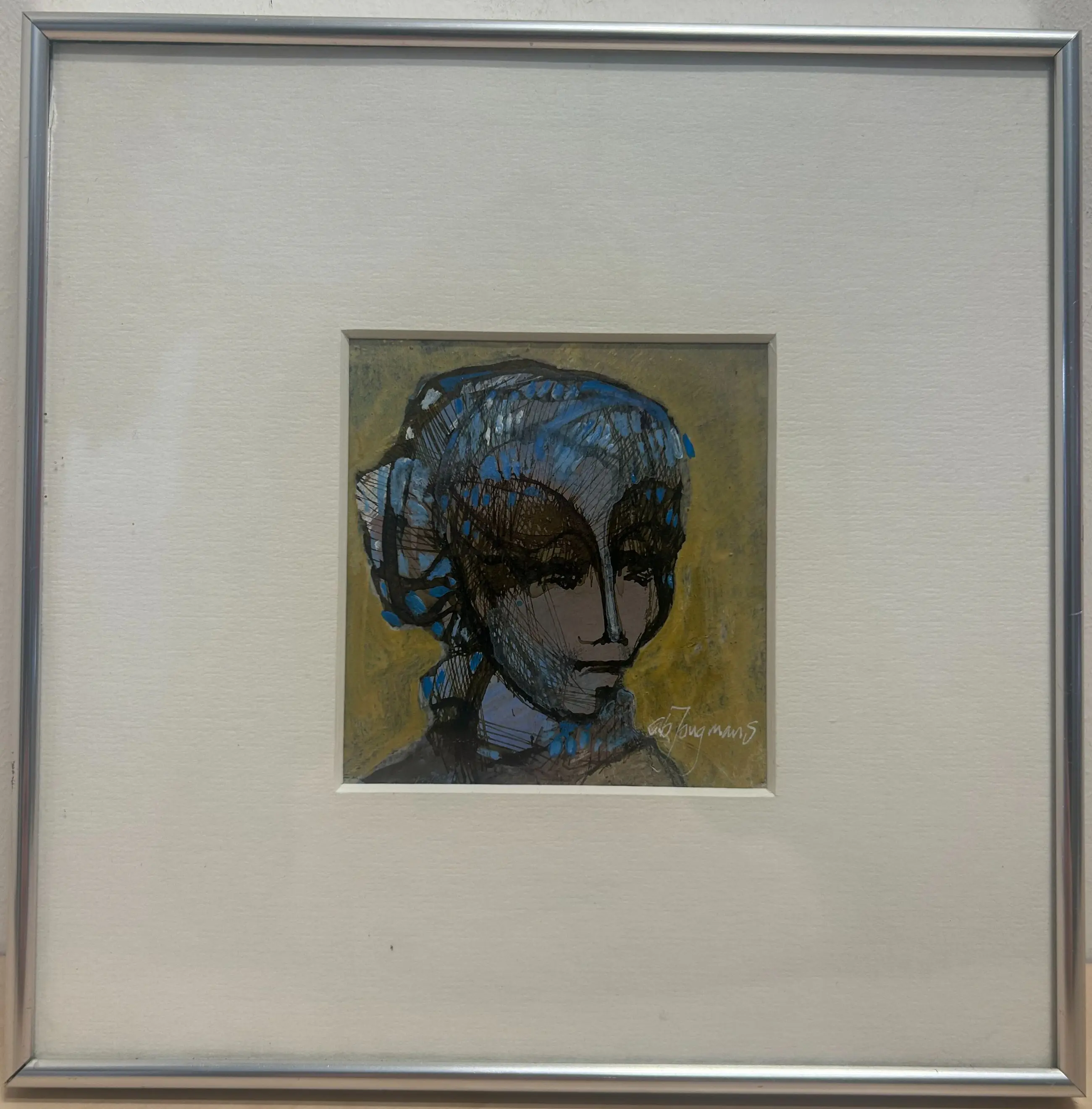Het kunstwerk is geplaatst in een zilverkleurige aluminium lijst, voorzien van een passe-partout en achter glas, wat zorgt voor een verzorgde en eigentijdse presentatie. De lijst vertoont lichte, normale gebruikssporen.