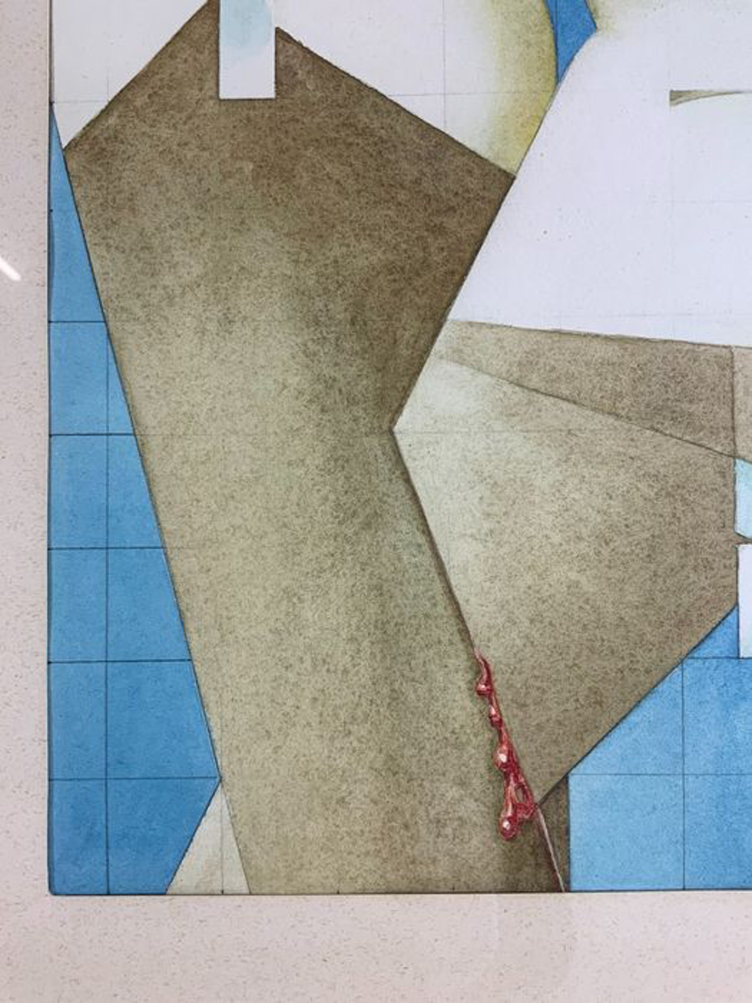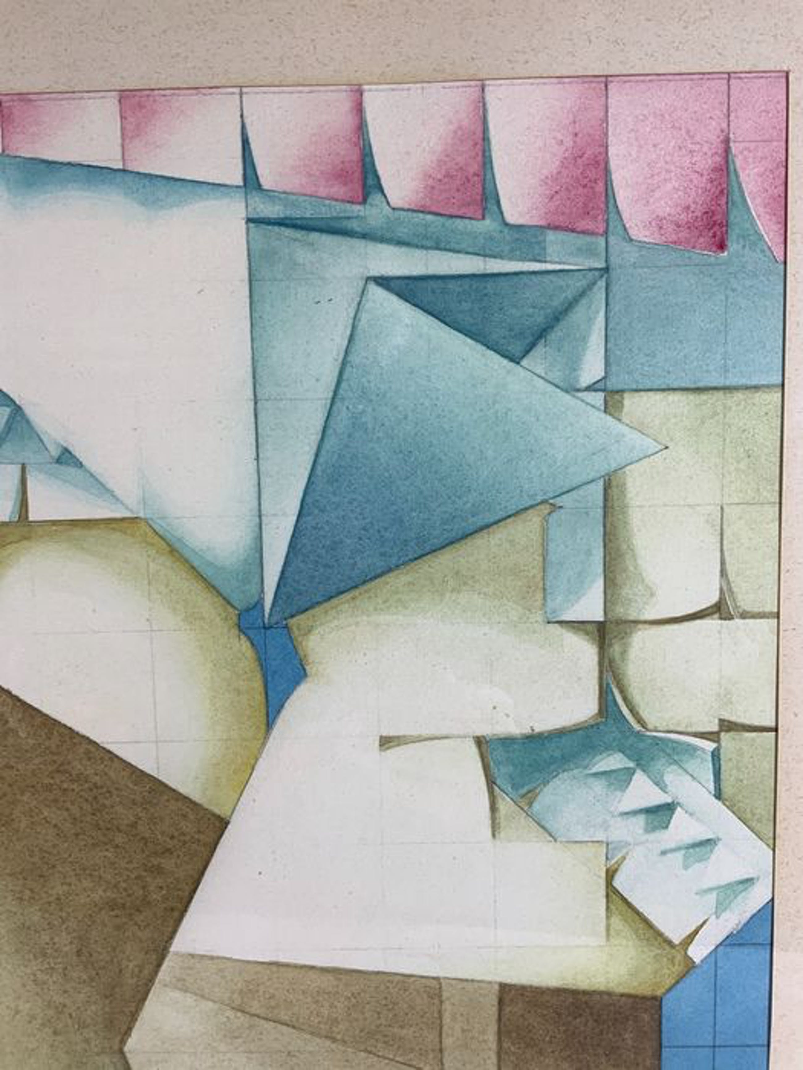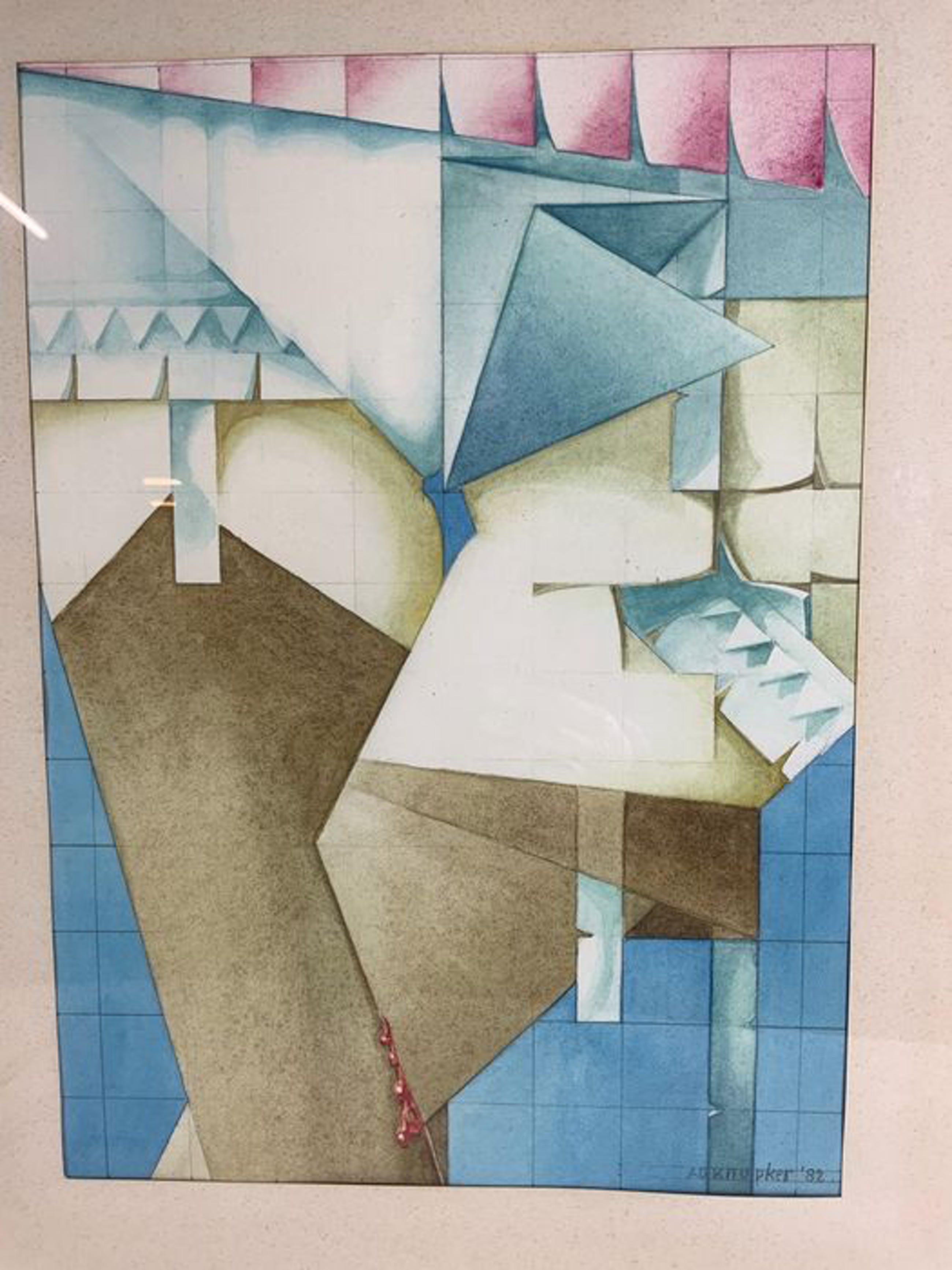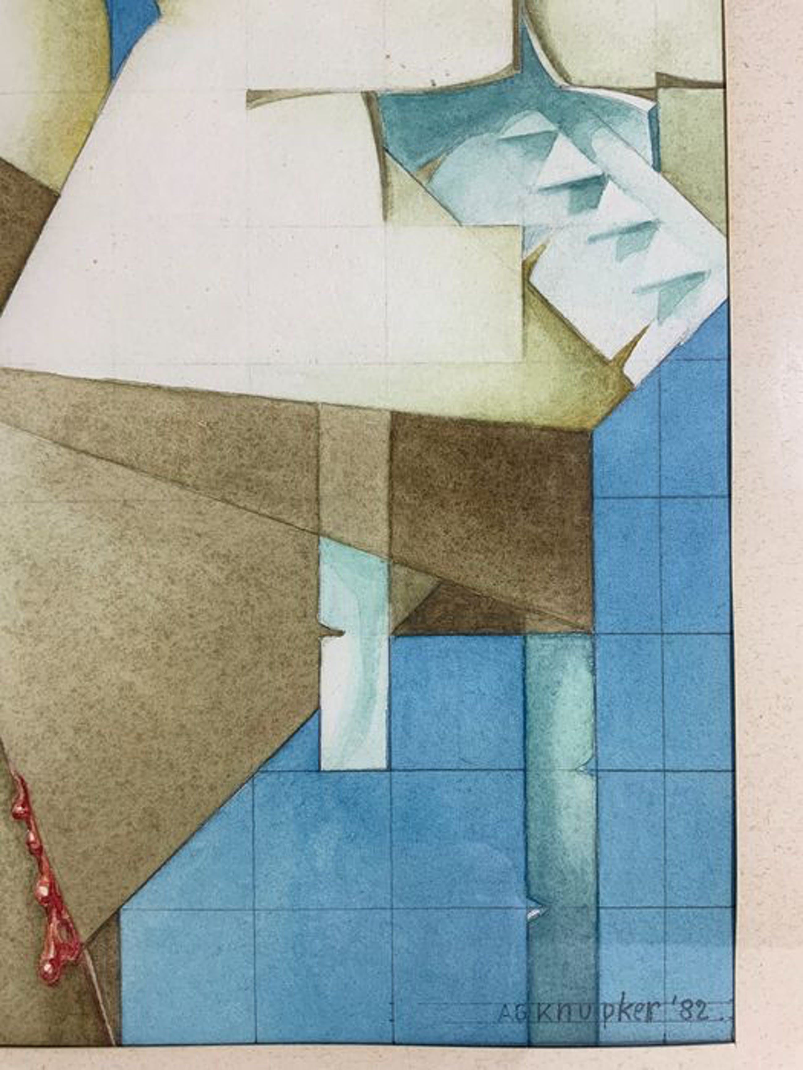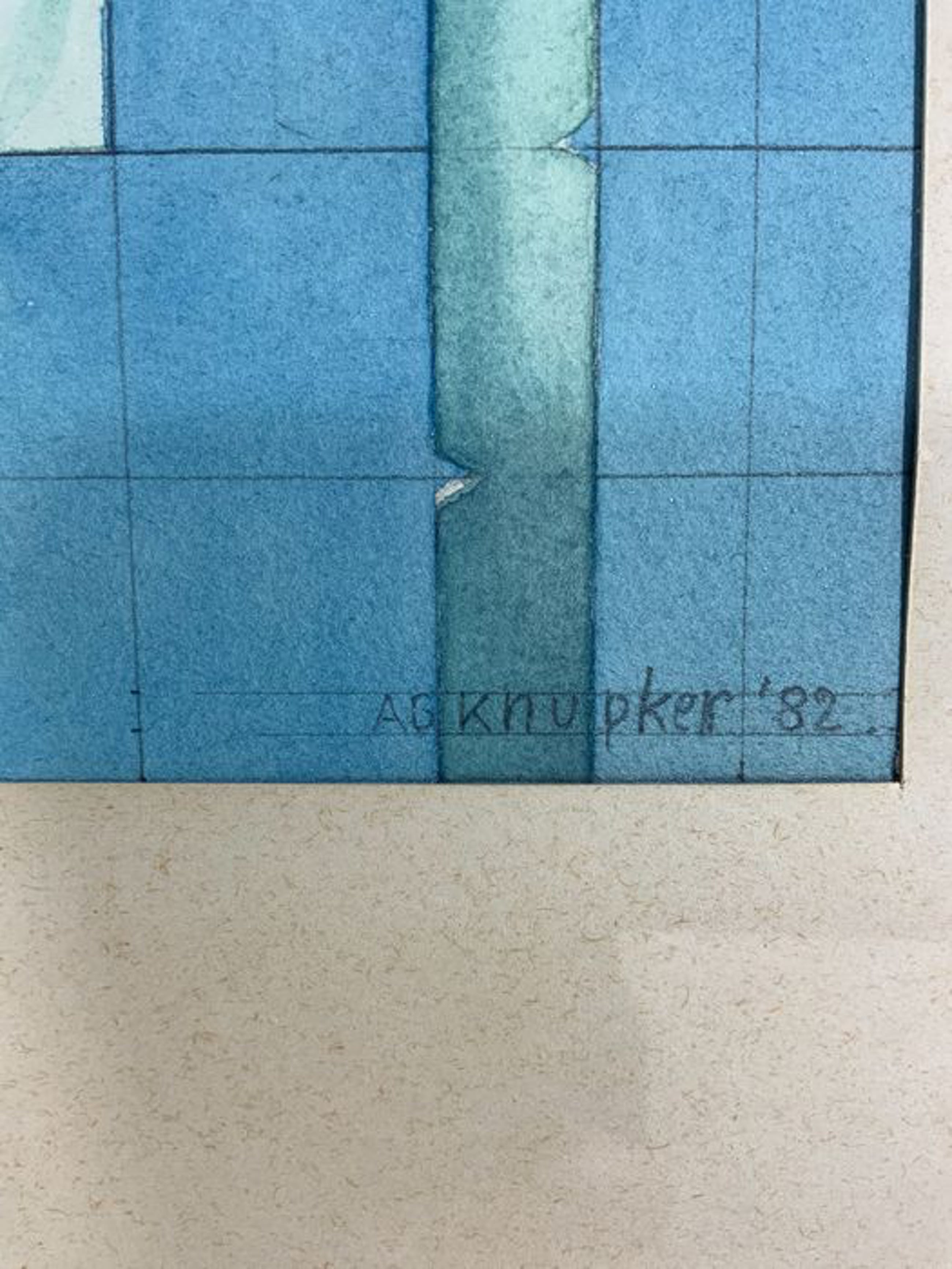Aangeboden: surrealistisch schilderij van A.G. Knupker. We zien eerst rasters gemaakt en daar over heen is het schilderij ingevuld.