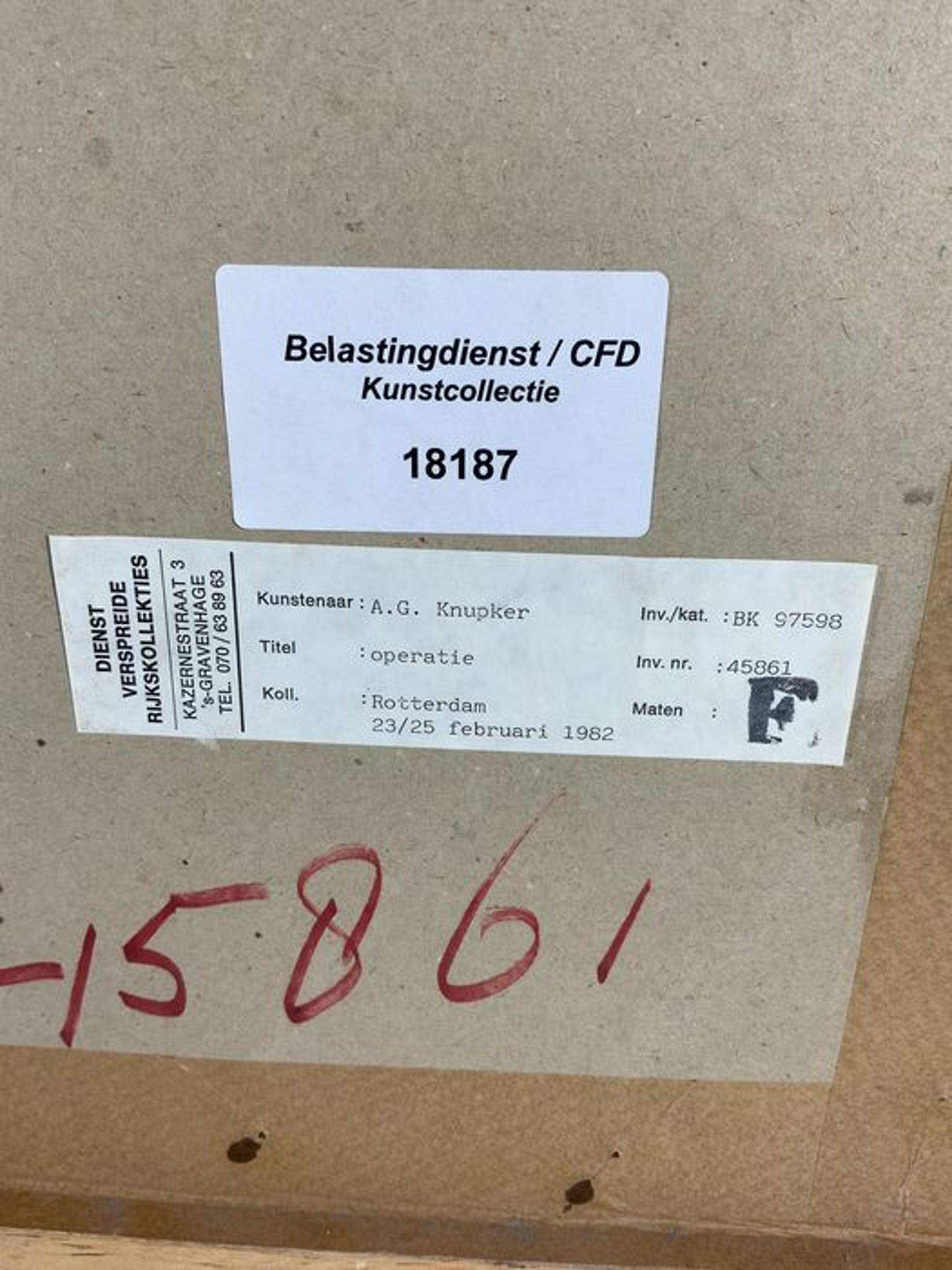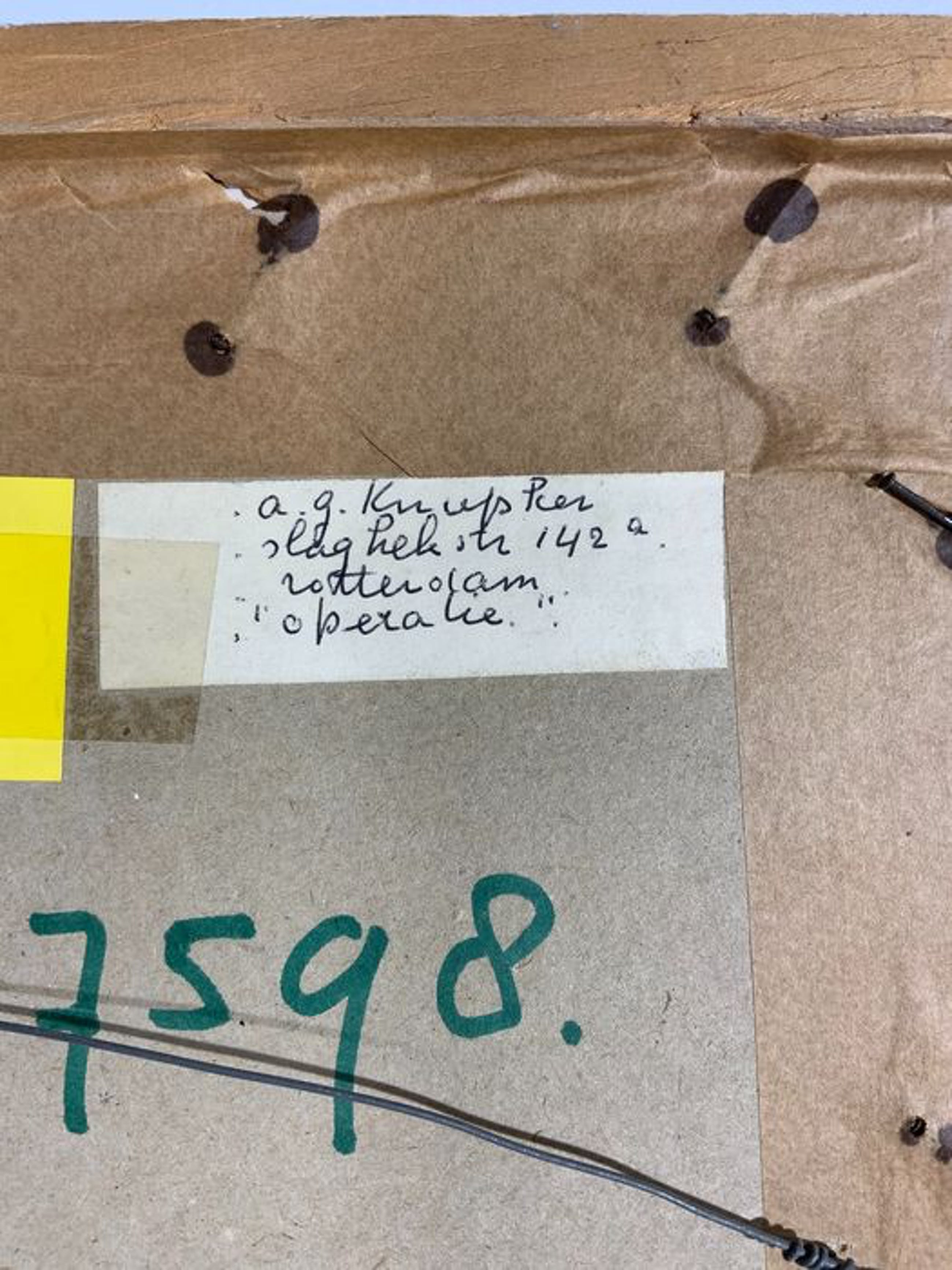 Over de kunstenaar: Albertus Gerardus (Ab) Knupker, Rotterdam 1927 Woonde en werkte in Den Haag en Rotterdam. Student aan de Academie voor Beeldende Kunsten in Rotterdam. Geschilderde portretten, landschappen, stillevens en figuren in een surrealistische stijl.