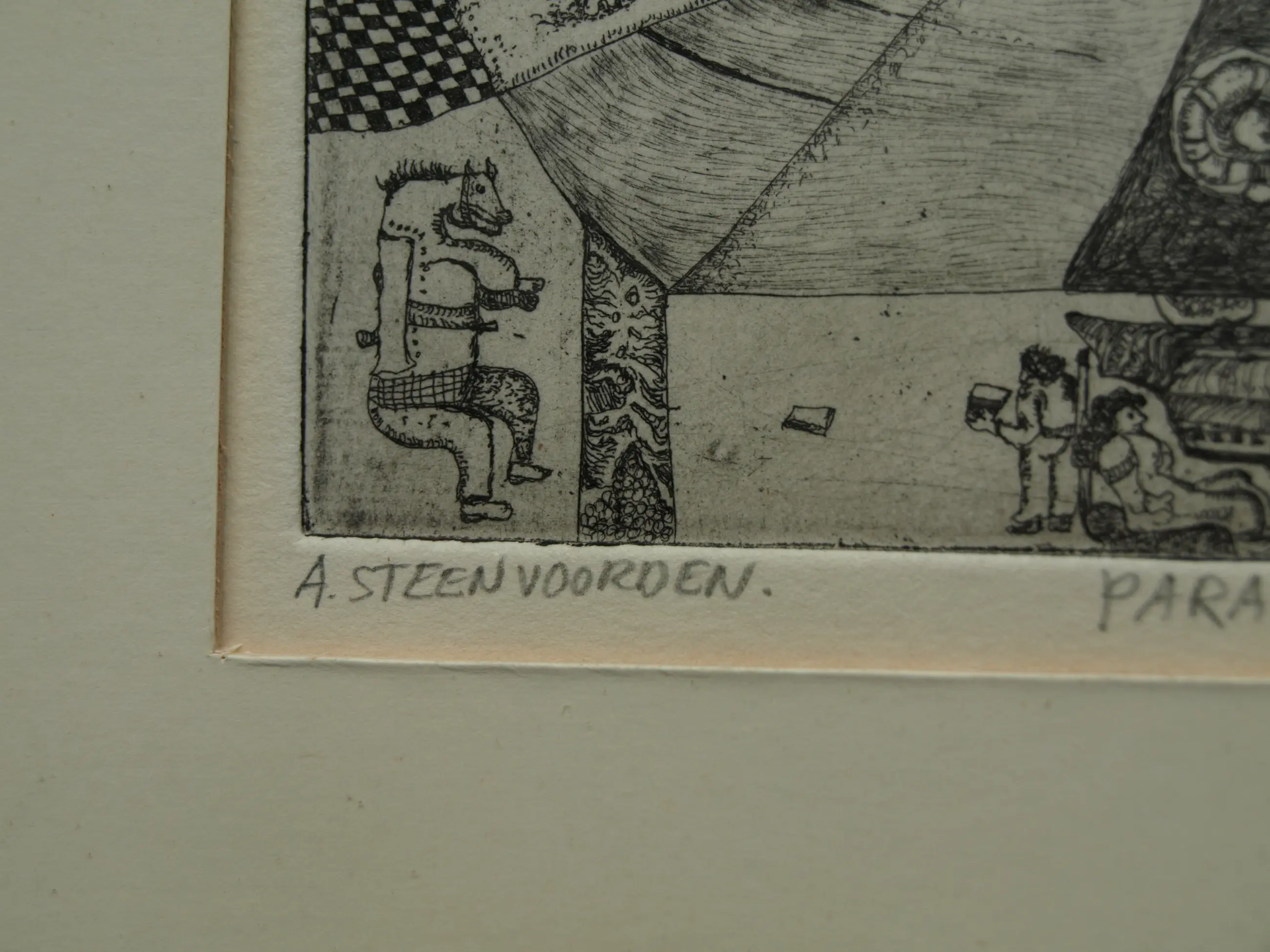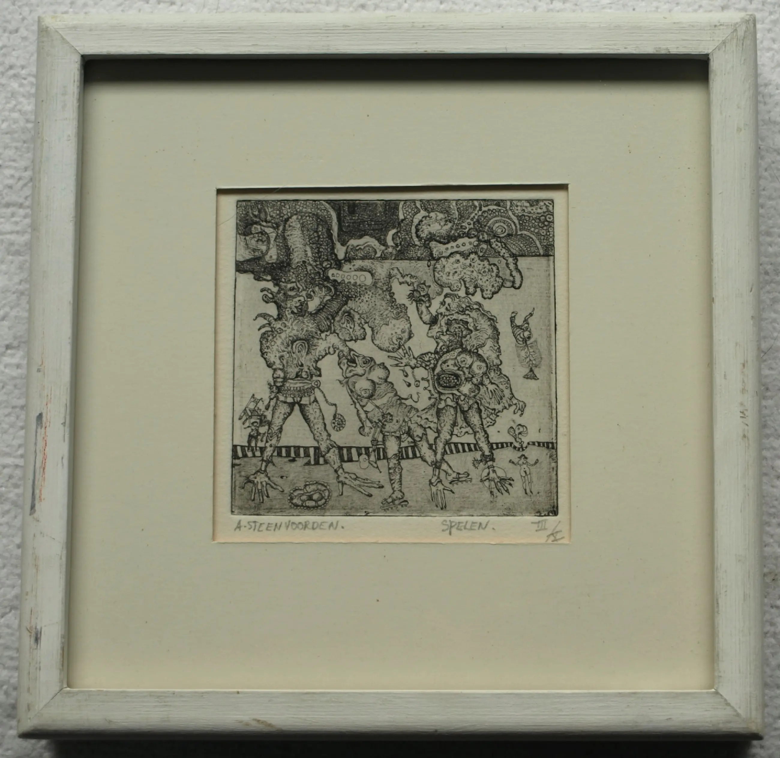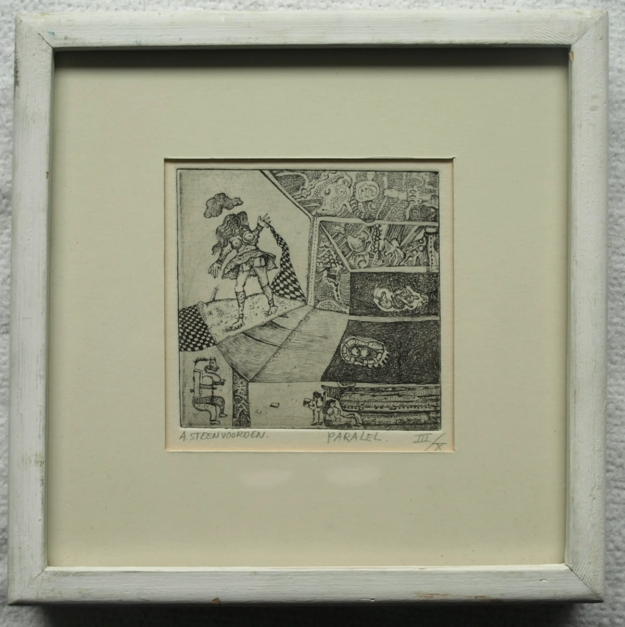 Informatie over de kunstenaar: Albertus ‘Ab’ Steenvoorden, geboren 05-07-1933 in Leiden en overleden 11-10-2010 in Noordwijk, schilder, aquarellist, tekenaar, pentekenaar, etser, lithograaf en beeldhouwer. Opleiding: Akademie van beeldende kunsten, Den Haag. Hij maakte in de jaren zeventig van de vorige eeuw deel uit van een kunstenaarsgroep in Leiden, “De bange duivel”. De groep vormde een commune, die gevestigd was in een huis met een eigen drukkerij aan de Bakker Koffstraat. Ab Steenvoorden werkte als illustrator mee aan diverse boeken (o.a. van de auteur Jacques Hamelink) en maakte een groot aantal ex-libris. Hij exposeerde met name in Galeries en musea in Den Haag en Noordwijk. Daarnaast publiceerde hij zelf zijn memoires: ”Wat ik gezien heb”. Een aantal van zijn beelden is te vinden in de openbare ruimte. Ook bevindt zijn werk zich in de Lakenhal, Leiden. Zijn tekeningen en etsen, vol wervelende composities van fabelachtige dieren en mythisch aandoende mensfiguren, openen een onbekende wereld. Literatuur: Scheen 1969-1970 , vol. 2, p. 390 ; Jacobs 1993 ; Salman et al. 2011 , p. 499.