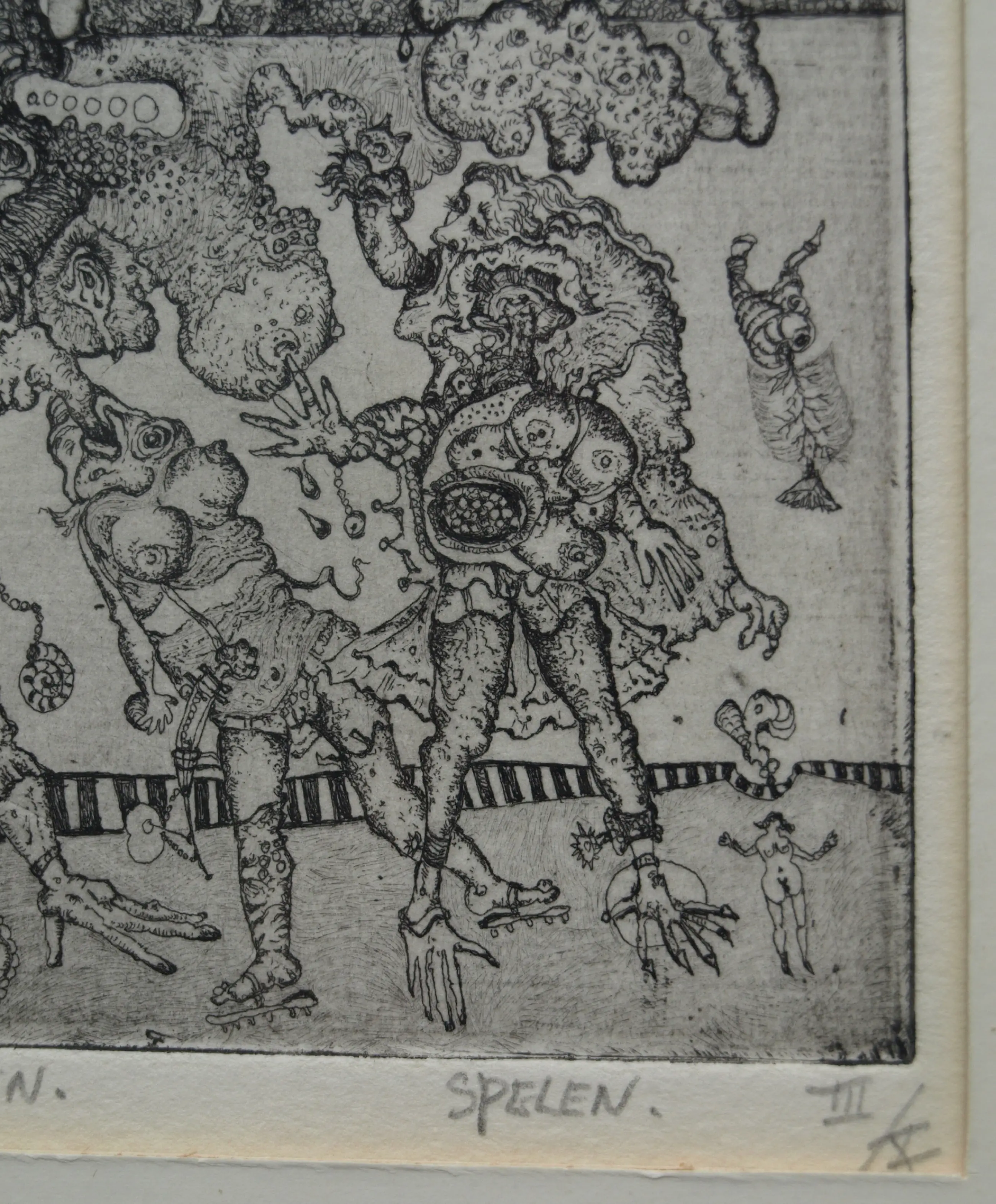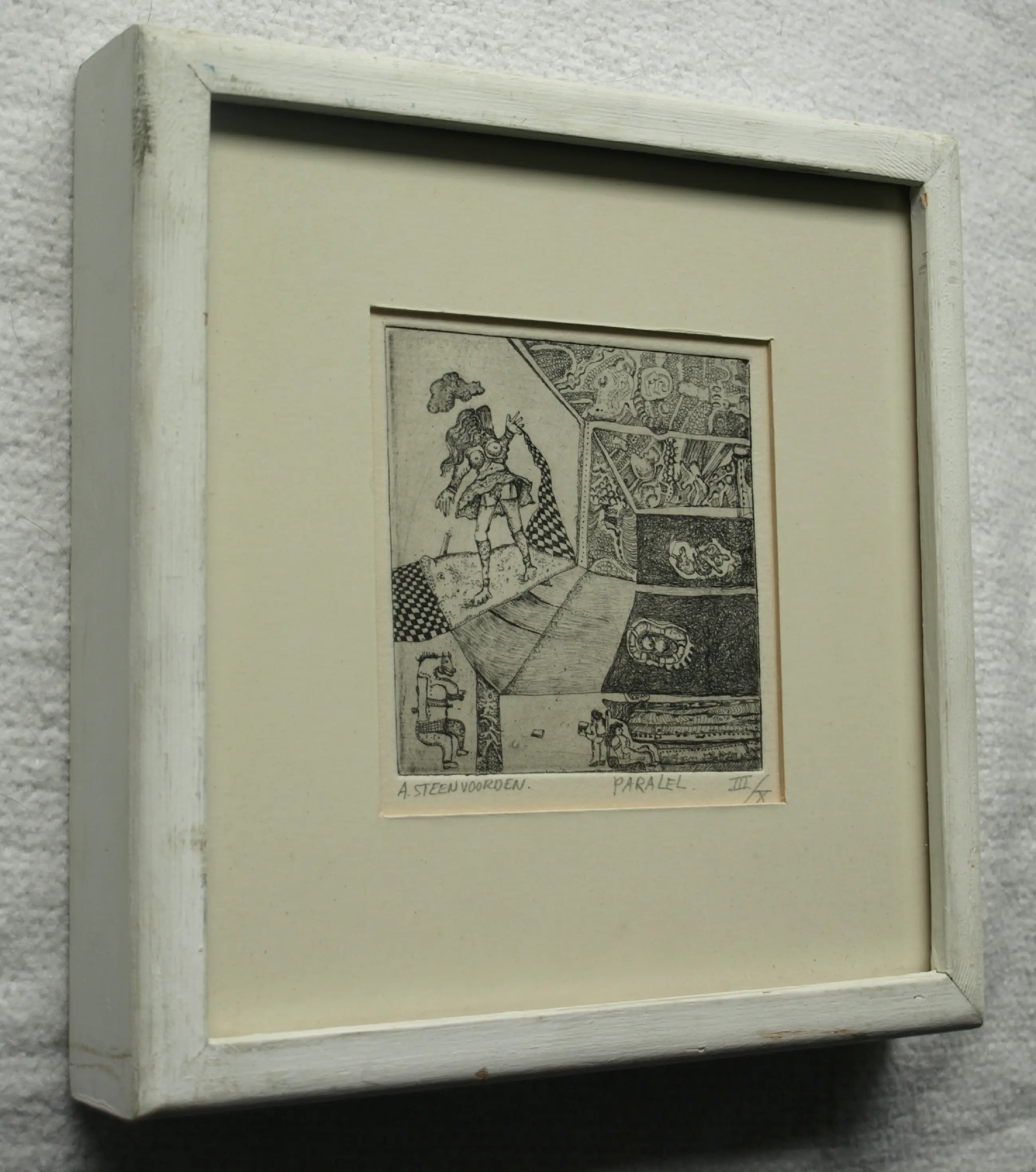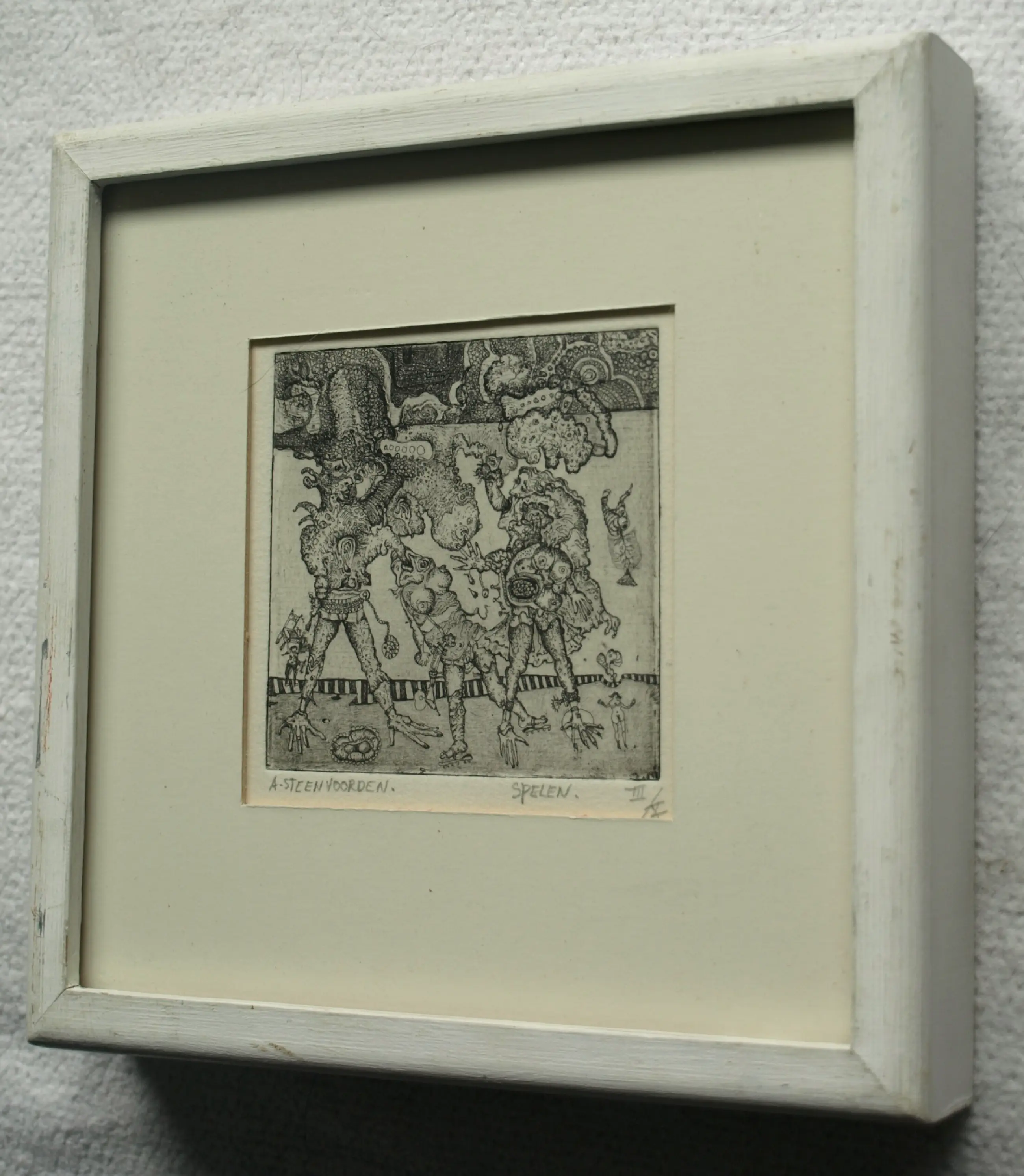 Informatie over de kunstenaar: Albertus ‘Ab’ Steenvoorden, geboren 05-07-1933 in Leiden en overleden 11-10-2010 in Noordwijk, schilder, aquarellist, tekenaar, pentekenaar, etser, lithograaf en beeldhouwer. Opleiding: Akademie van beeldende kunsten, Den Haag. Hij maakte in de jaren zeventig van de vorige eeuw deel uit van een kunstenaarsgroep in Leiden, “De bange duivel”. De groep vormde een commune, die gevestigd was in een huis met een eigen drukkerij aan de Bakker Koffstraat. Ab Steenvoorden werkte als illustrator mee aan diverse boeken (o.a. van de auteur Jacques Hamelink) en maakte een groot aantal ex-libris. Hij exposeerde met name in Galeries en musea in Den Haag en Noordwijk. Daarnaast publiceerde hij zelf zijn memoires: ”Wat ik gezien heb”. Een aantal van zijn beelden is te vinden in de openbare ruimte. Ook bevindt zijn werk zich in de Lakenhal, Leiden. Zijn tekeningen en etsen, vol wervelende composities van fabelachtige dieren en mythisch aandoende mensfiguren, openen een onbekende wereld. Literatuur: Scheen 1969-1970 , vol. 2, p. 390 ; Jacobs 1993 ; Salman et al. 2011 , p. 499.