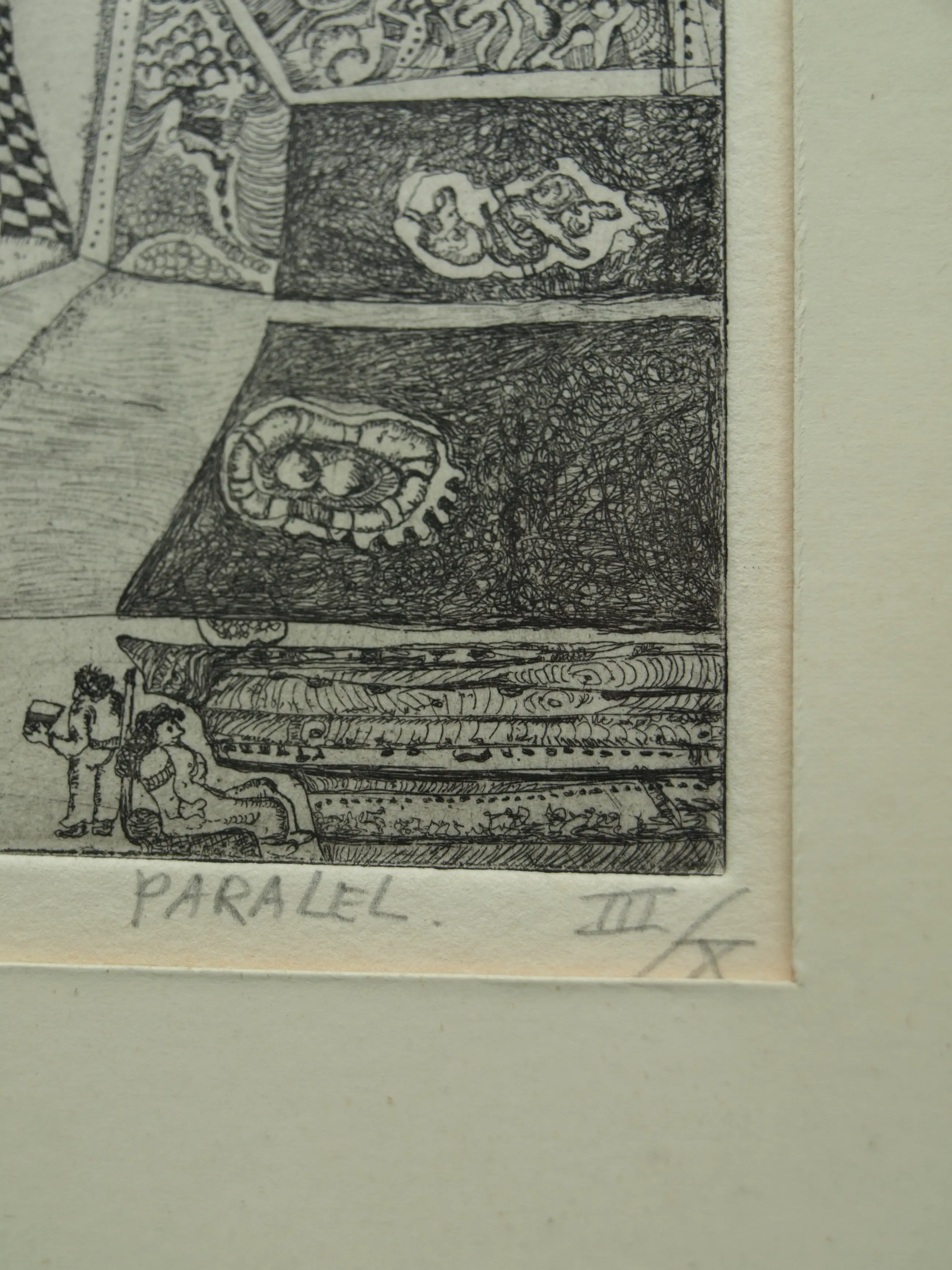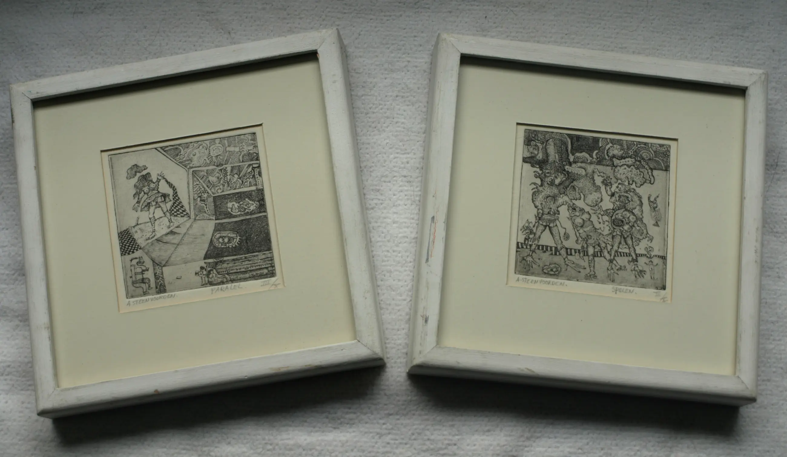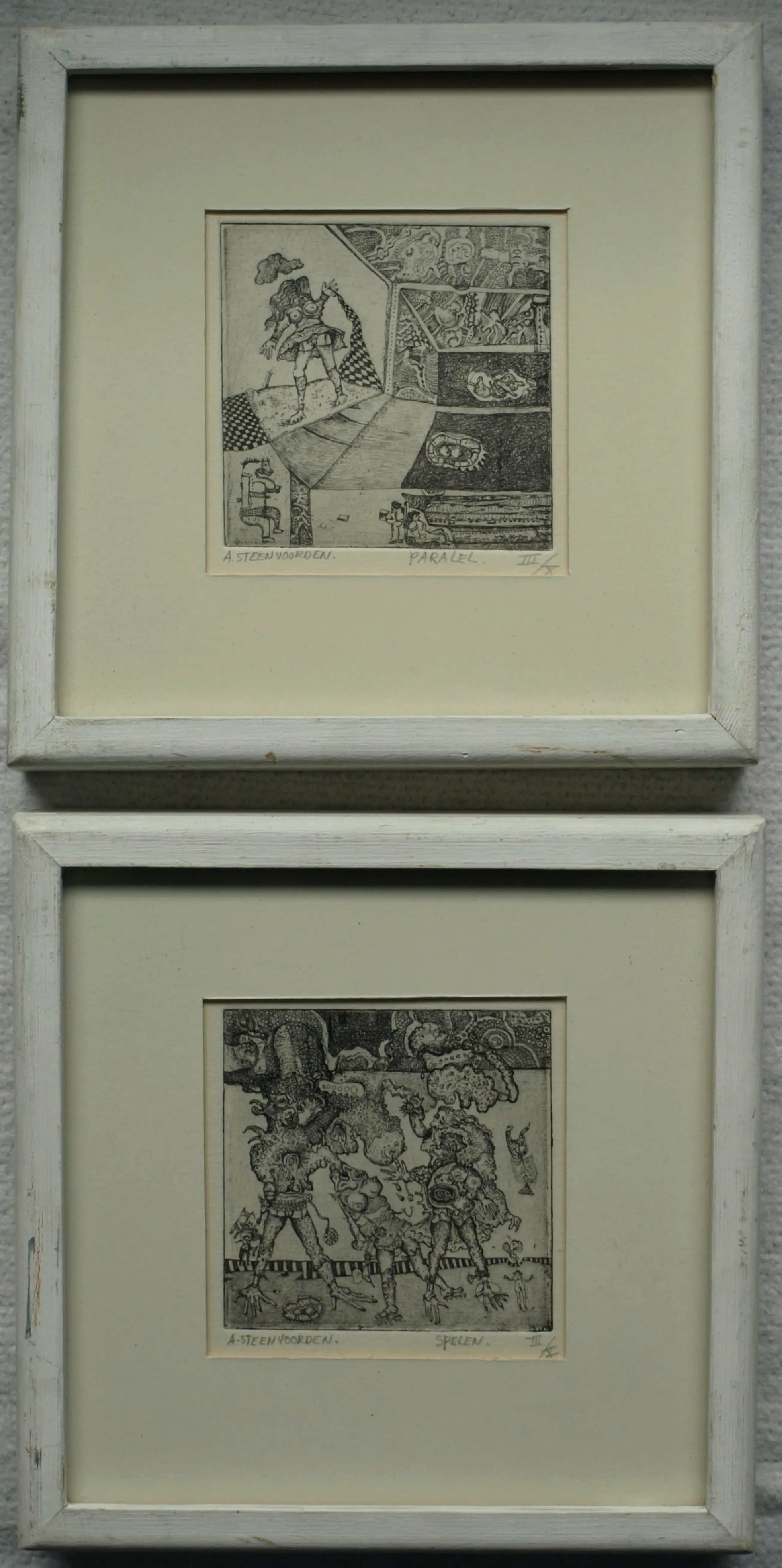 2 Ingelijste etsen van de Nederlandse kunstenaar Ab Steenvoorden (1933-2010). -Handgesigneerd, -genummerd en -getiteld met potlood. -Nr. 3 (III) van 10 (X) exemplaren. -Beide etsen zijn ingelijst in een houten baklijst. -Afmetingen van beide etsen: Lijst, 18 x 18 x 3 cm. Beeld / ets, 8 x 8 cm. -Herkomst: Uit de inboedel van een kunstverzamelaar. -Conditie: De etsen zijn in goede staat. De houten lijsten hebben slijtplekjes en vlekjes. Zie ook de foto’s voor een eigen indruk. Kunnen zo aan de muur.