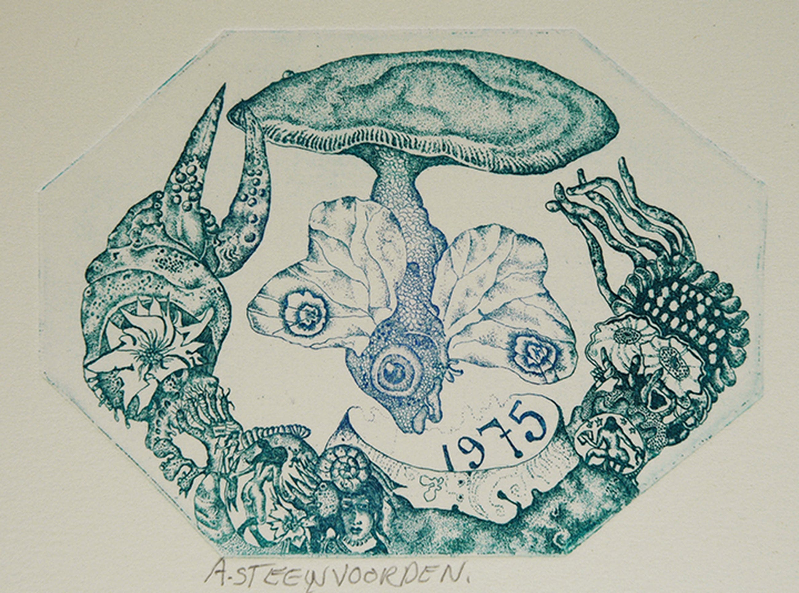 De Noordwijkse kunstenaar Ab Steenvoorden maakte al in de jaren zeventig van de vorige eeuw deel uit van een kunstenaarsgroep in Leiden, De Bange Duivel, die gevestigd was in een huis met een eigen drukkerij aan de Bakker Koffstraat. Ab Steenvoorden maakte een groot aantal exlibris, allemaal in de ets-techniek. Ze zijn onmiddellijk herkenbaar door hun weelderige, fantasierijke stijl.