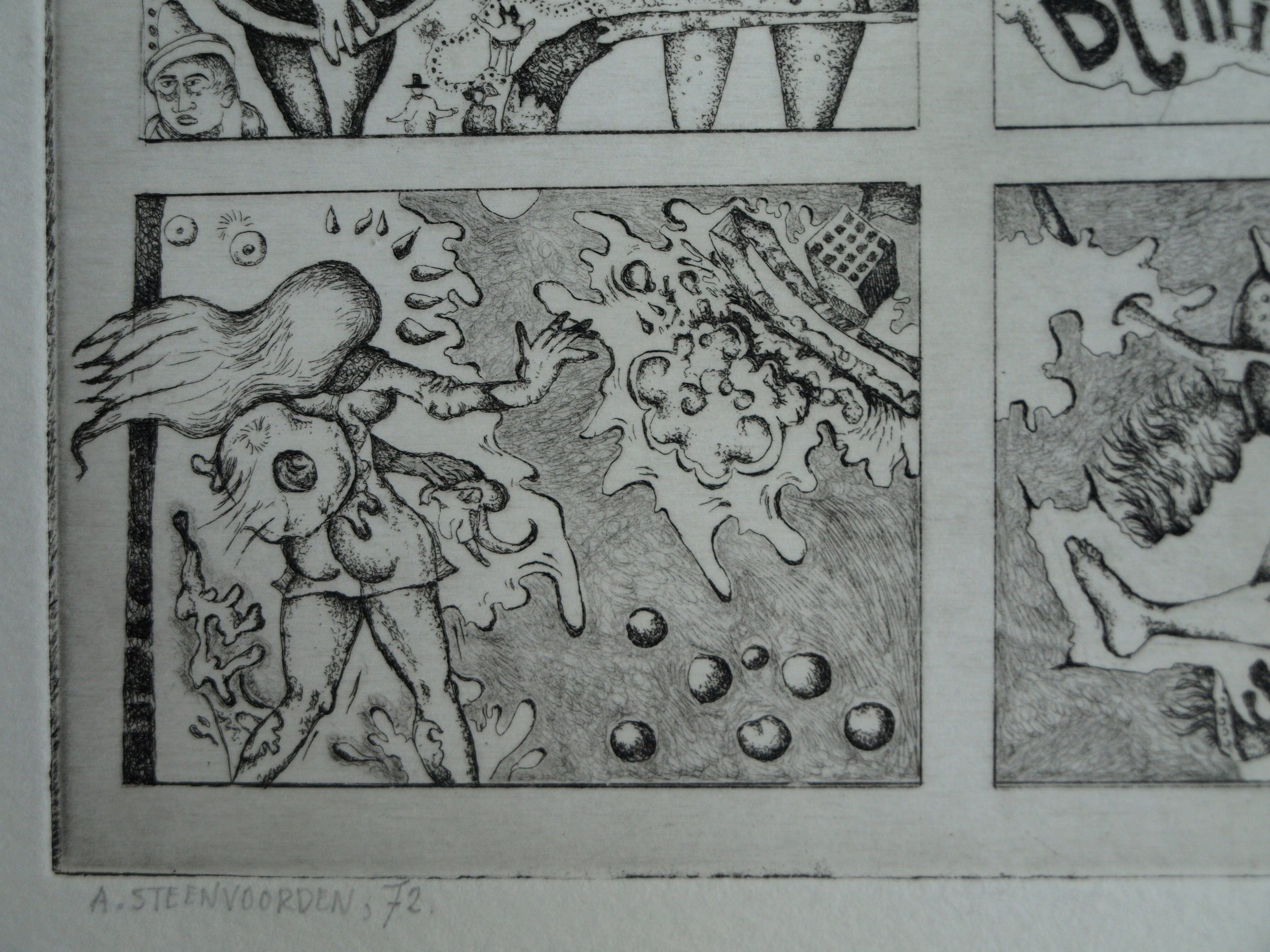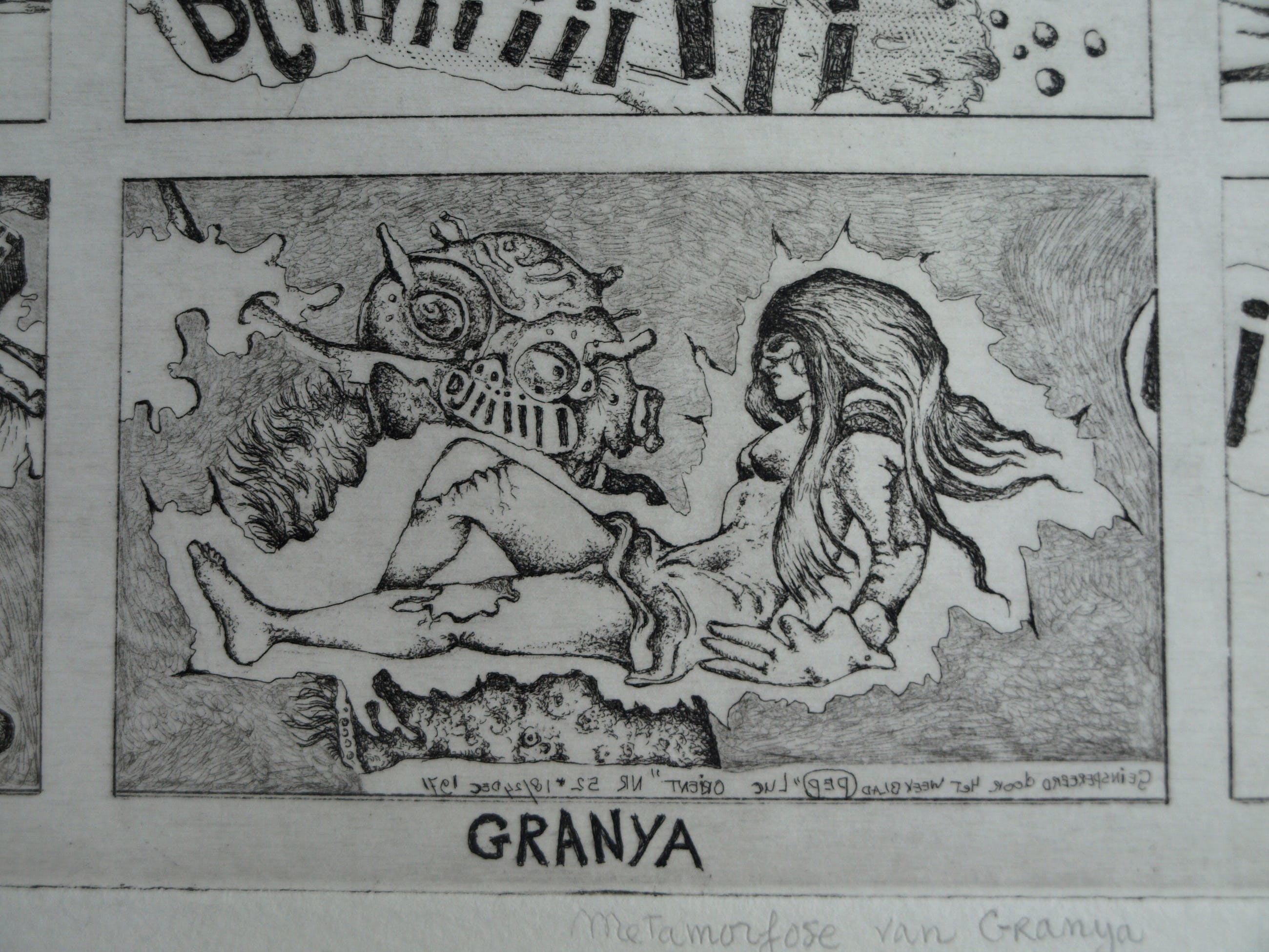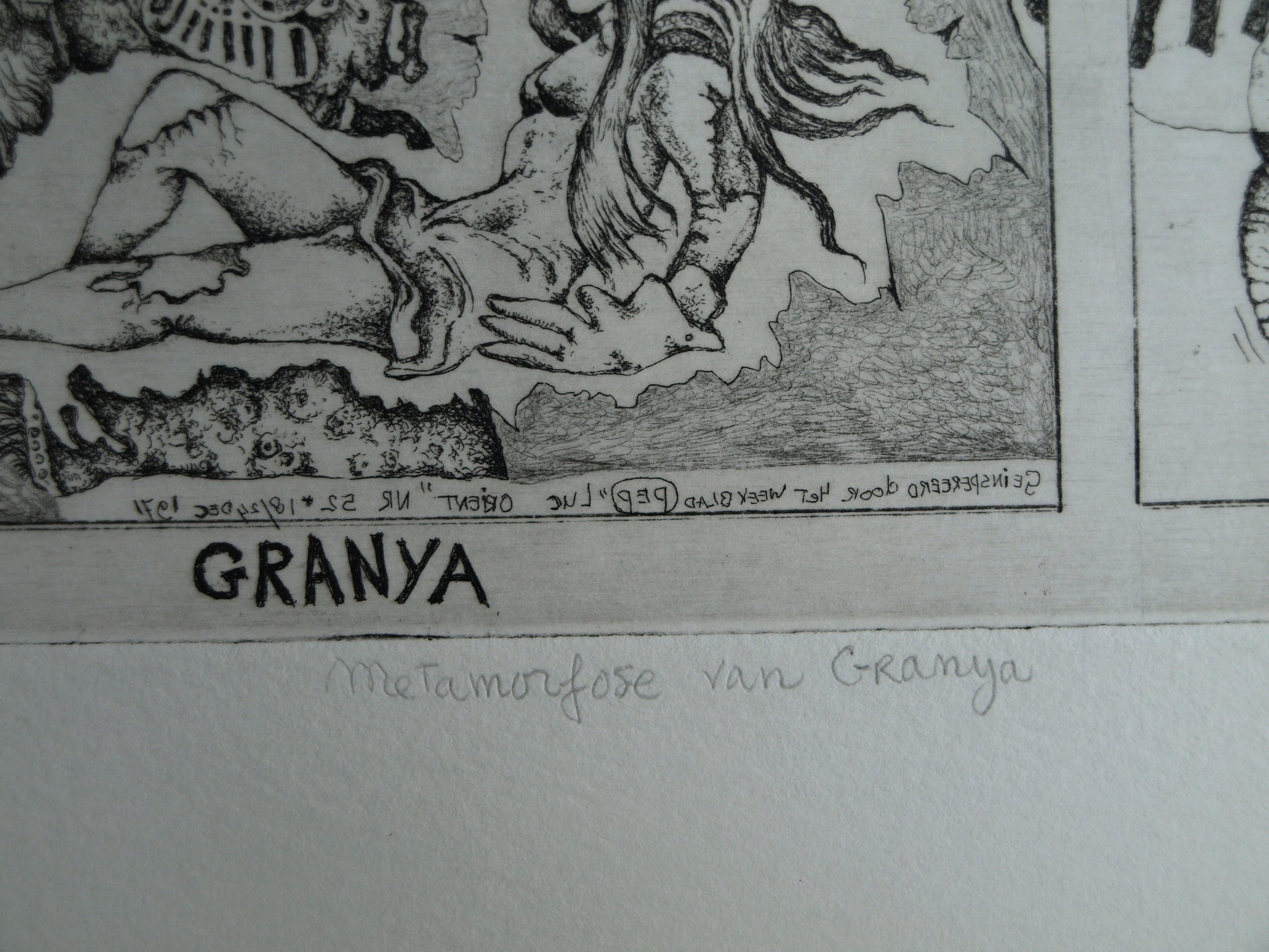 Een ets op geschept papier uit 1972 van de Nederlandse kunstenaar Ab Steenvoorden (1933-2010), met een surrealistische voorstelling, getiteld “Metamorfose van Granya”.