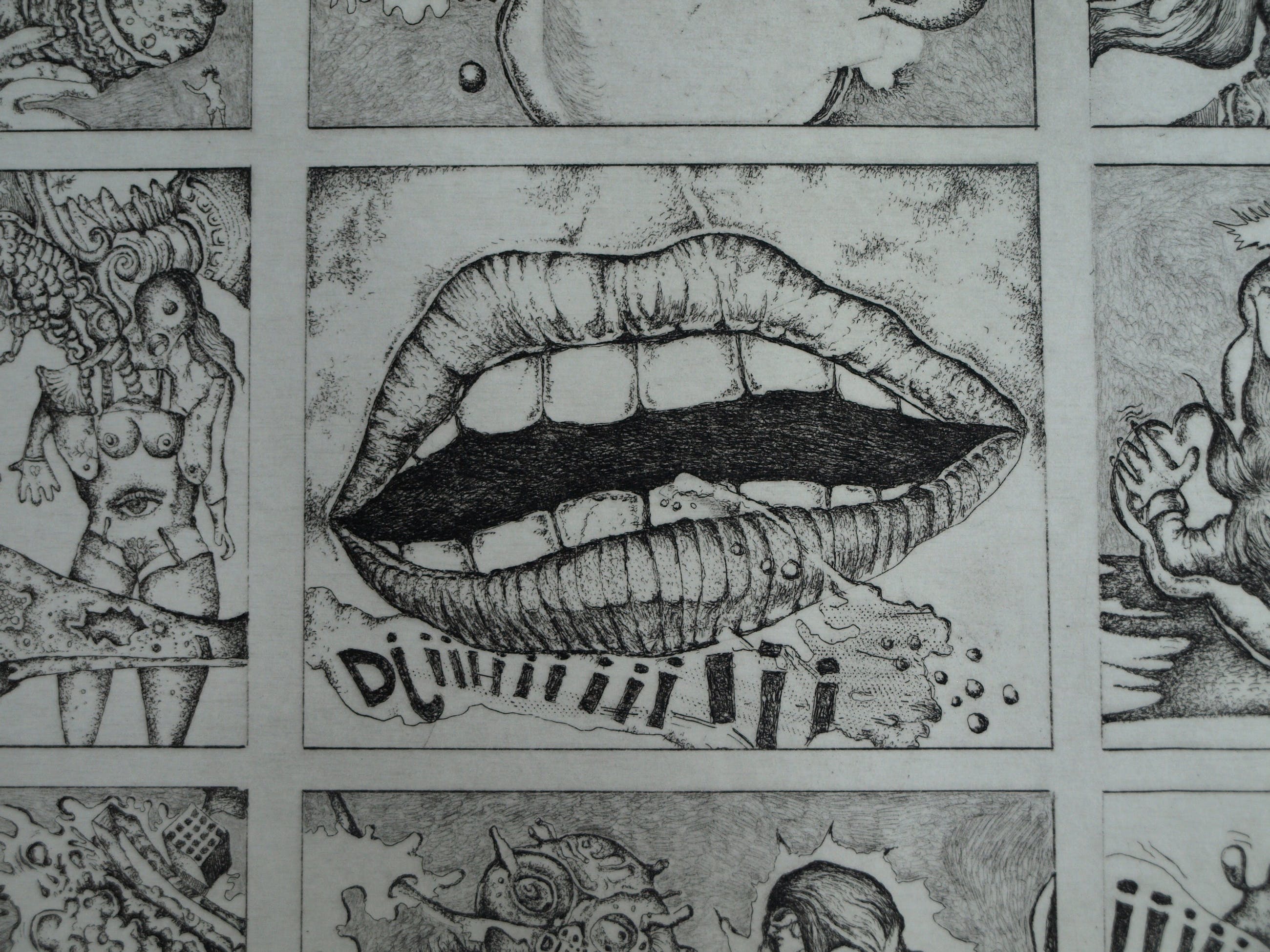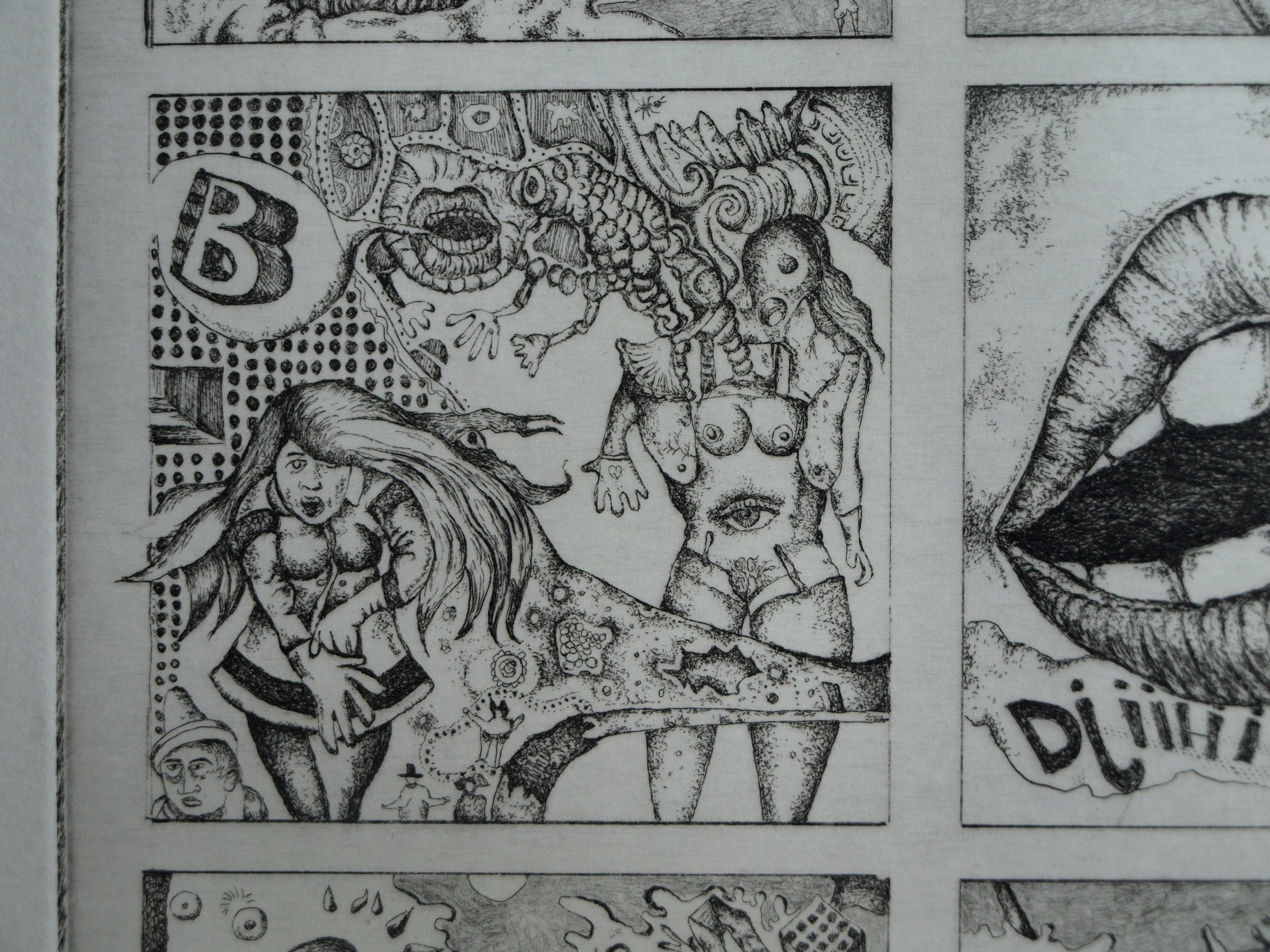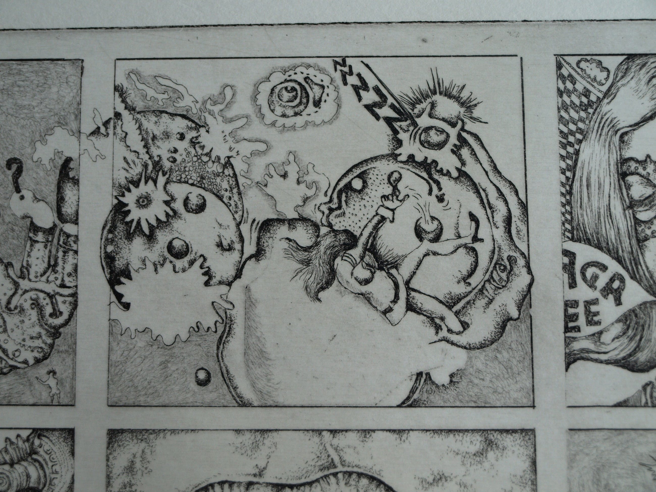 Een ets op geschept papier uit 1972 van de Nederlandse kunstenaar Ab Steenvoorden (1933-2010), met een surrealistische voorstelling, getiteld “Metamorfose van Granya”.