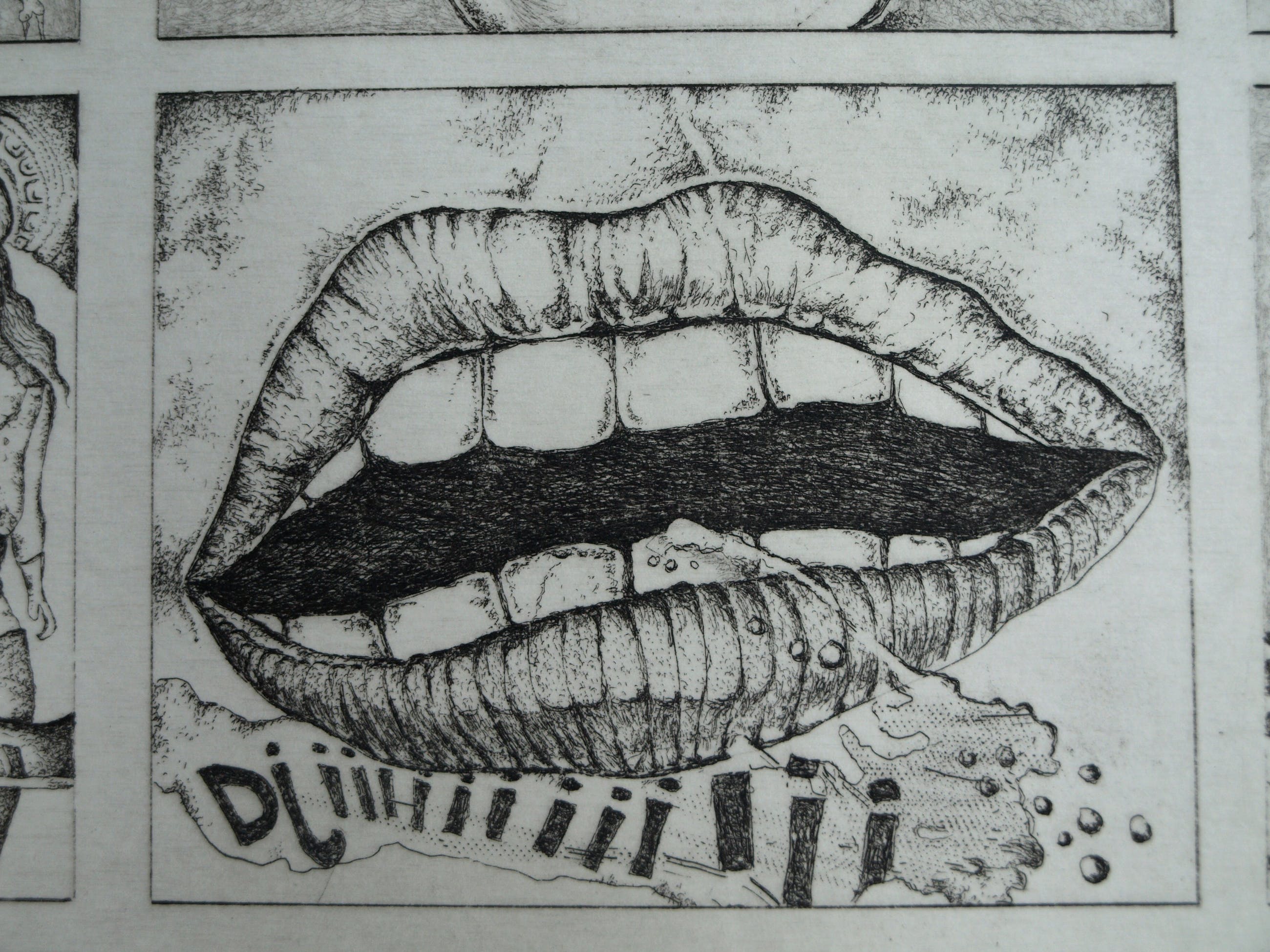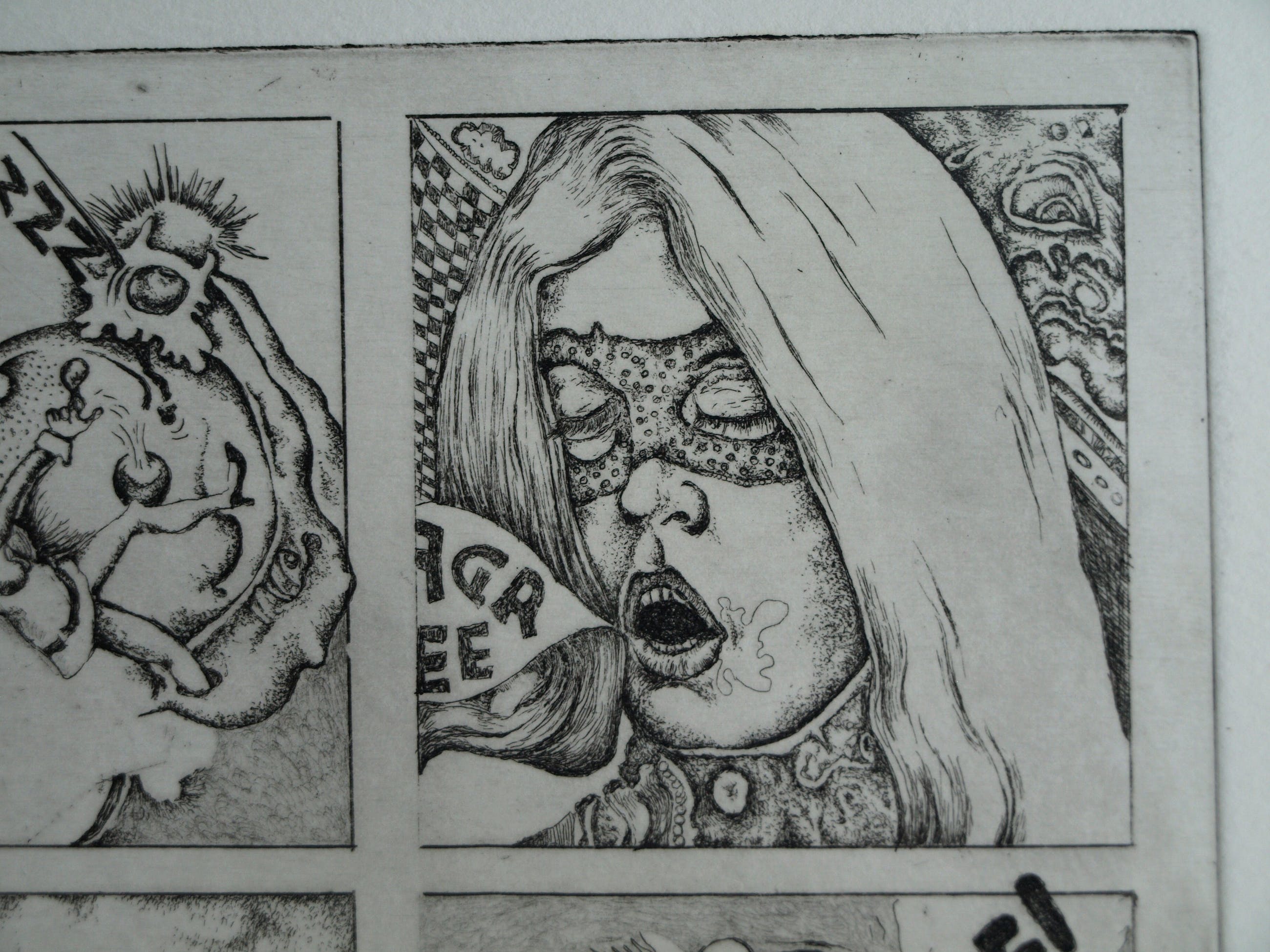 Middenonder in de ets staat in spiegelbeeld geschreven: “Geïnspireerd door het weekblad PEP, “Luc Oriënt” nr. 52, 18/24 dec. 1971”.
