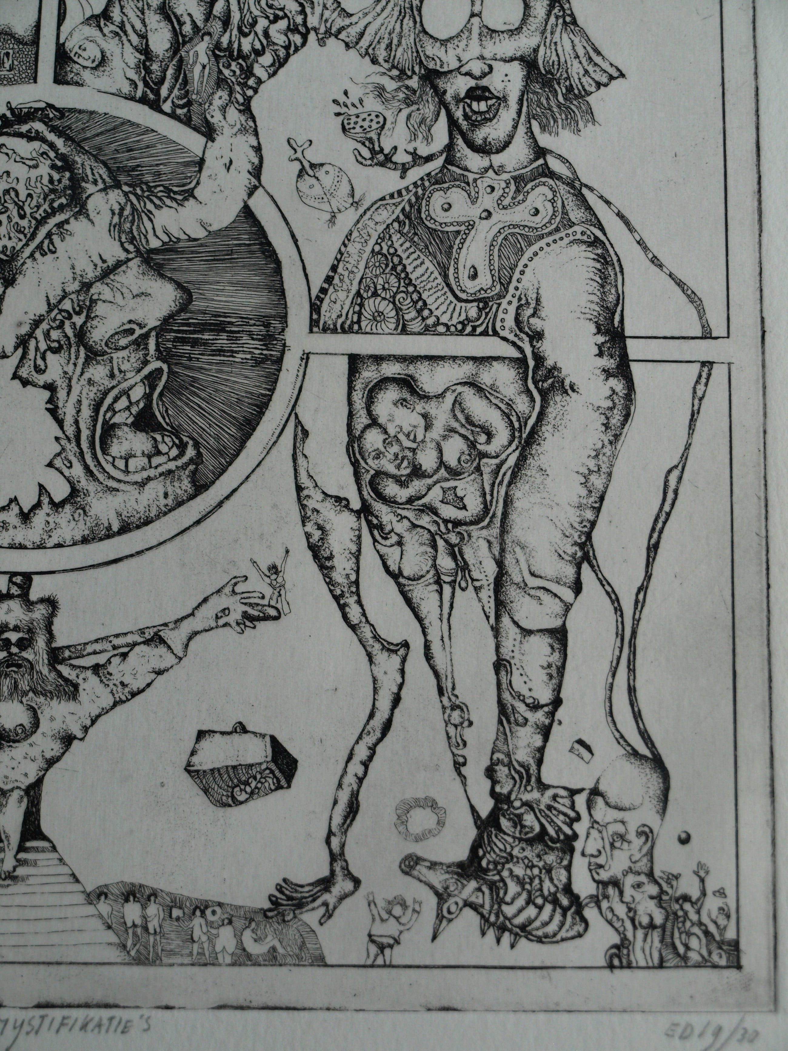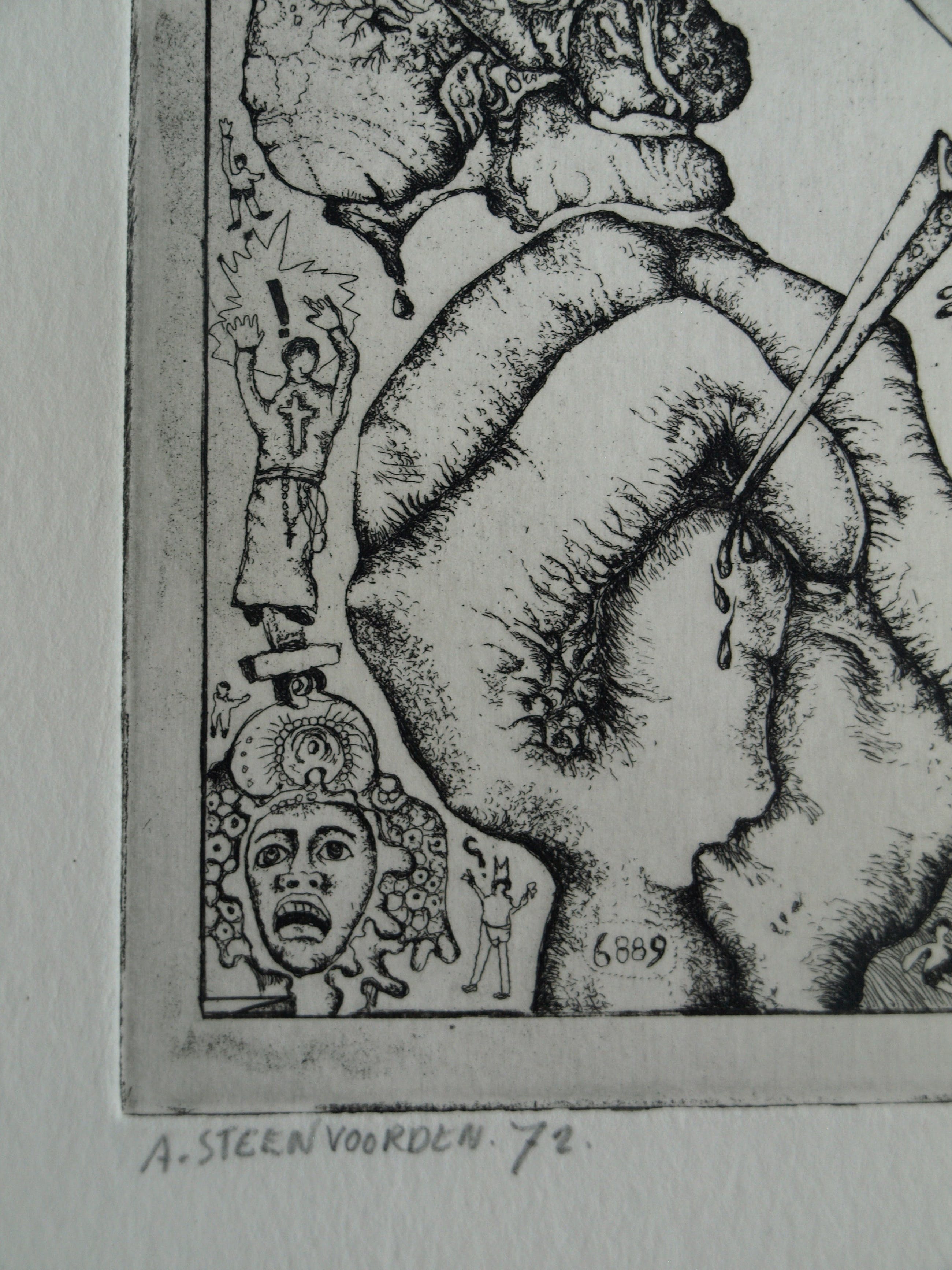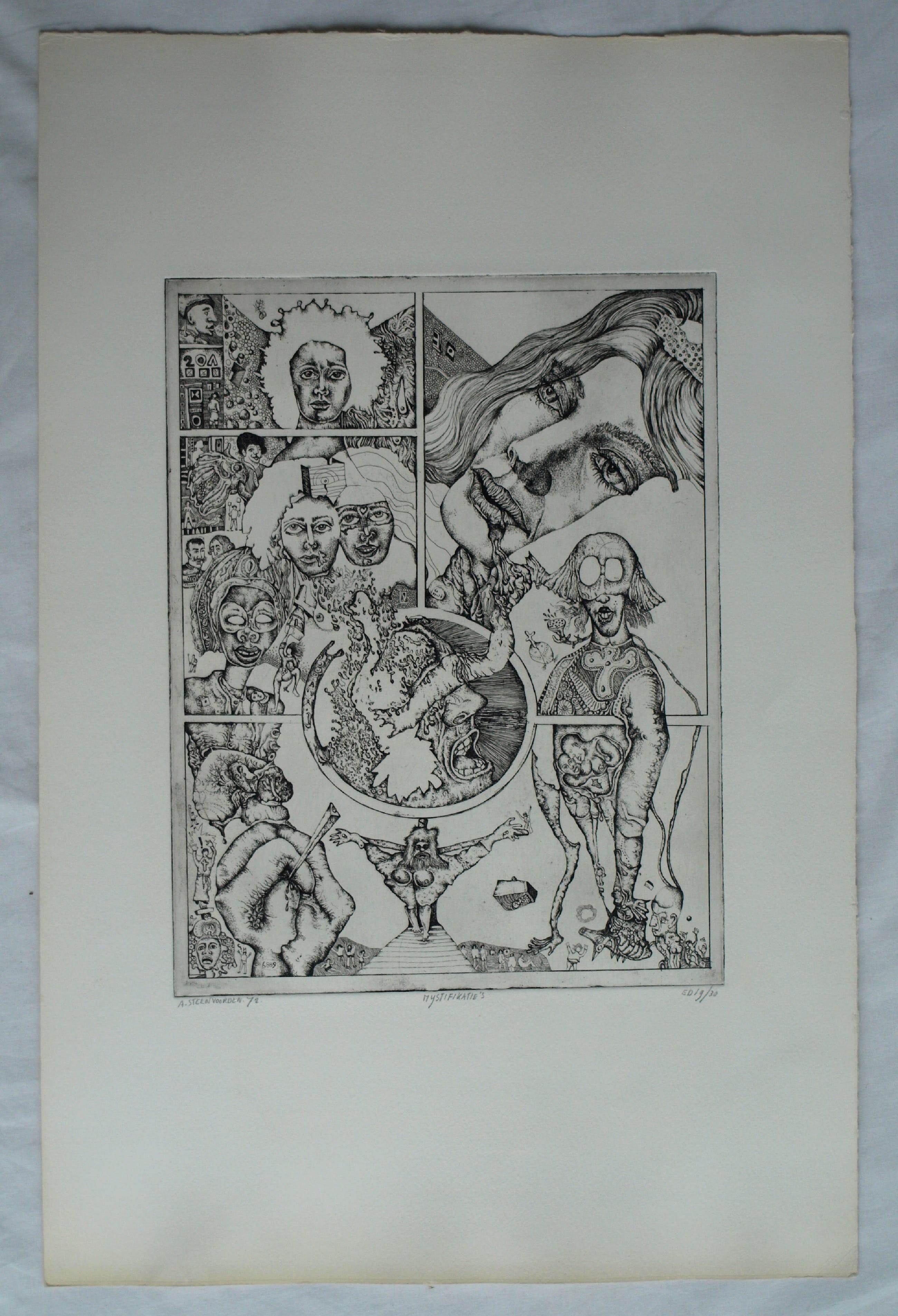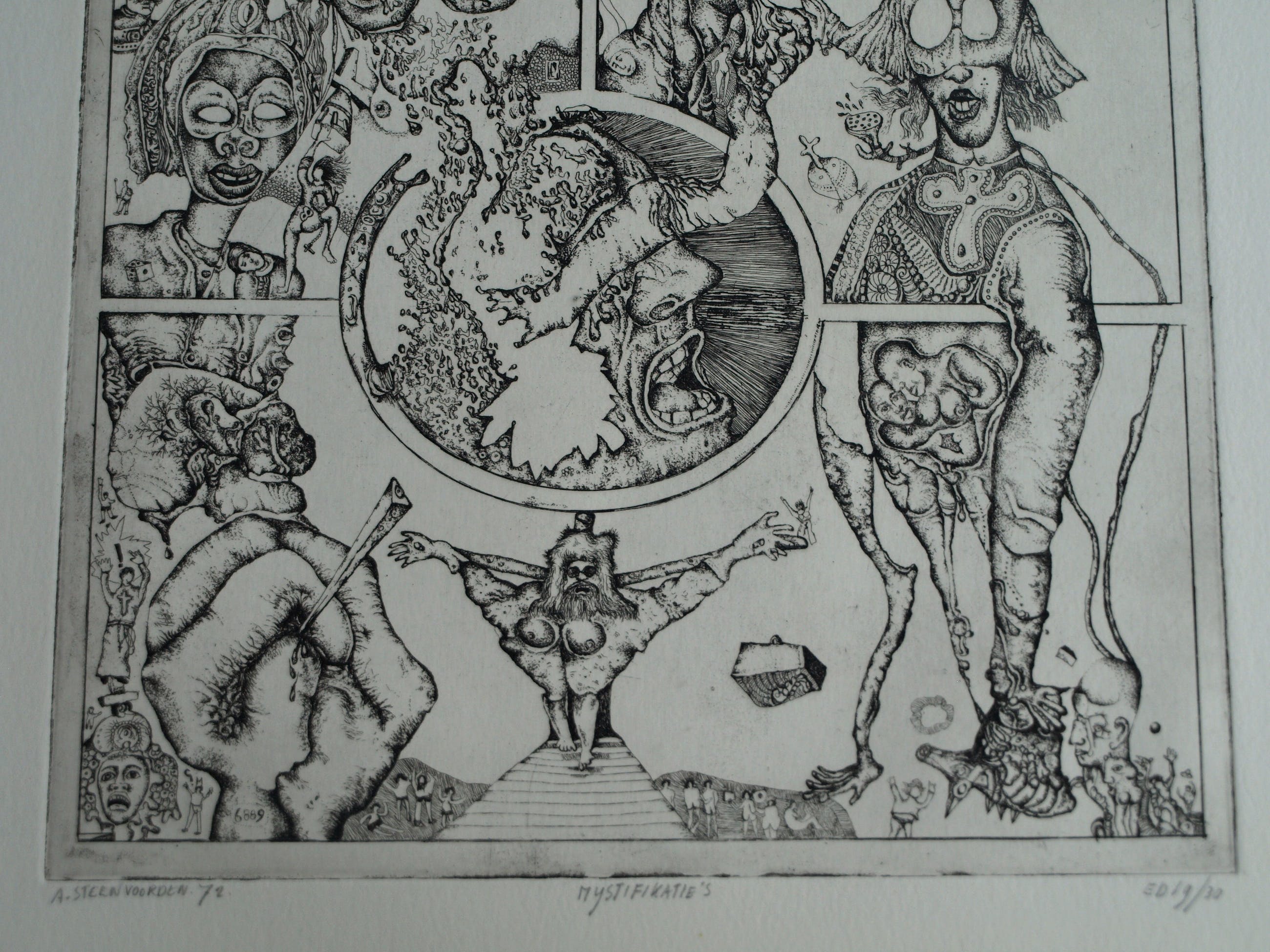 Een ets op geschept papier uit 1972 van de Nederlandse kunstenaar Ab Steenvoorden (1933-2010), met een surrealistische voorstelling, getiteld “Mystifikaties”.