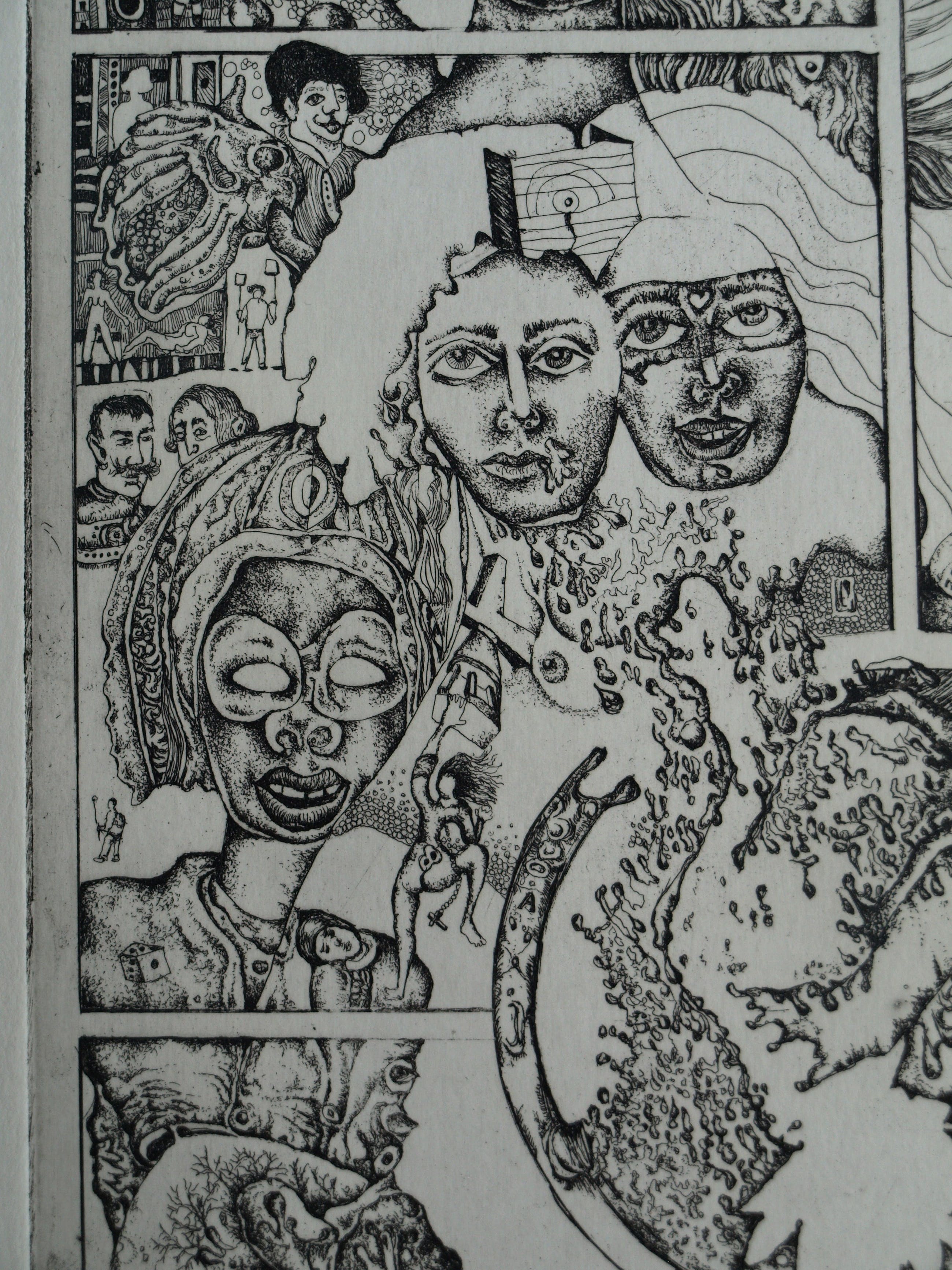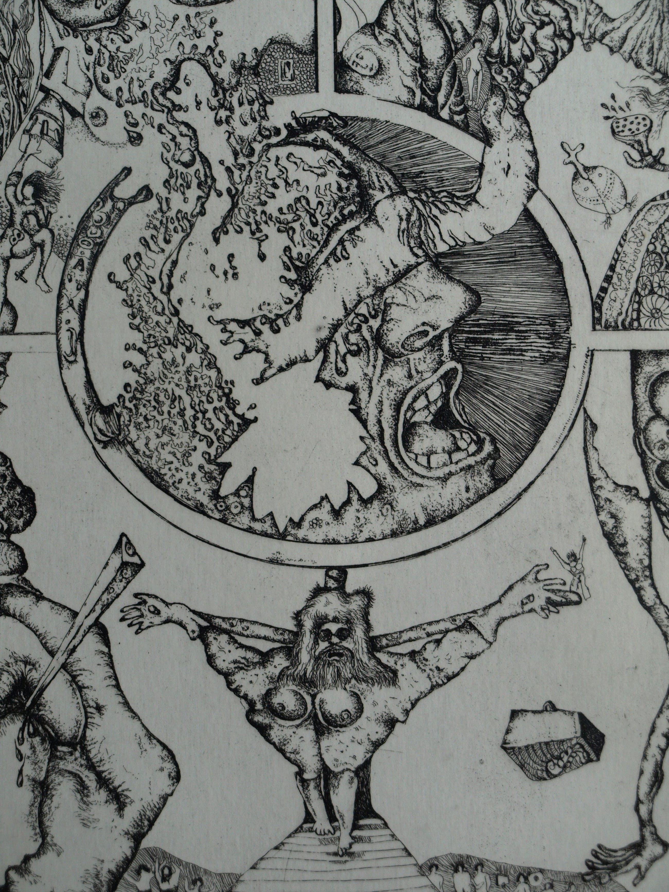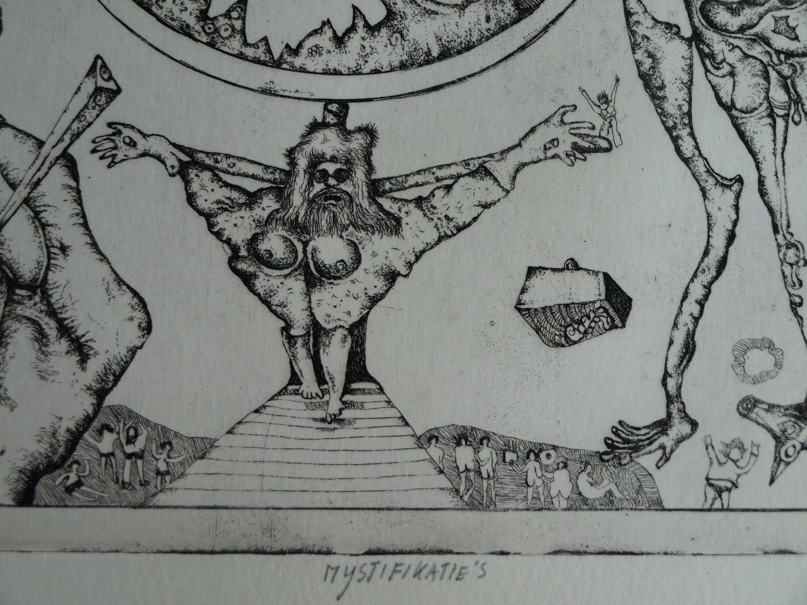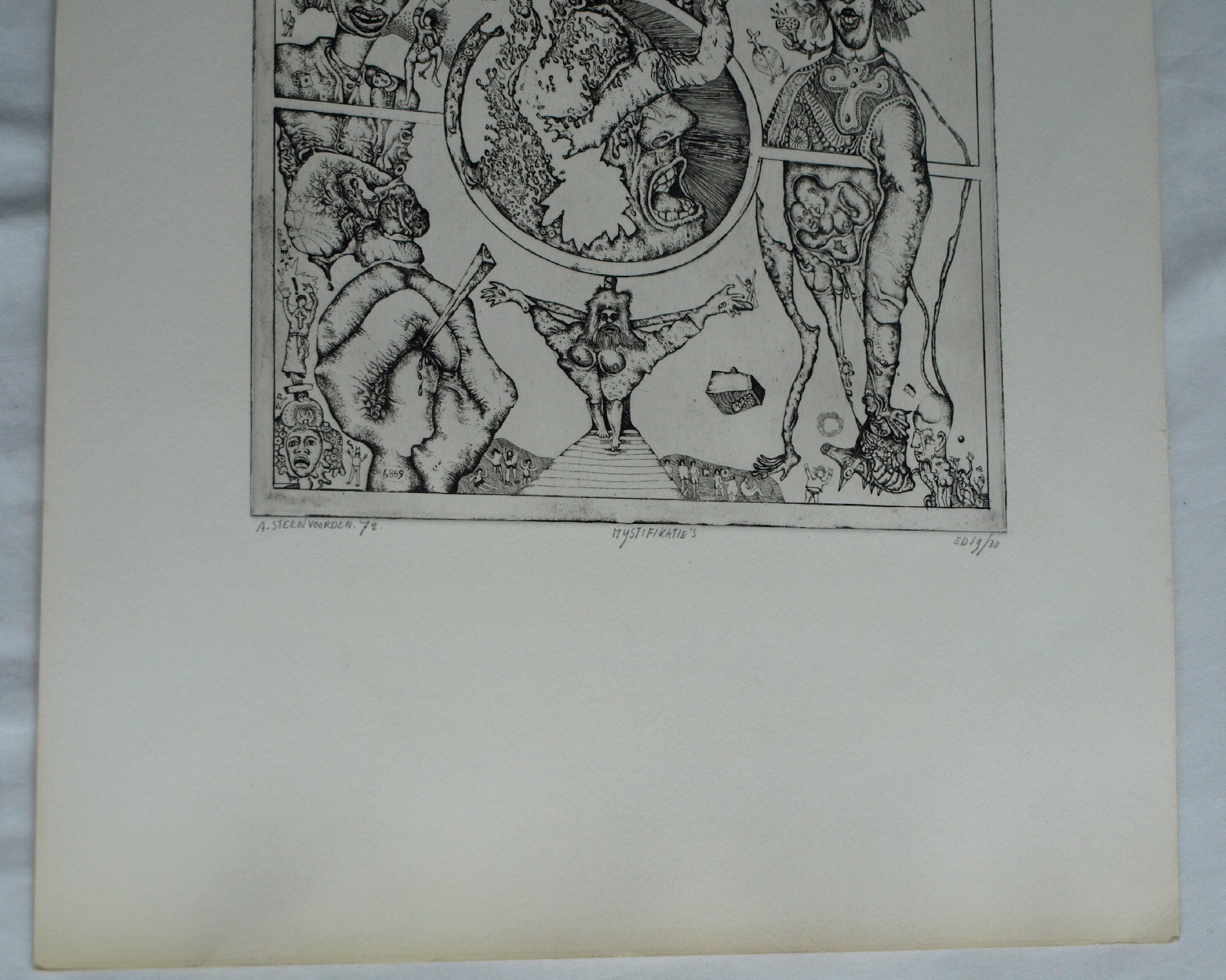 Een ets op geschept papier uit 1972 van de Nederlandse kunstenaar Ab Steenvoorden (1933-2010), met een surrealistische voorstelling, getiteld “Mystifikaties”.