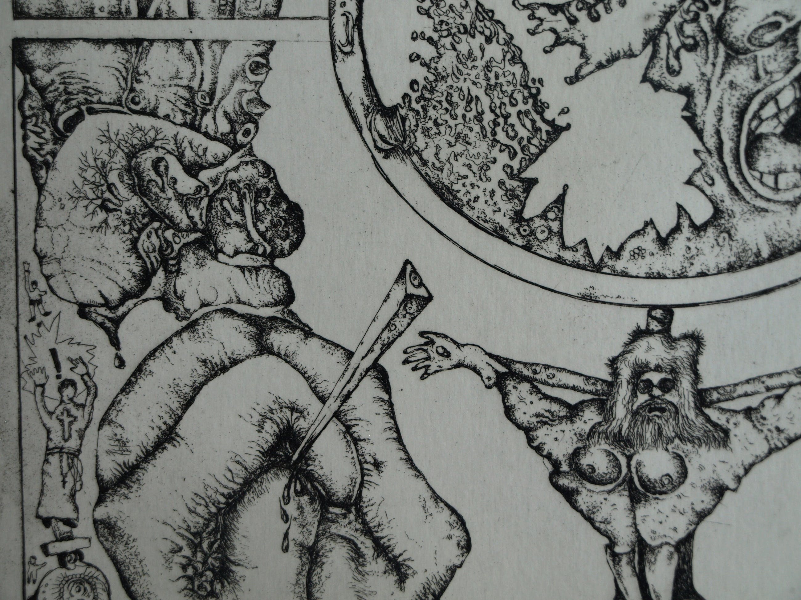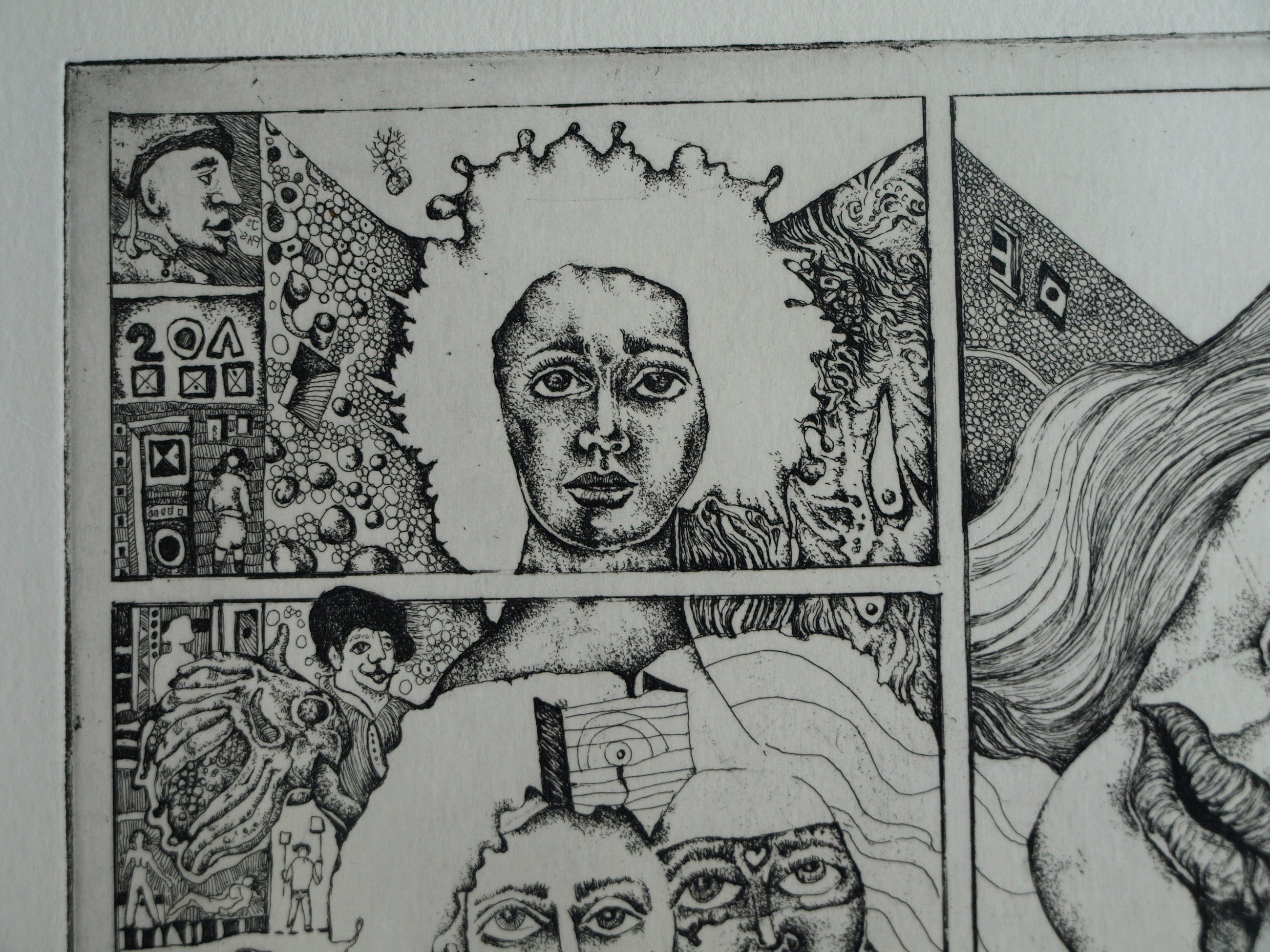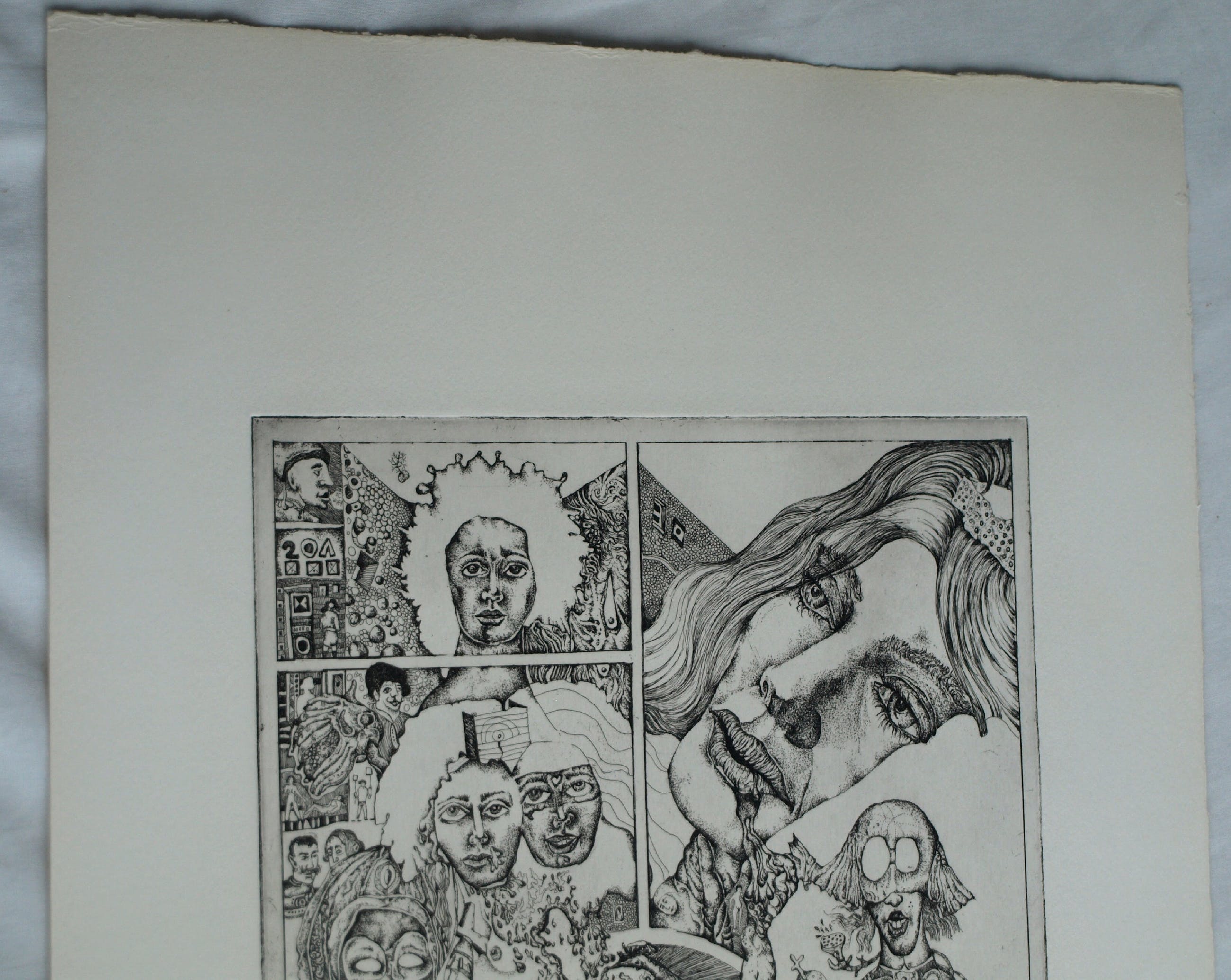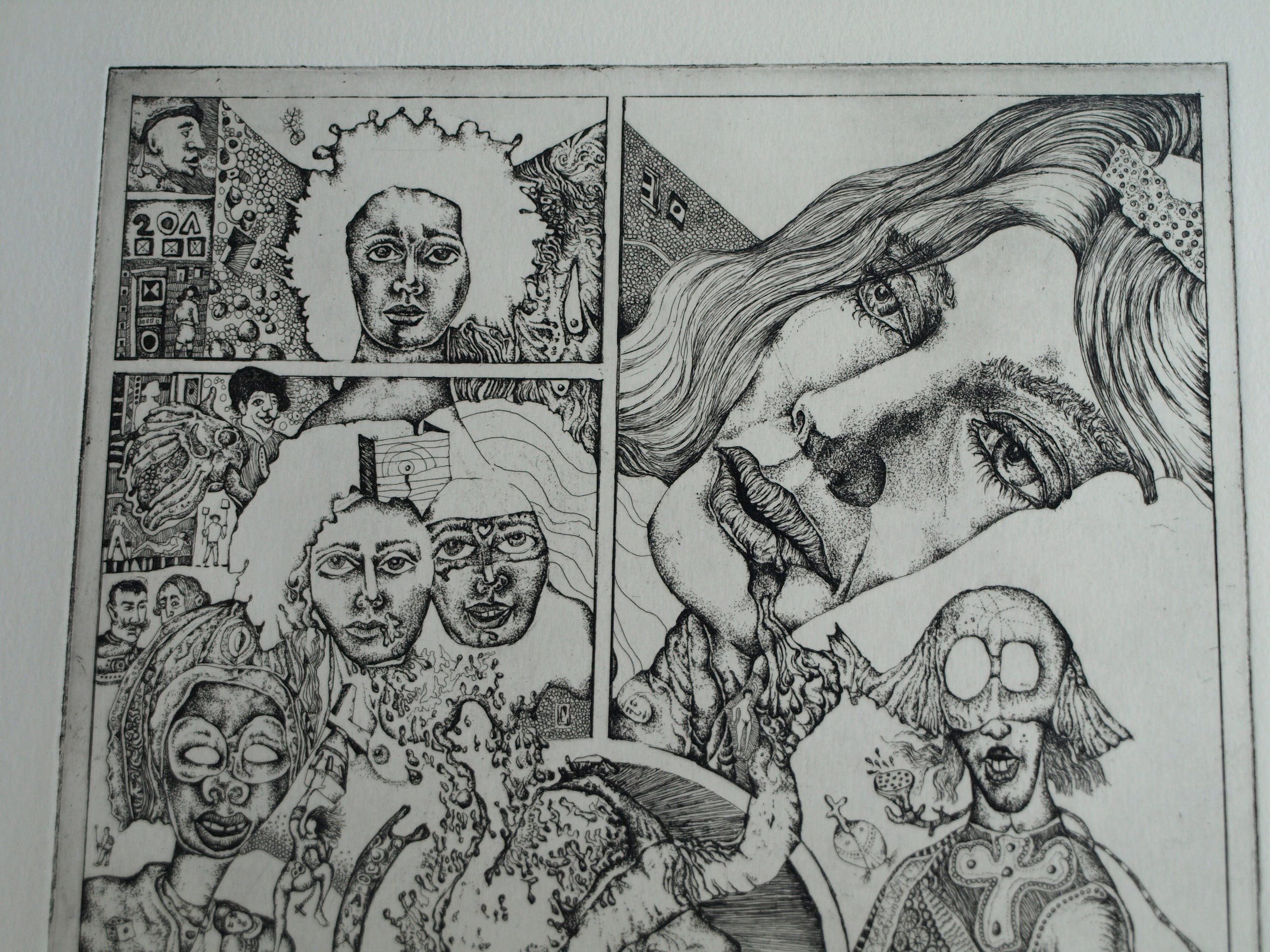 Een ets op geschept papier uit 1972 van de Nederlandse kunstenaar Ab Steenvoorden (1933-2010), met een surrealistische voorstelling, getiteld “Mystifikaties”.
