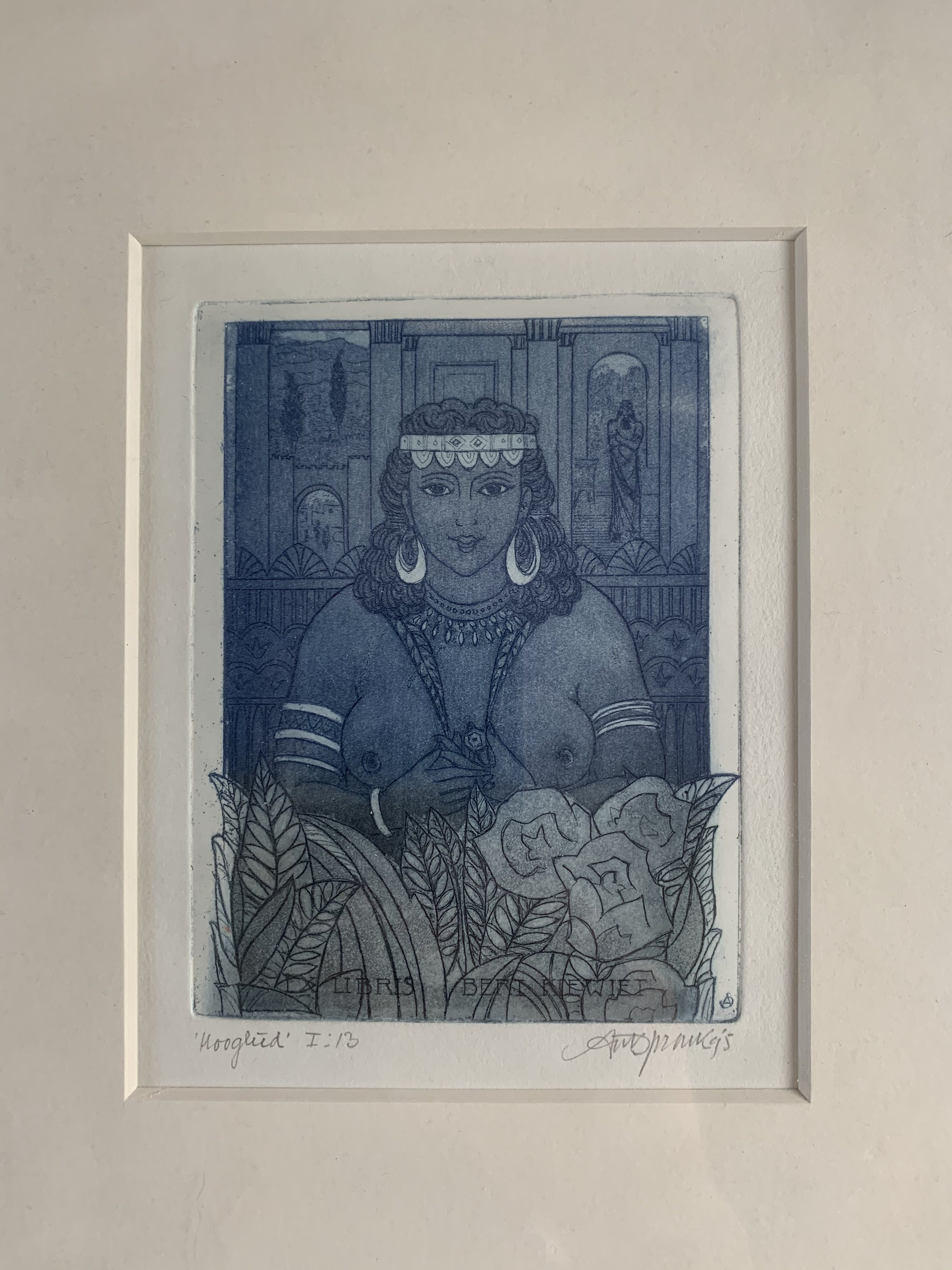 De drie Ex-Libris zijn in zeer goede staat, het pass partout heeft wat vochtschade. De ets moet in een nieuwe pass partout gedaan worden.