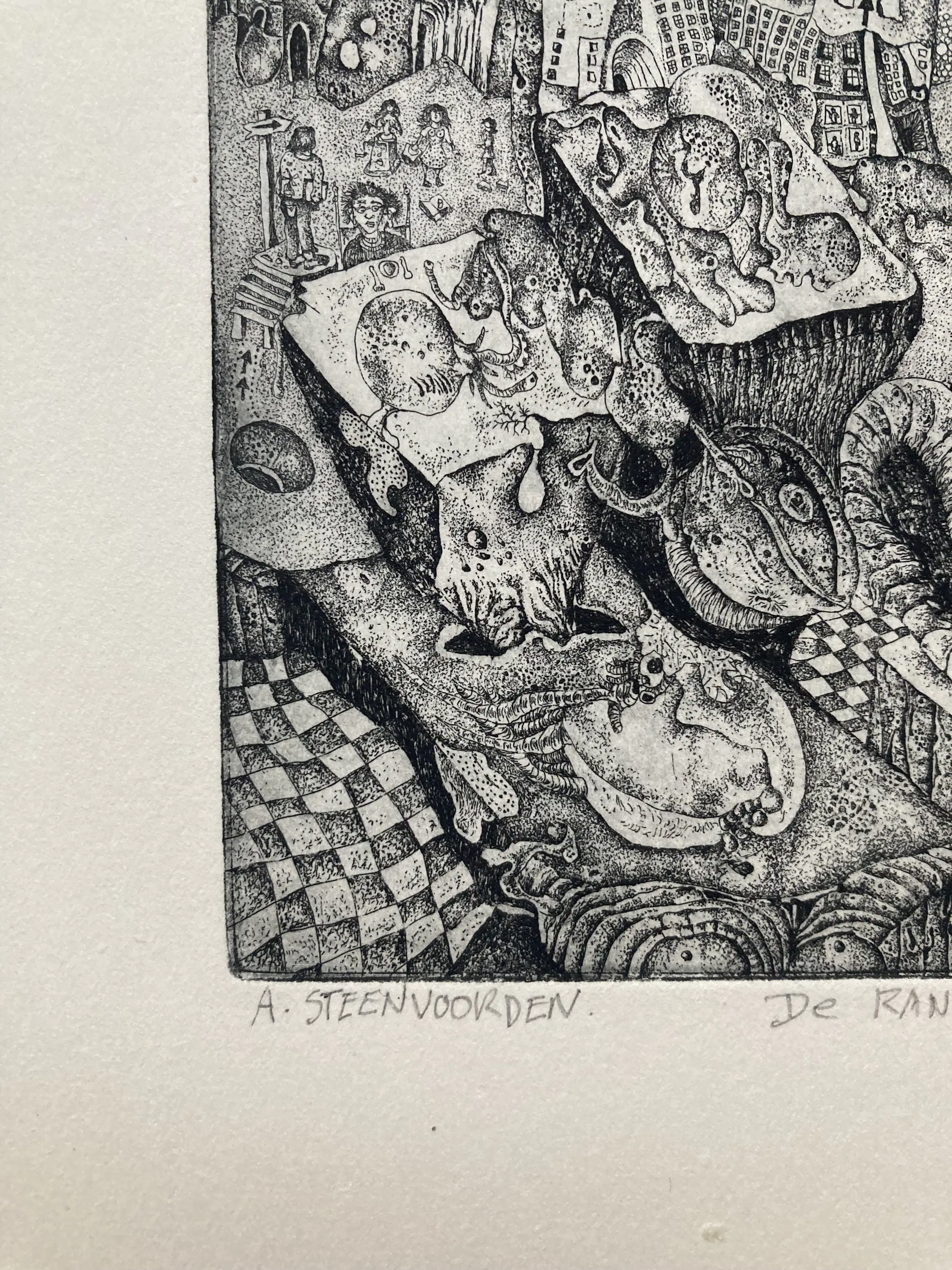 Ab Steenvoorden,handgesigneerde ets genummerd 2 van oplage 10 stuks (in romeinse cijfers uitgedrukt).Titel van de ets :De Rancofieren vormen zich.Afmeting hoogte 26 cm x 20 cm.Mooie schone staat en nooit ingelijst geweest.