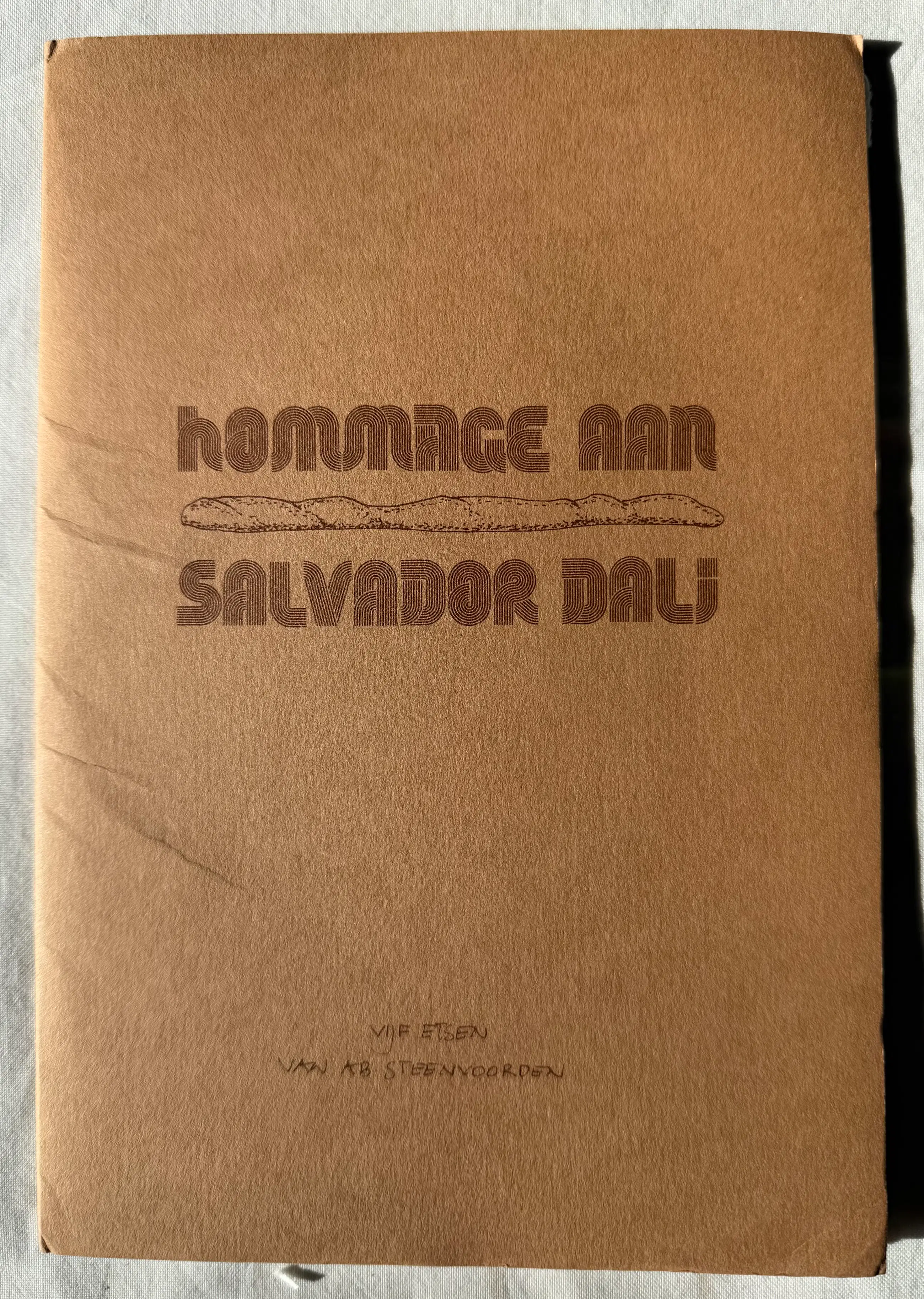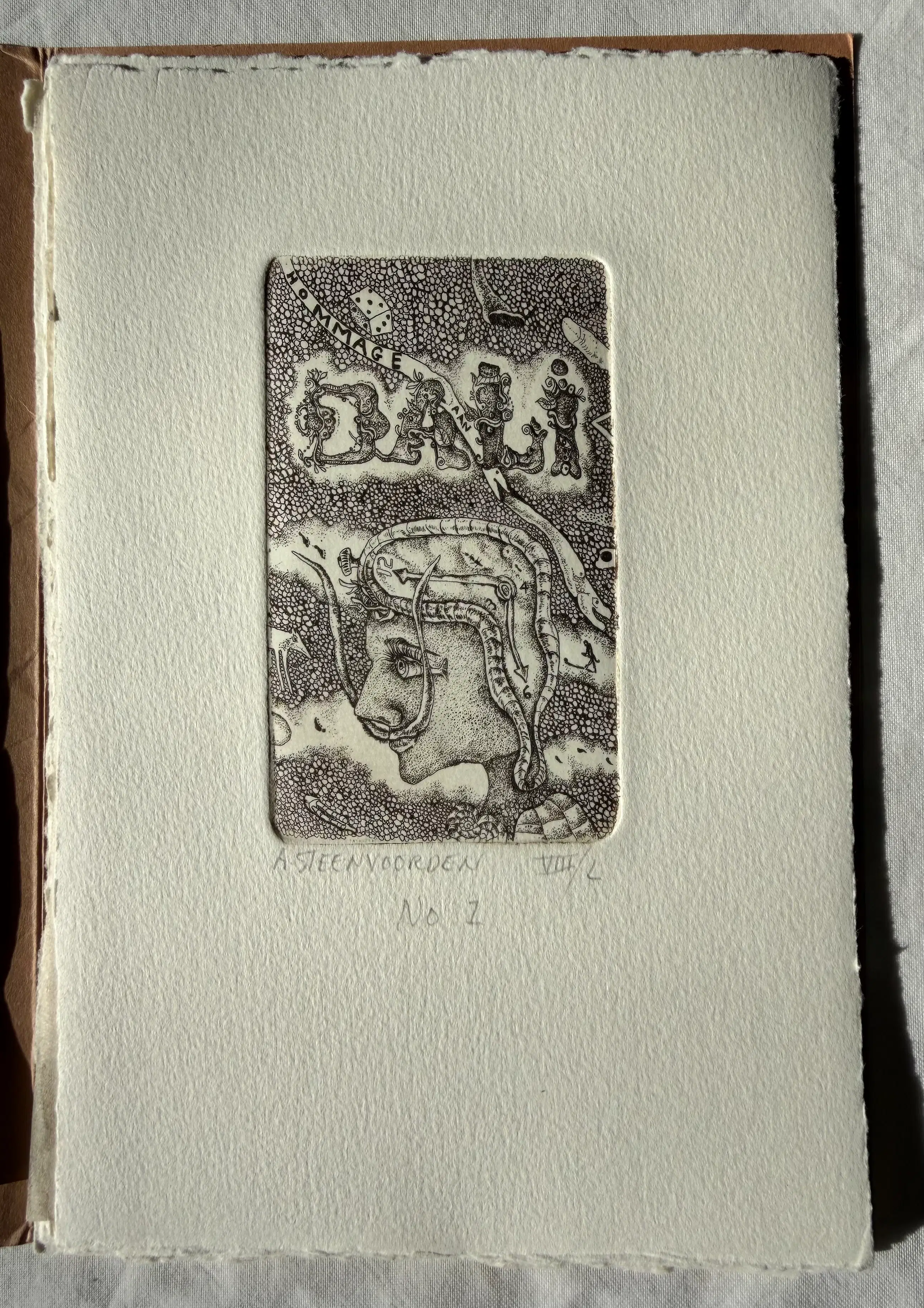 Vijf etsen van Ab Steenvoorden genaamd "Hommage aan Salvador Dali" in een papieren mapje.