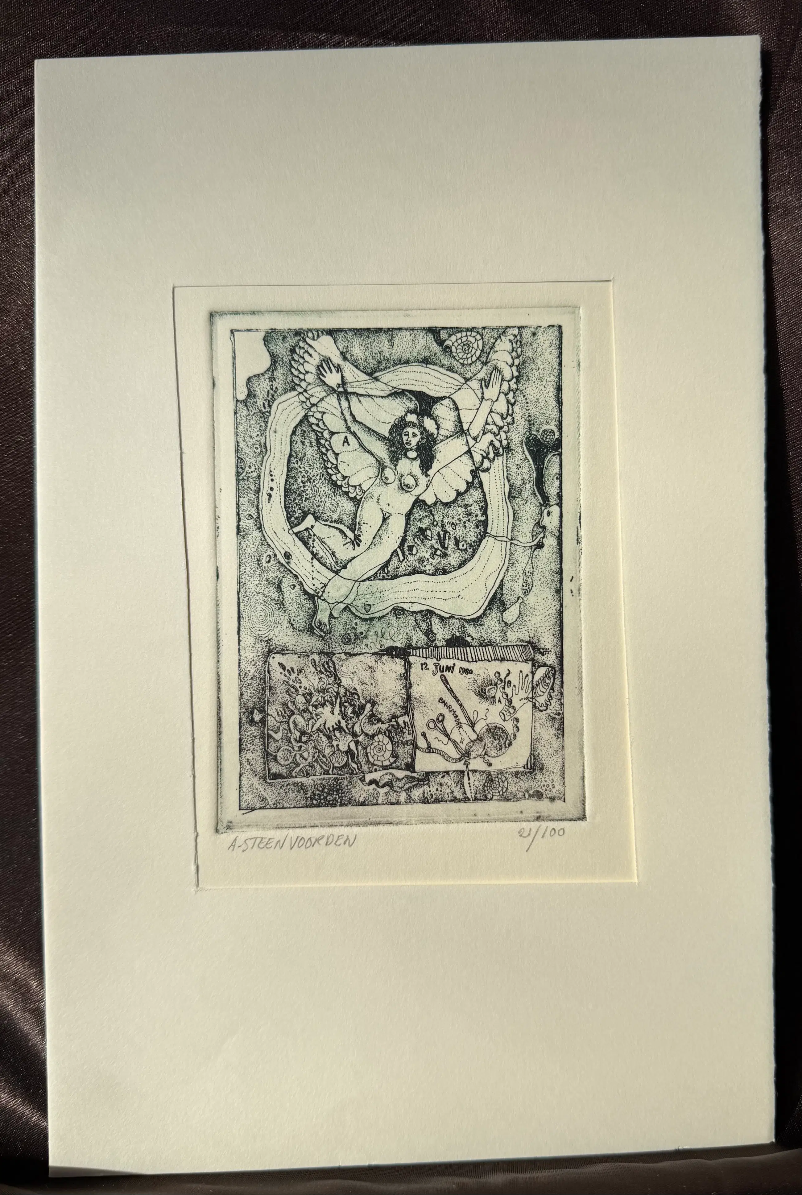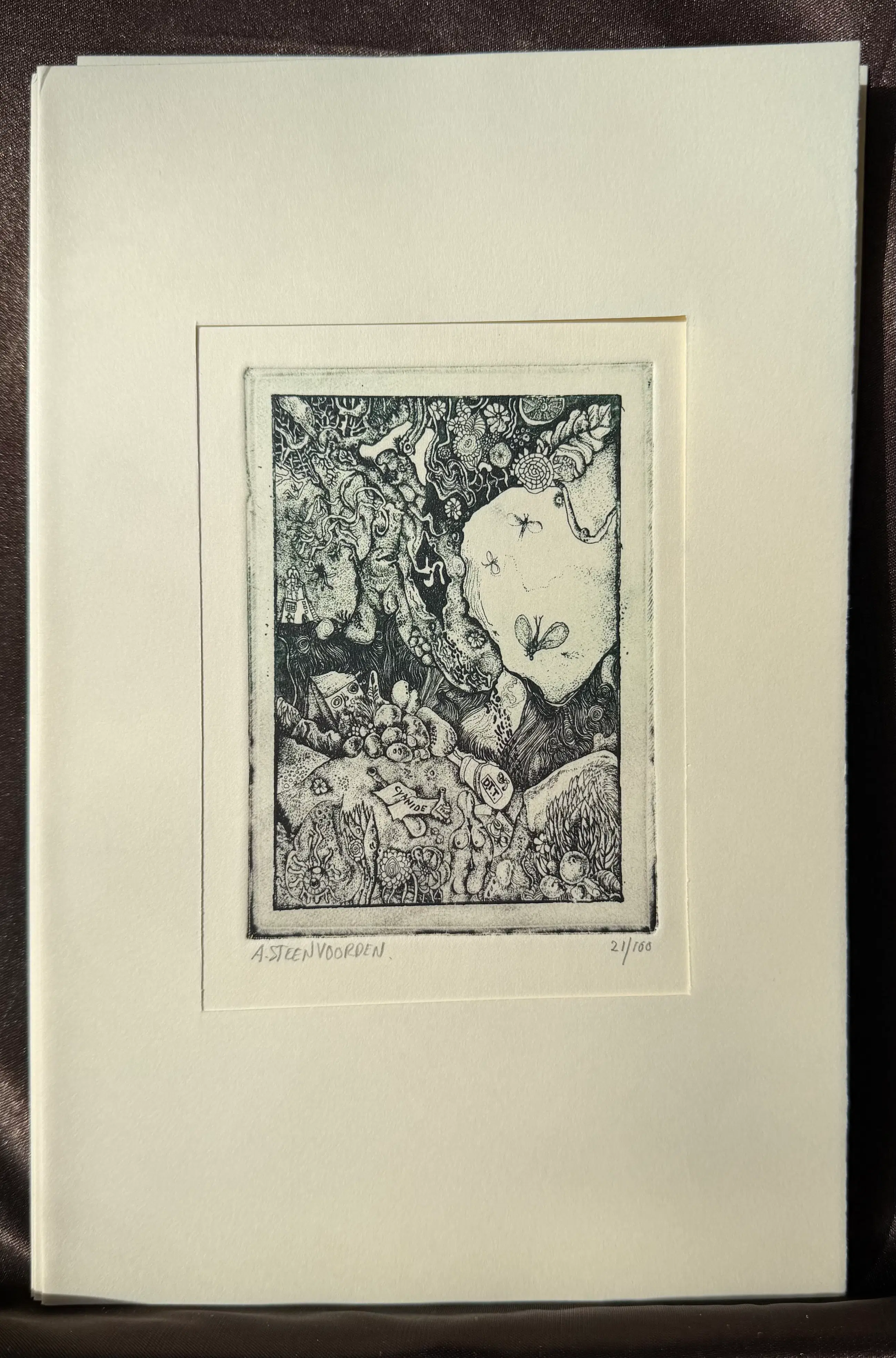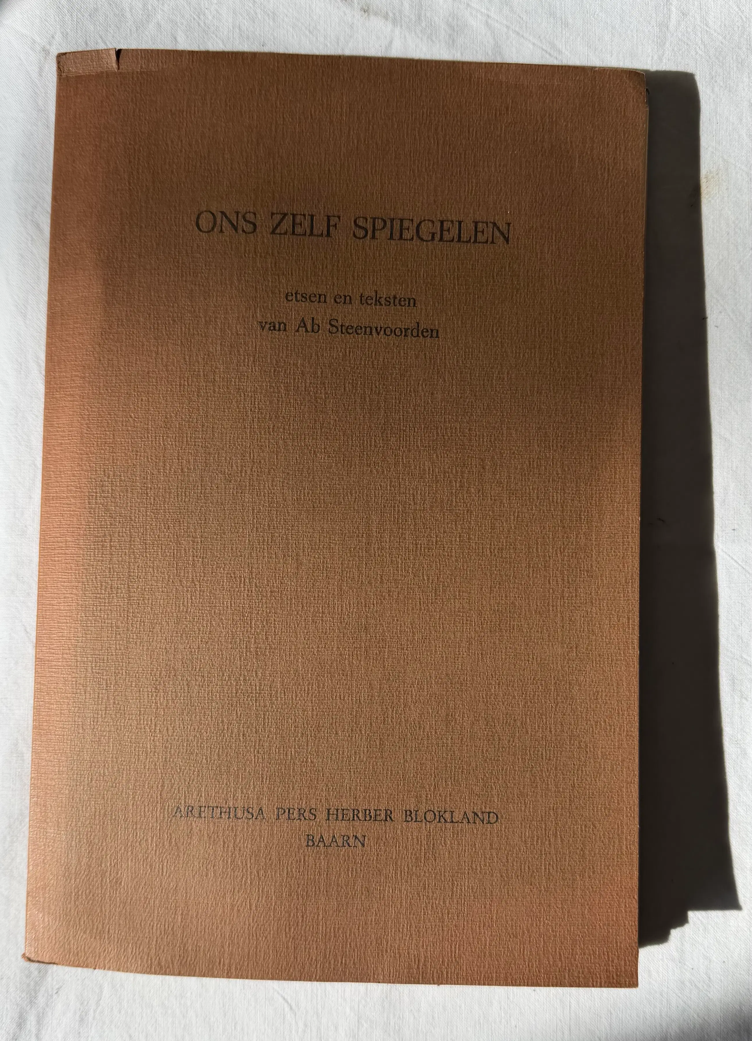 Etsen en teksten van Ab Steenvoorden in een papieren stofmapje.