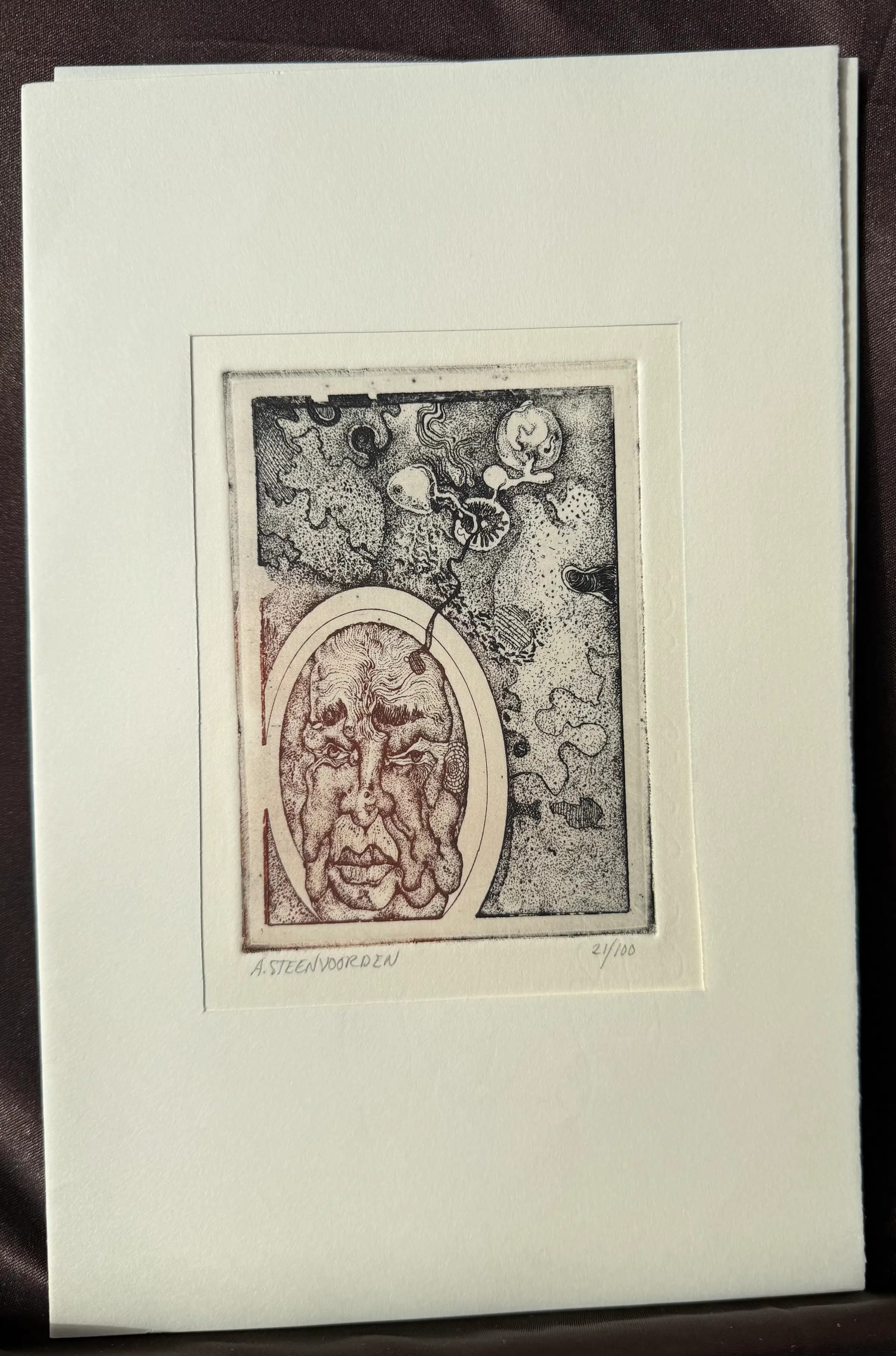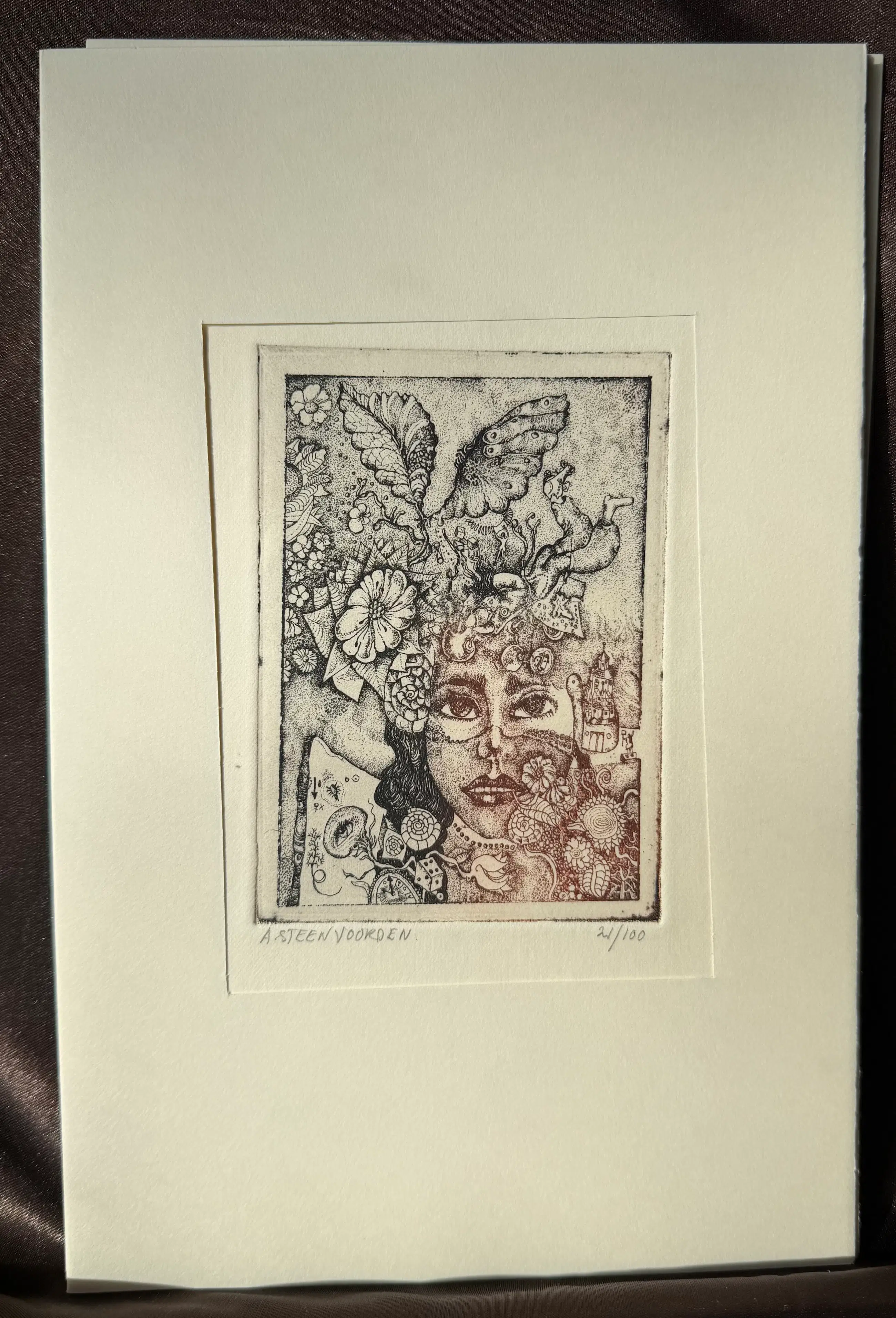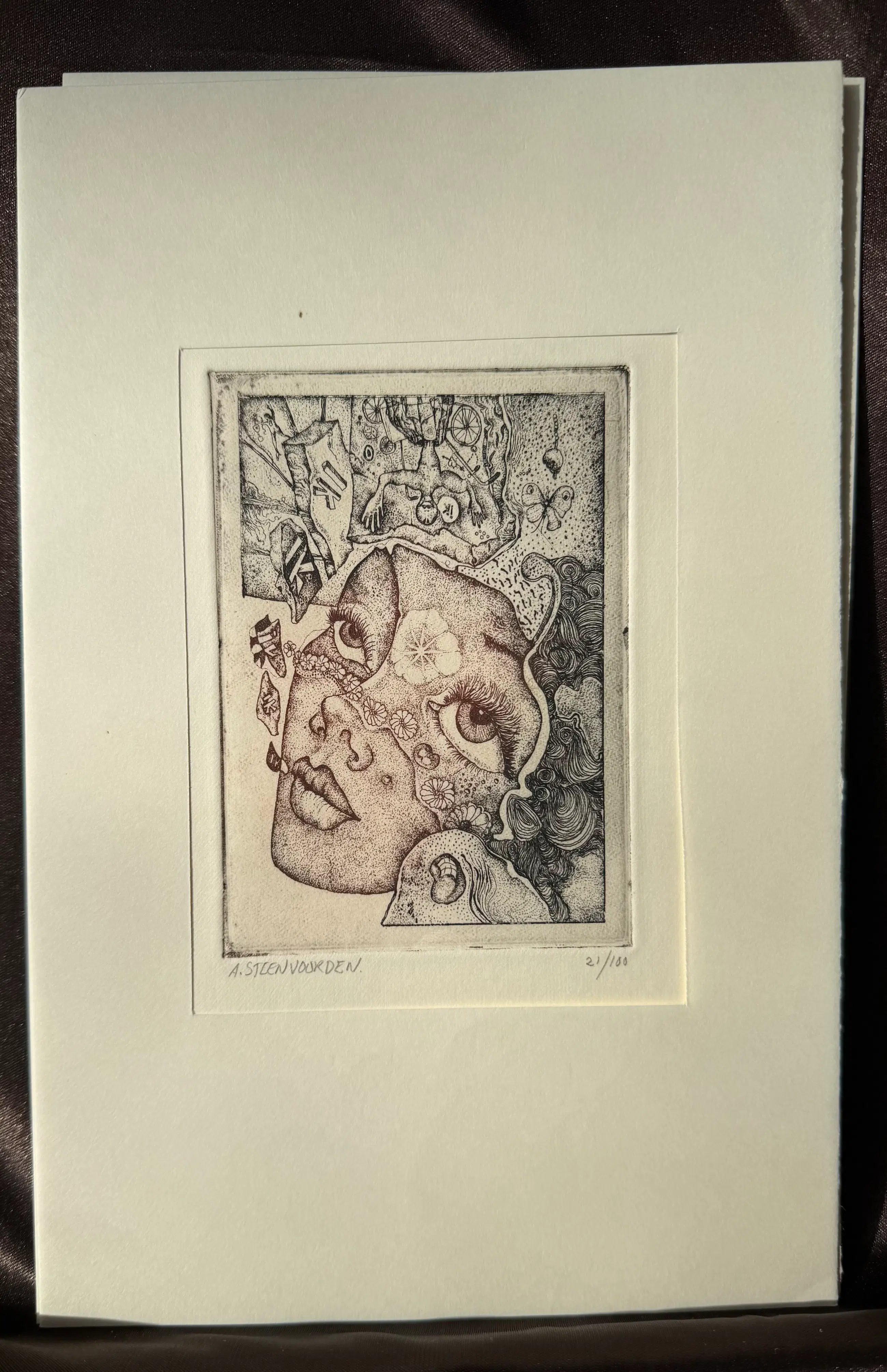 Etsen en teksten van Ab Steenvoorden in een papieren stofmapje.