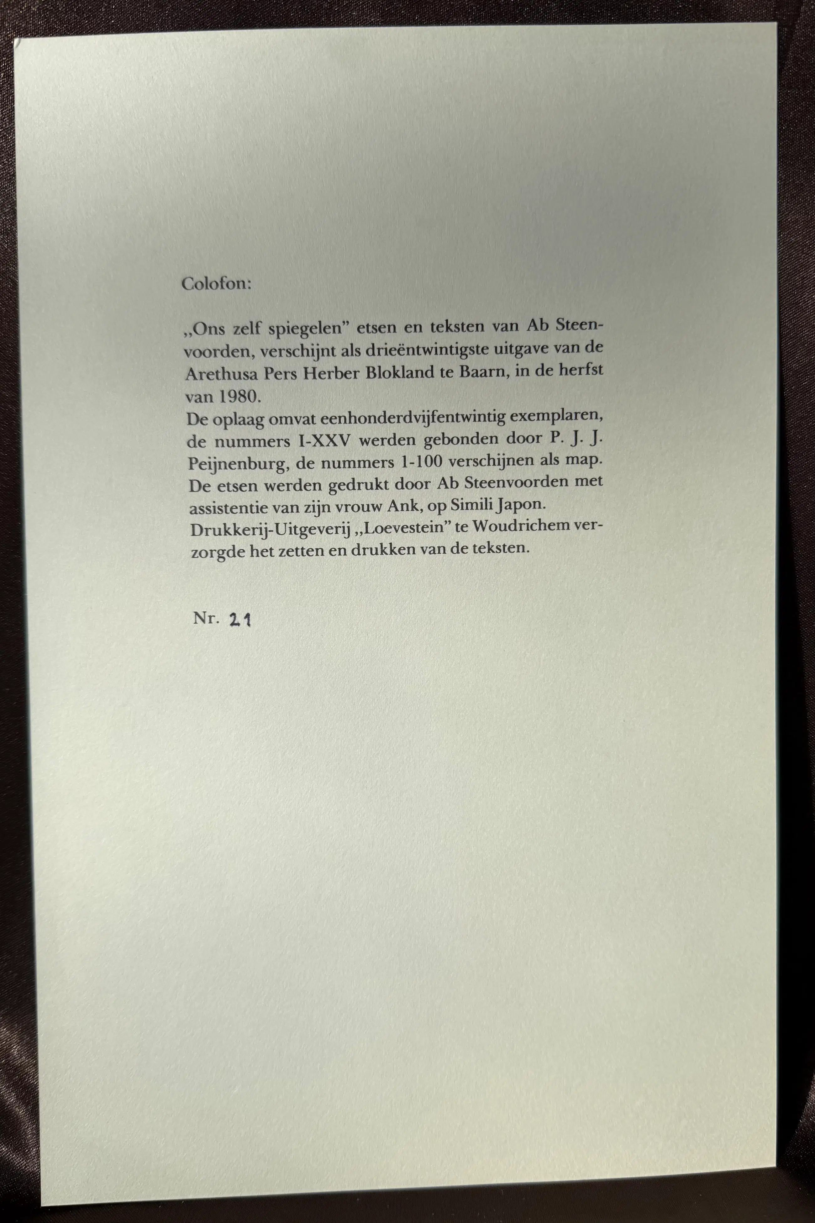 Uitgegeven in 1980 door Arethusa Pers Herber Blokland in Baarn; dit is nummer 21 van oplage van 100.