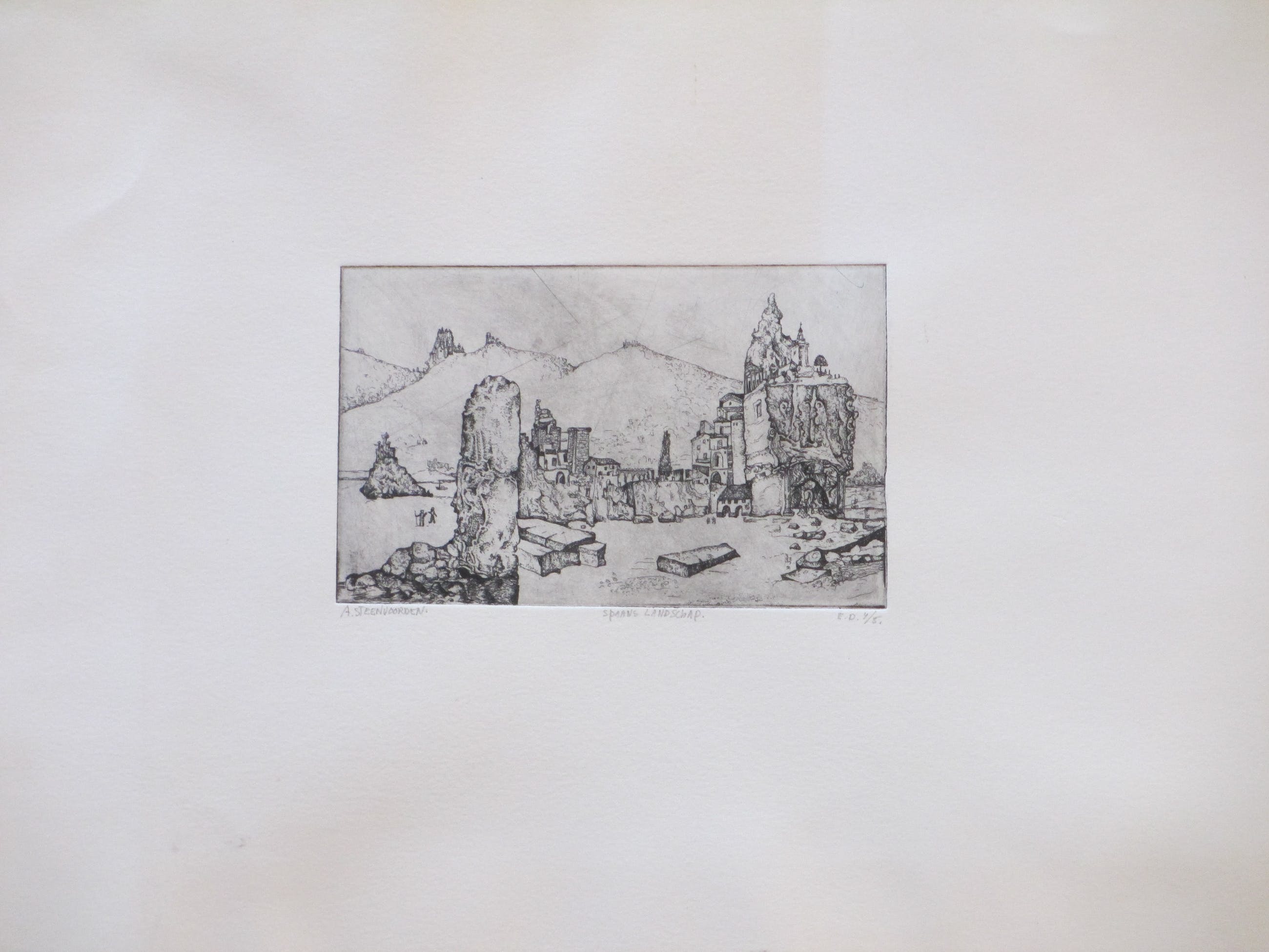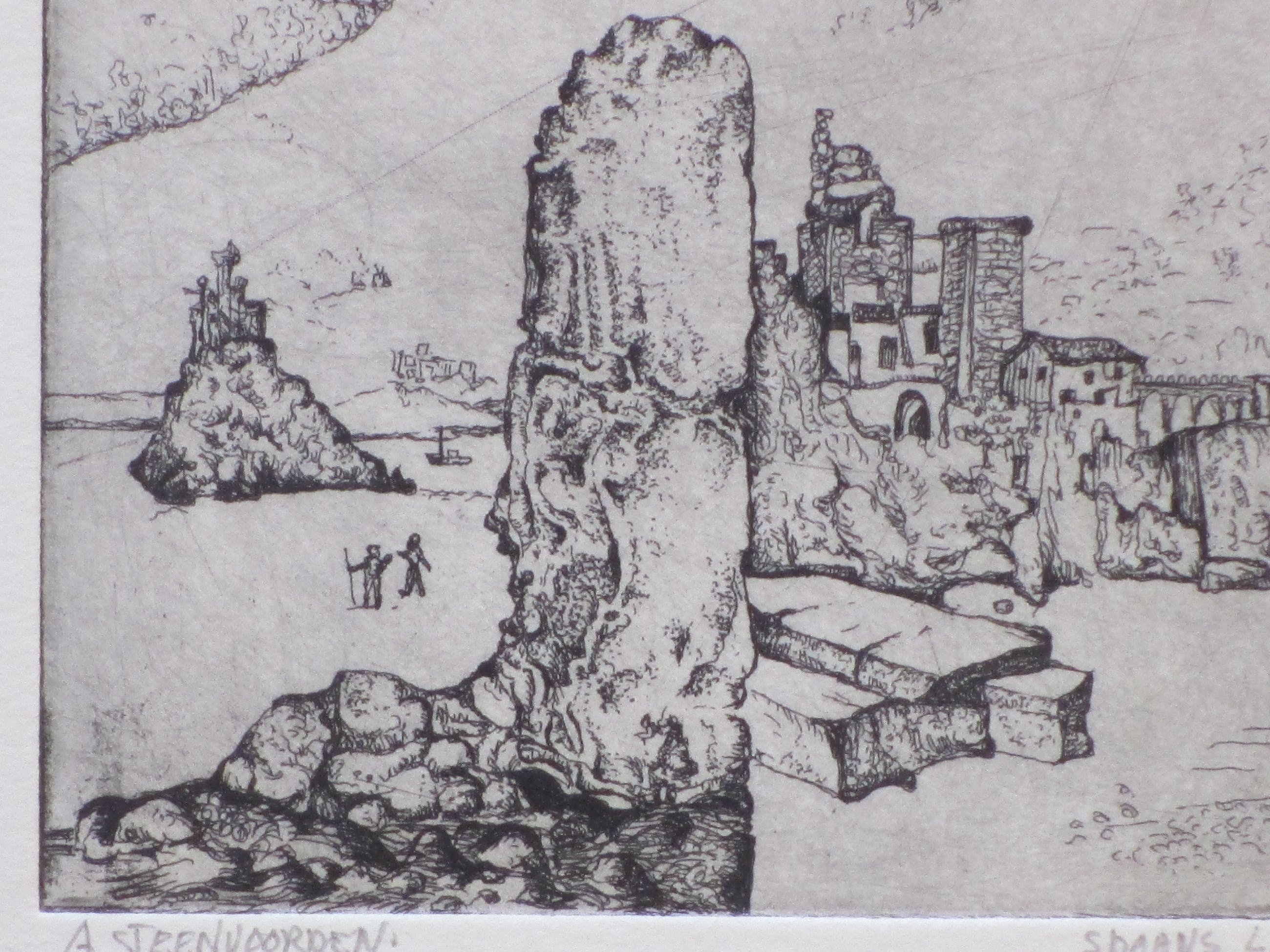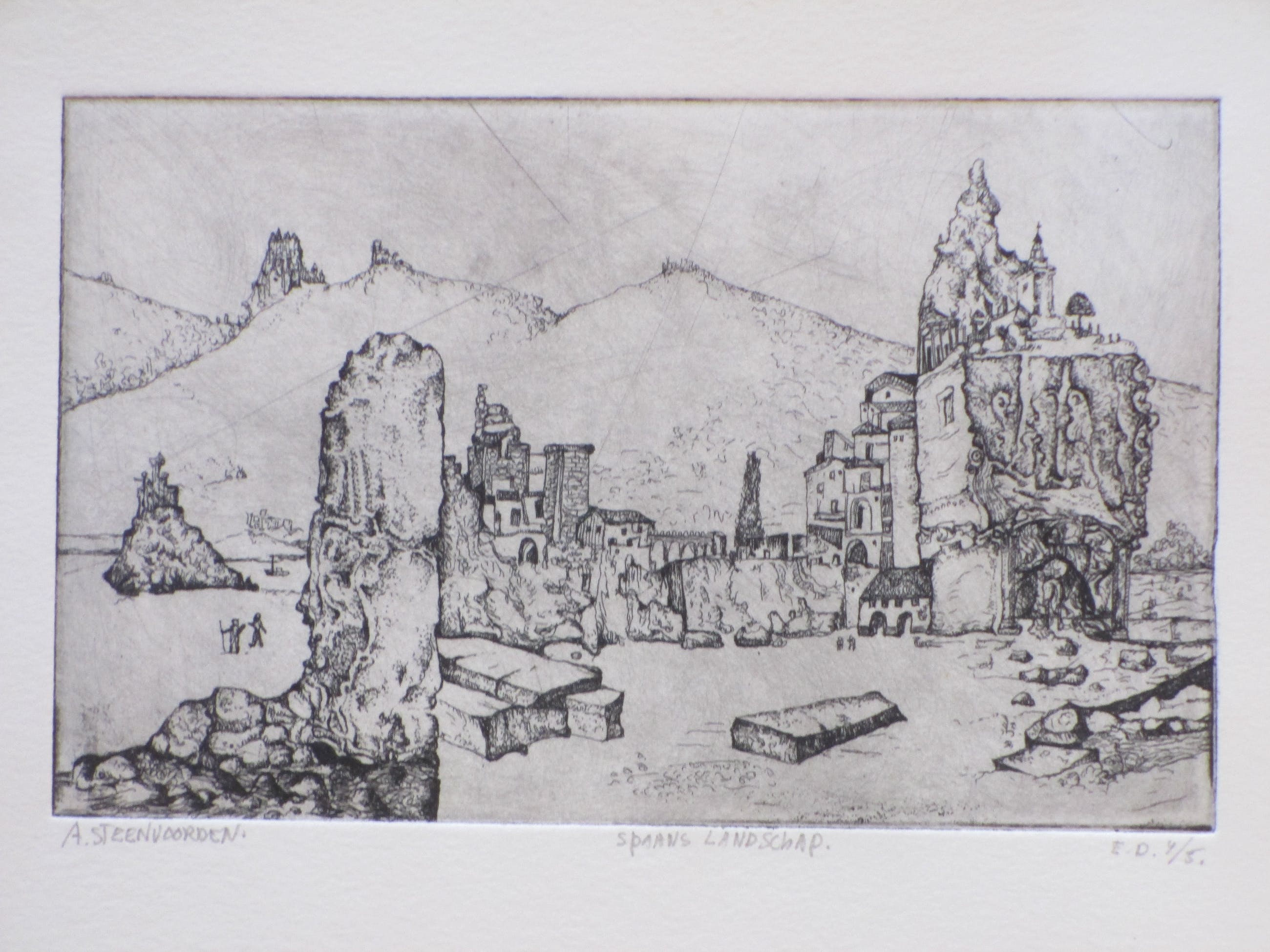 Ets door Ab Steenvoorden. Voorstelling van een imaginair Spaans landschap. Losbladig, beeldmaat 10x16, bladmaat 32x50 Gesigneerd in potlood l.o.: 'A. Steenvoorden'. Getiteld m.o.: 'Spaans landschap'. en genummerd r.o.: 'E.D. 4/5'