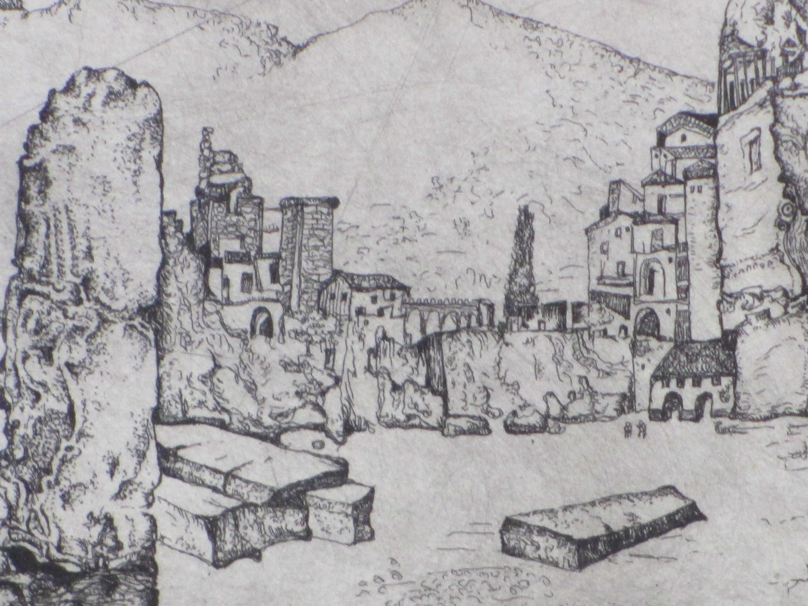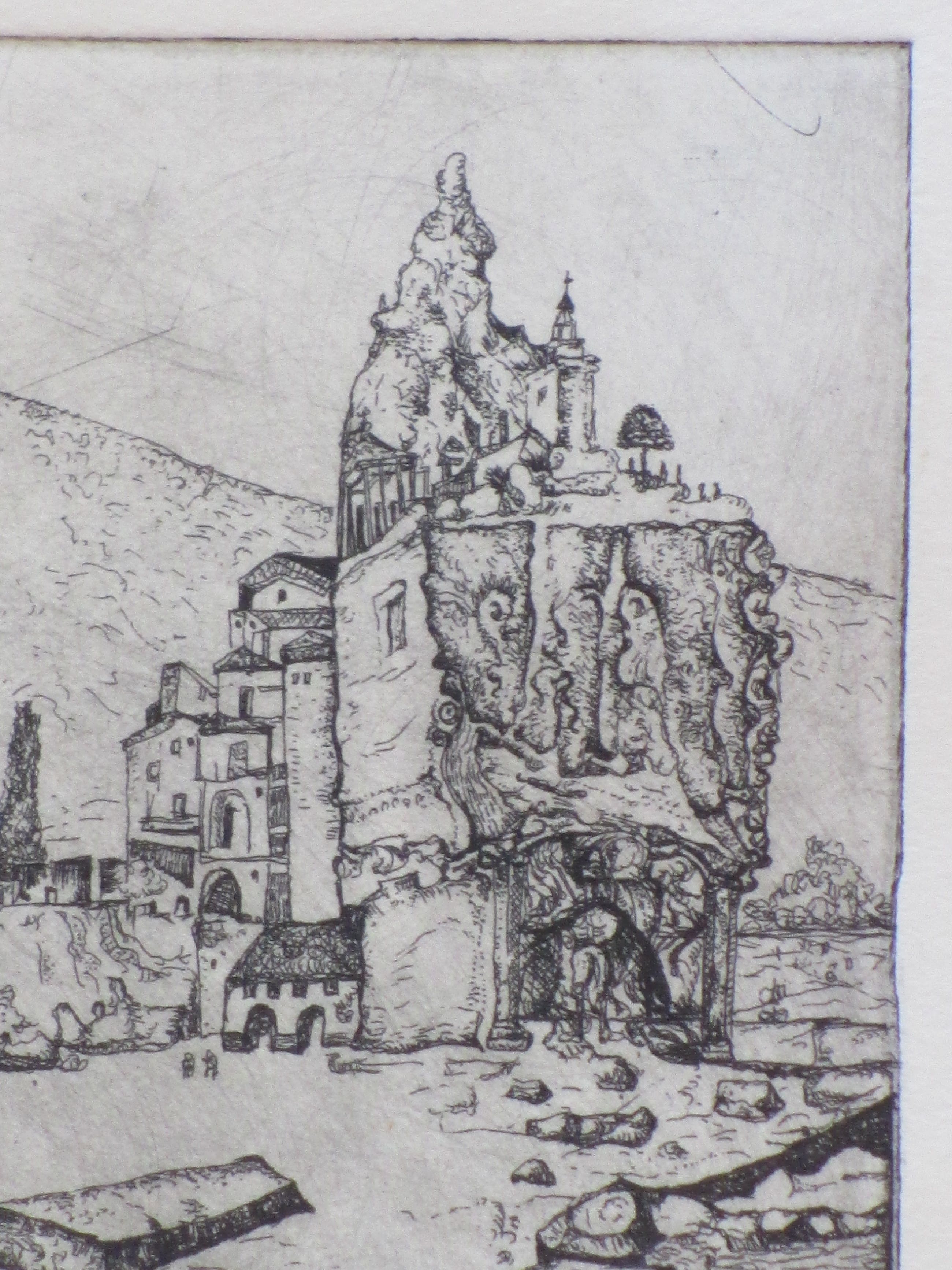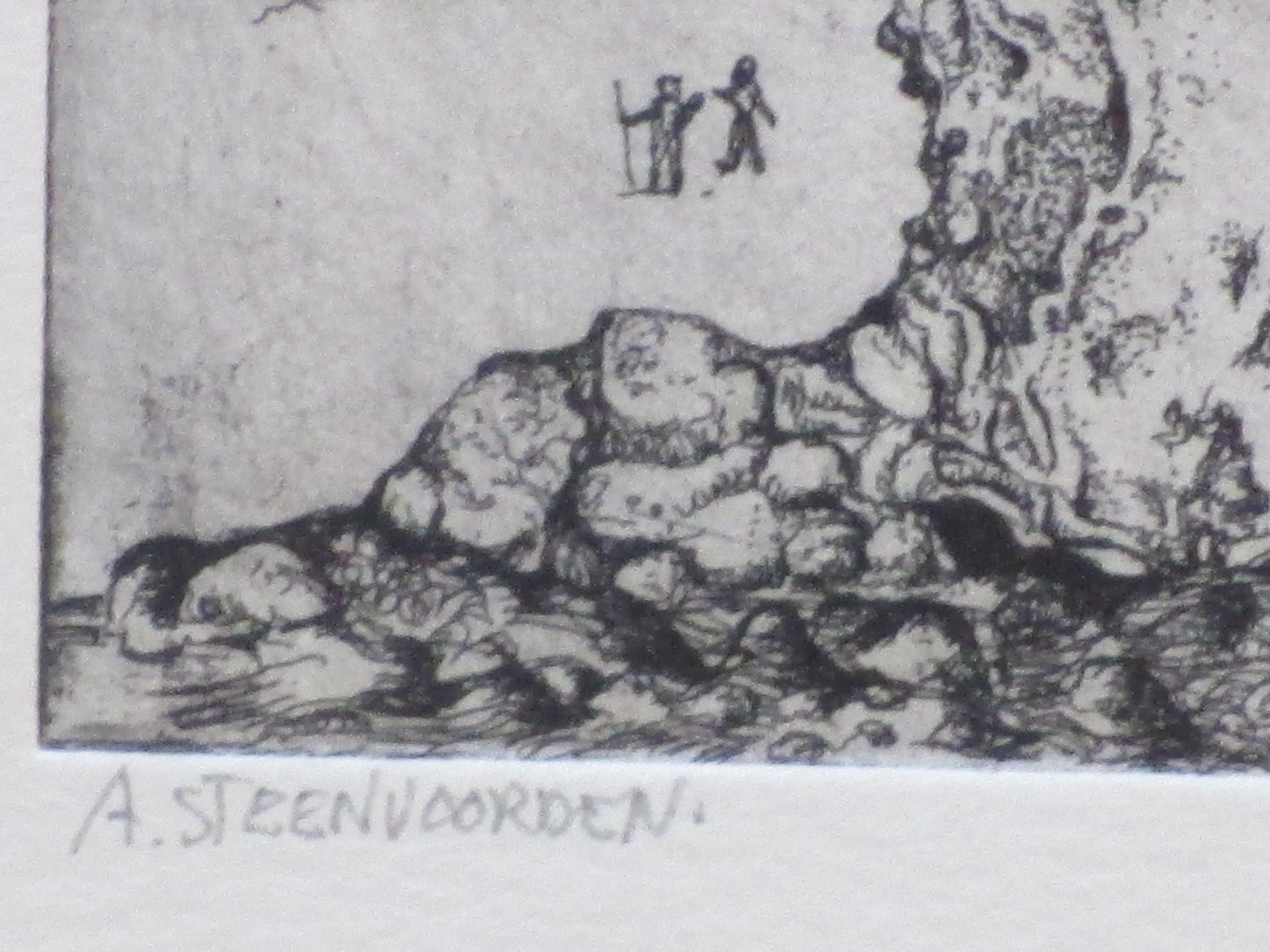 Ets door Ab Steenvoorden. Voorstelling van een imaginair Spaans landschap. Losbladig, beeldmaat 10x16, bladmaat 32x50 Gesigneerd in potlood l.o.: 'A. Steenvoorden'. Getiteld m.o.: 'Spaans landschap'. en genummerd r.o.: 'E.D. 4/5'
