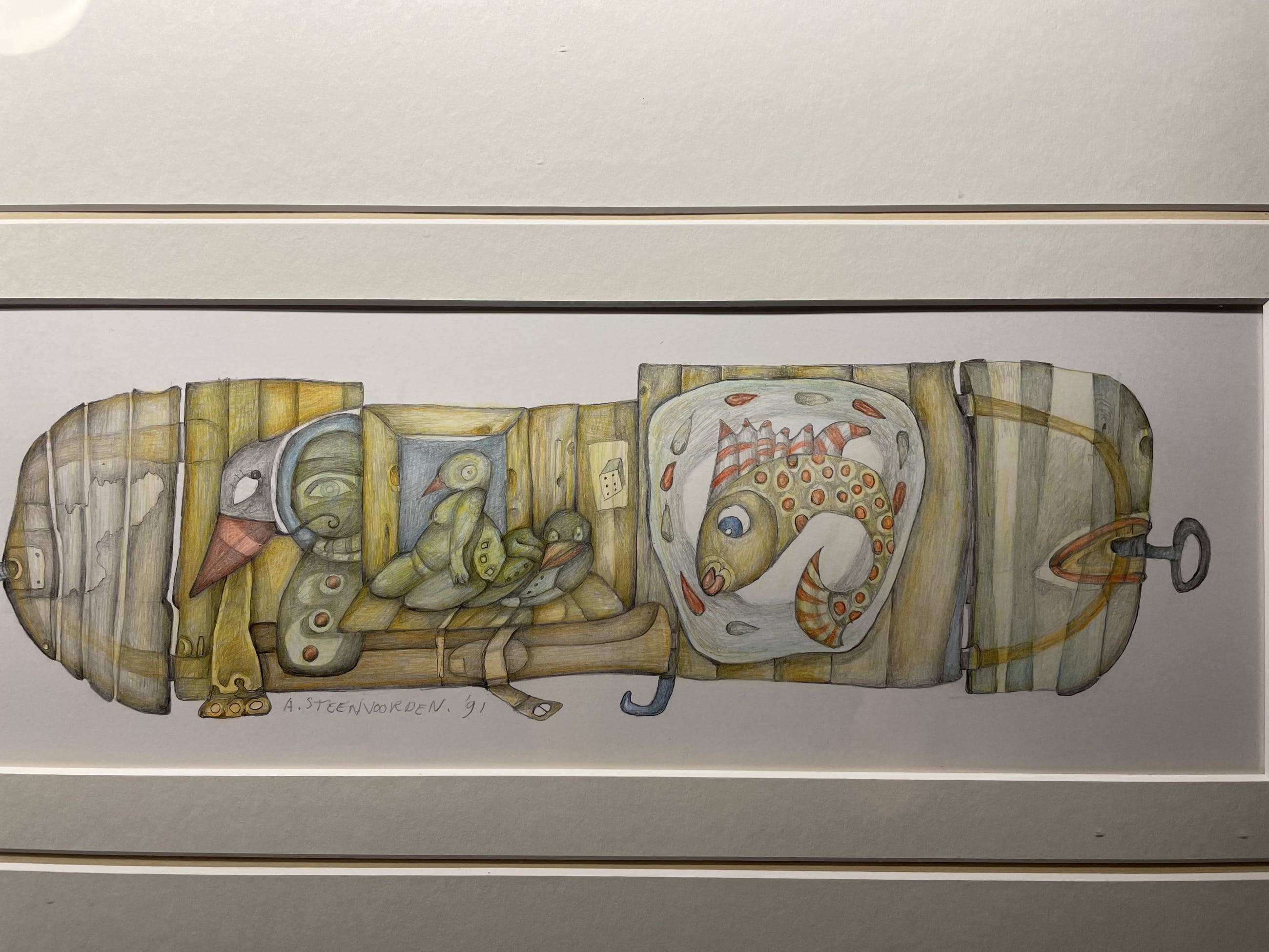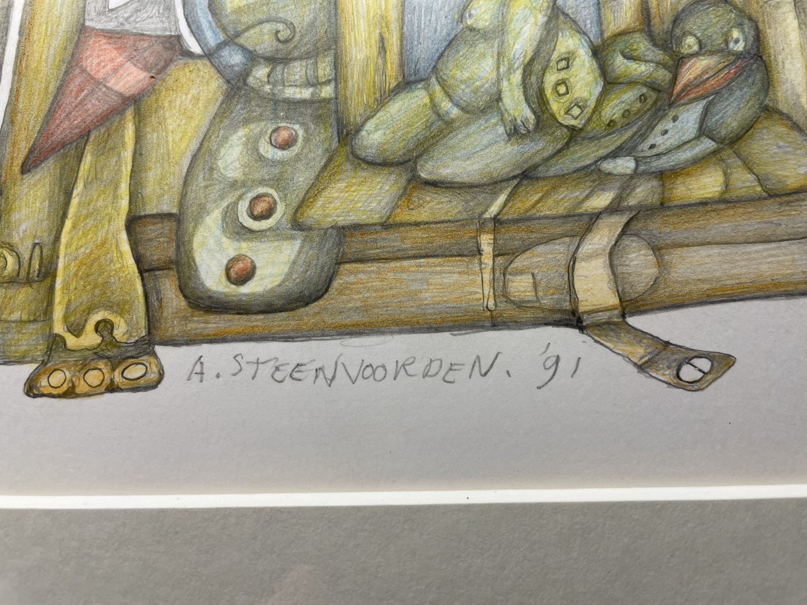 Origineel werk van Ab Steenvoorden uit 1991. Kleurentekening. Binnenkant pass-partout is 14x43 cm. Werk kan worden opgehaald of verstuurd. In overleg te bepalen of het ingelijst wordt verstuurd, dan wel als losse prent met passe-partout.