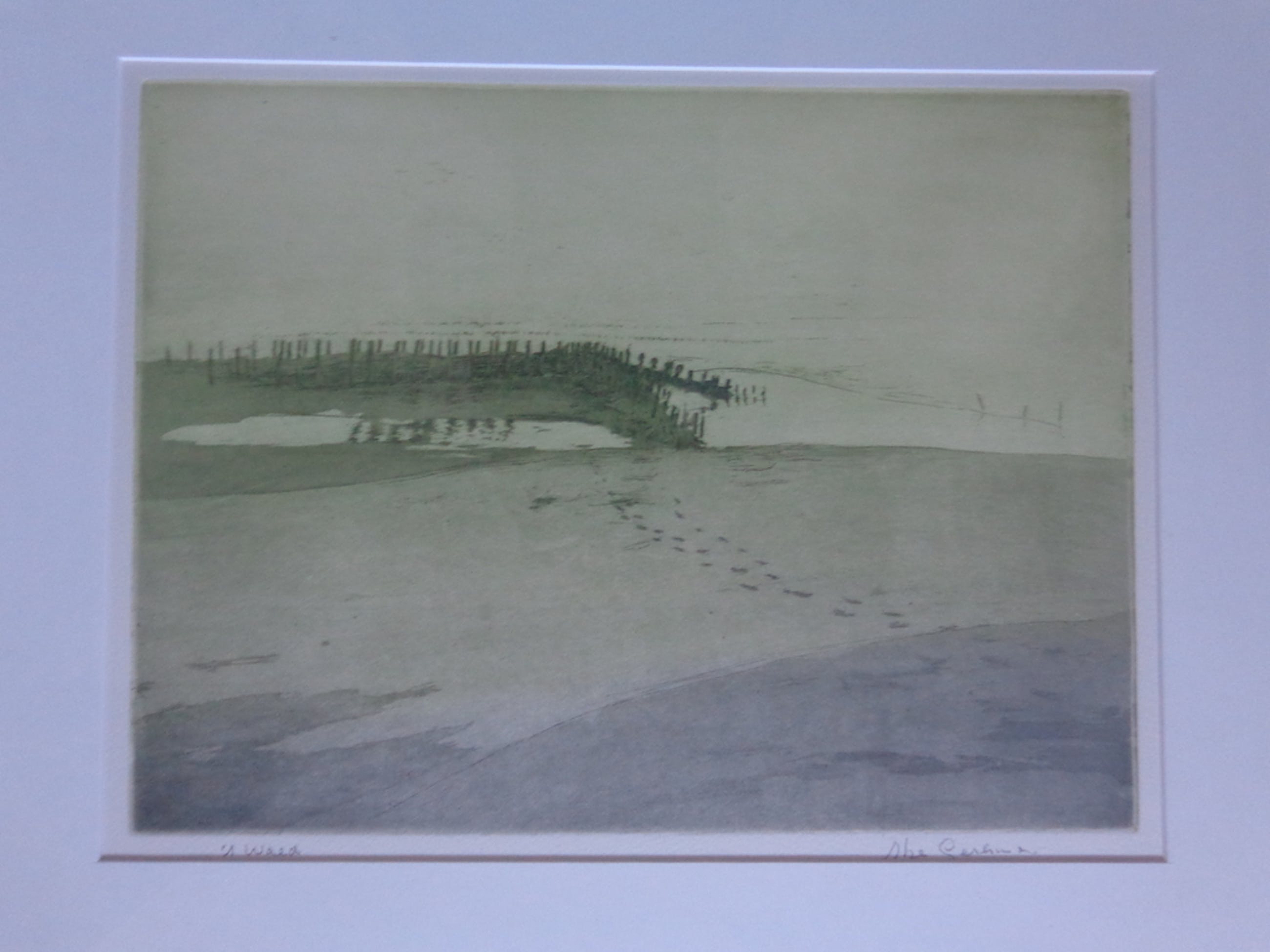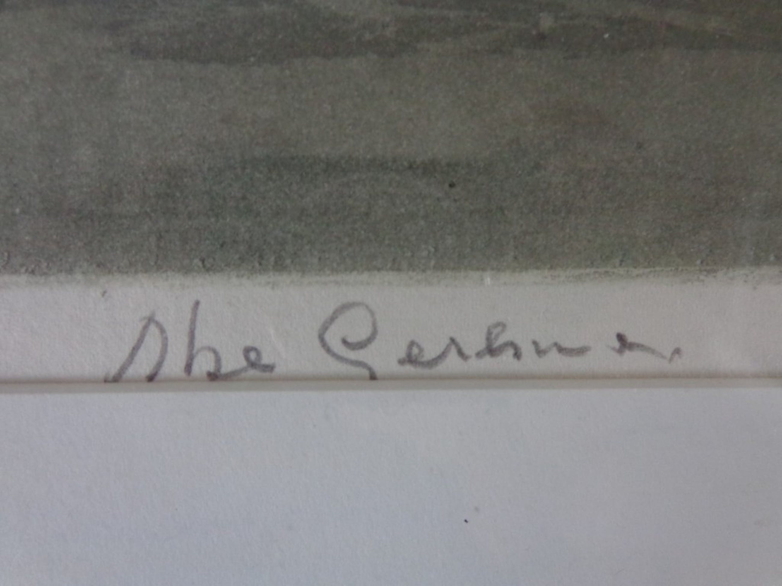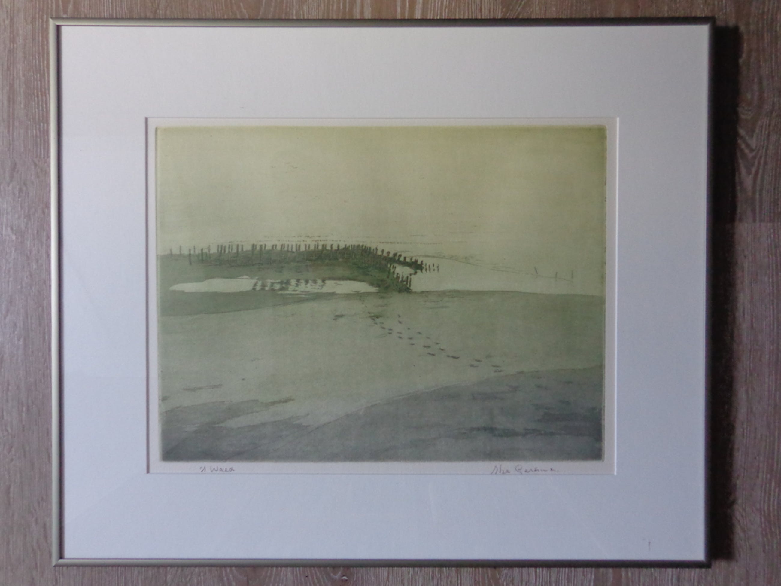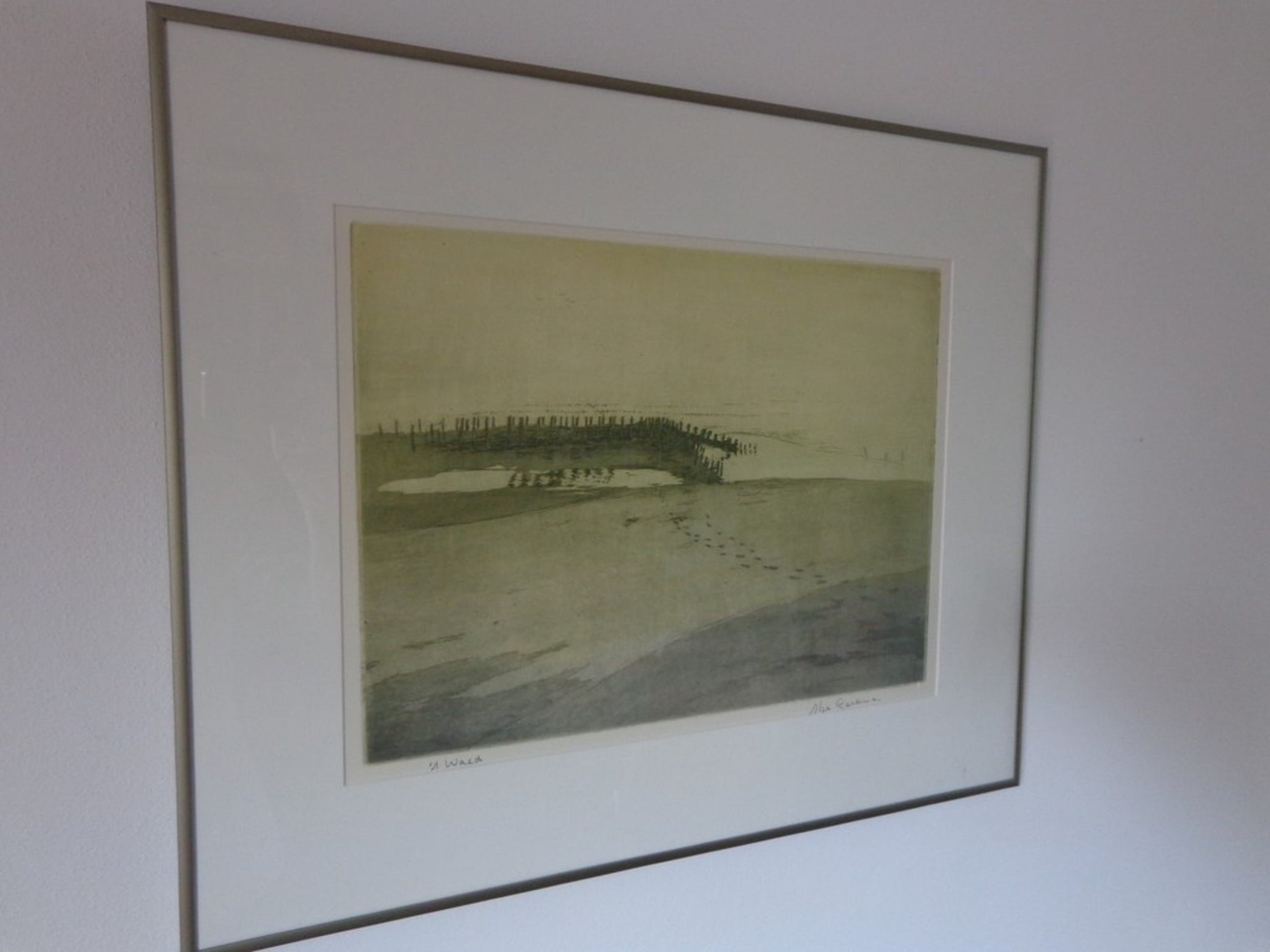 Mooie kleurets van de Friese kunstenaar Abe Gerlsma, befaamd om zijn grote kleuretsen van het Friese landschap, zie publicatie: Abe Gerlsma, zijn werk zijn leven (Leeuwarden 2008) pagina 138. Ingelijst, buitenmaat 58 x 48, binnenmaat passepartout 42 x 32.