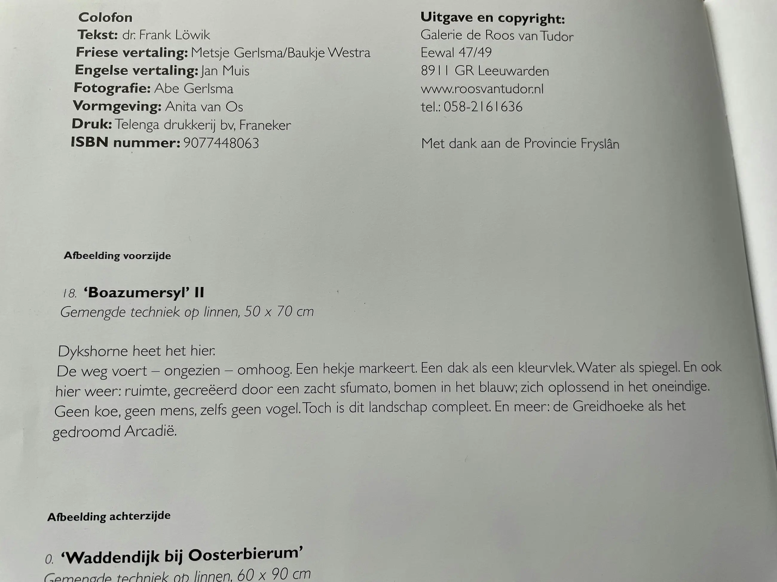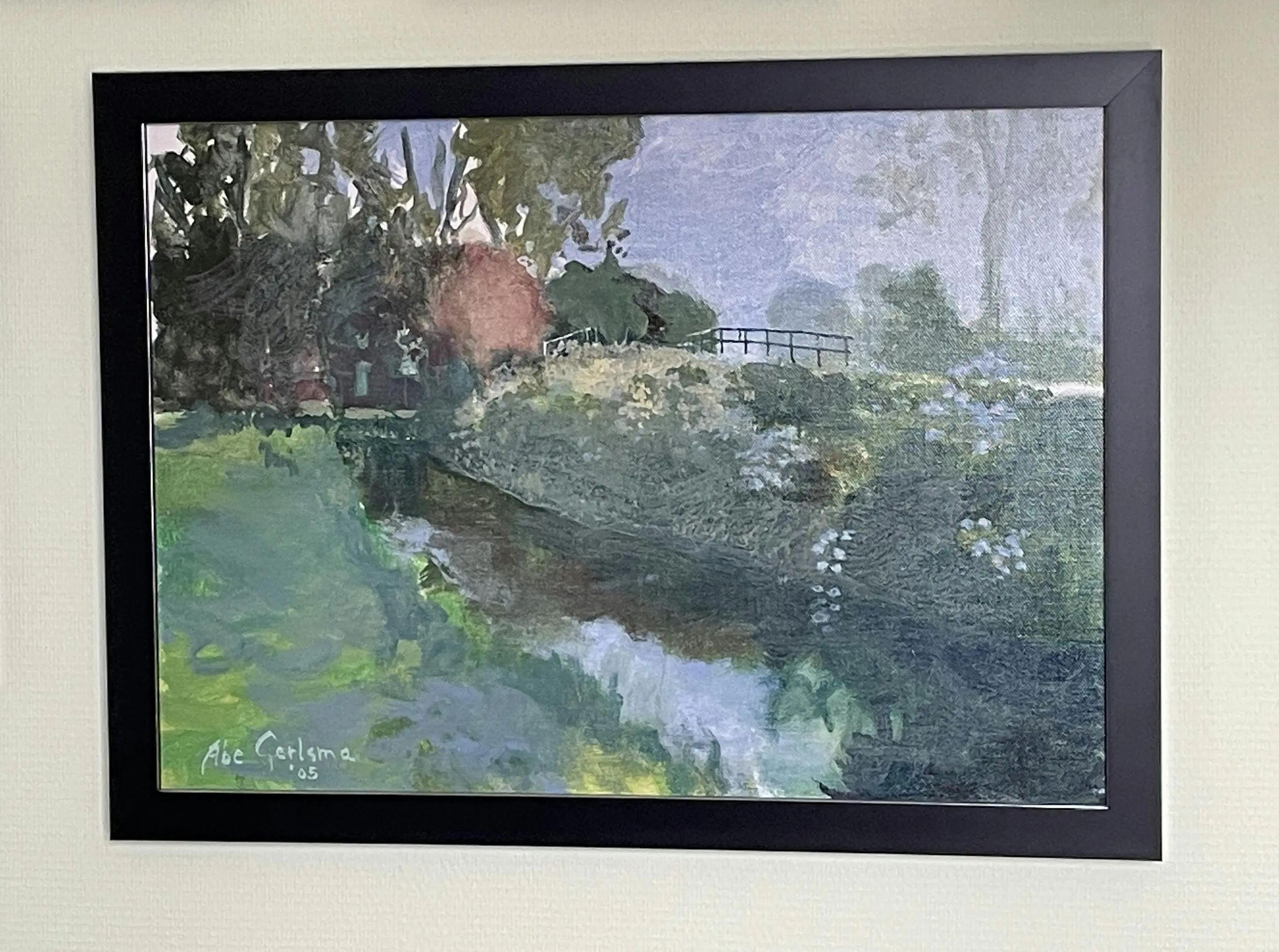 Landschap in Friesland. Een weg, een bruggetje, water, een boerderij. Zacht geschilderd. Mooie frisse kleuren.