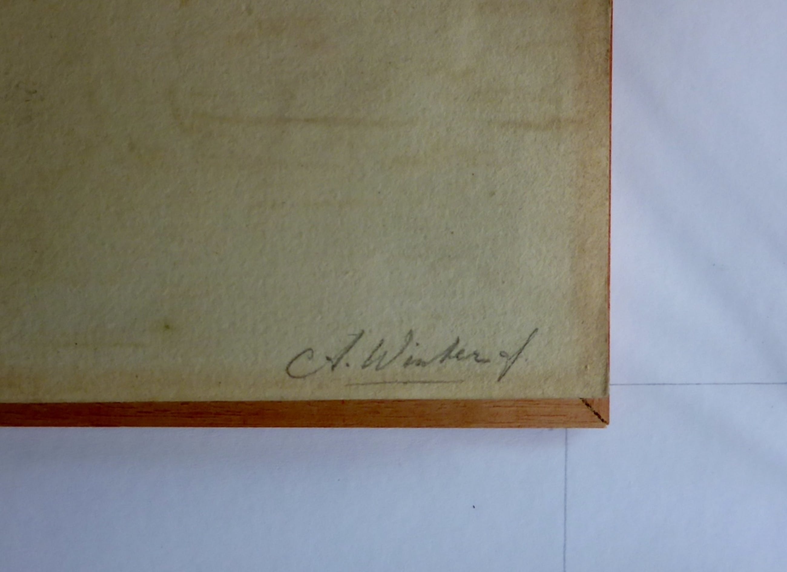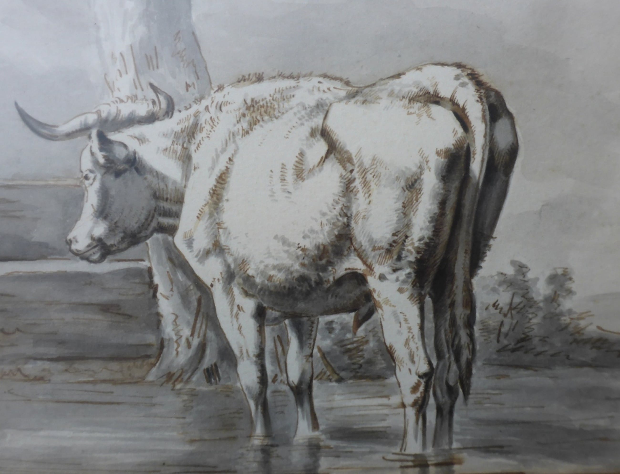 Een mooie deels ingekleurde aquarel van een rund van de Nederlandse kunstenaar Abraham Hendrik Winter (1800-1861). Maat van het werk is 20 x 15 cm en met lijst 50 x 44 cm. Voorzien van ontspiegeld glas. De aquarel is aan de achterzijde gesigneerd: A Winter f. Hij signeerde overigens ook vaak met AWF.