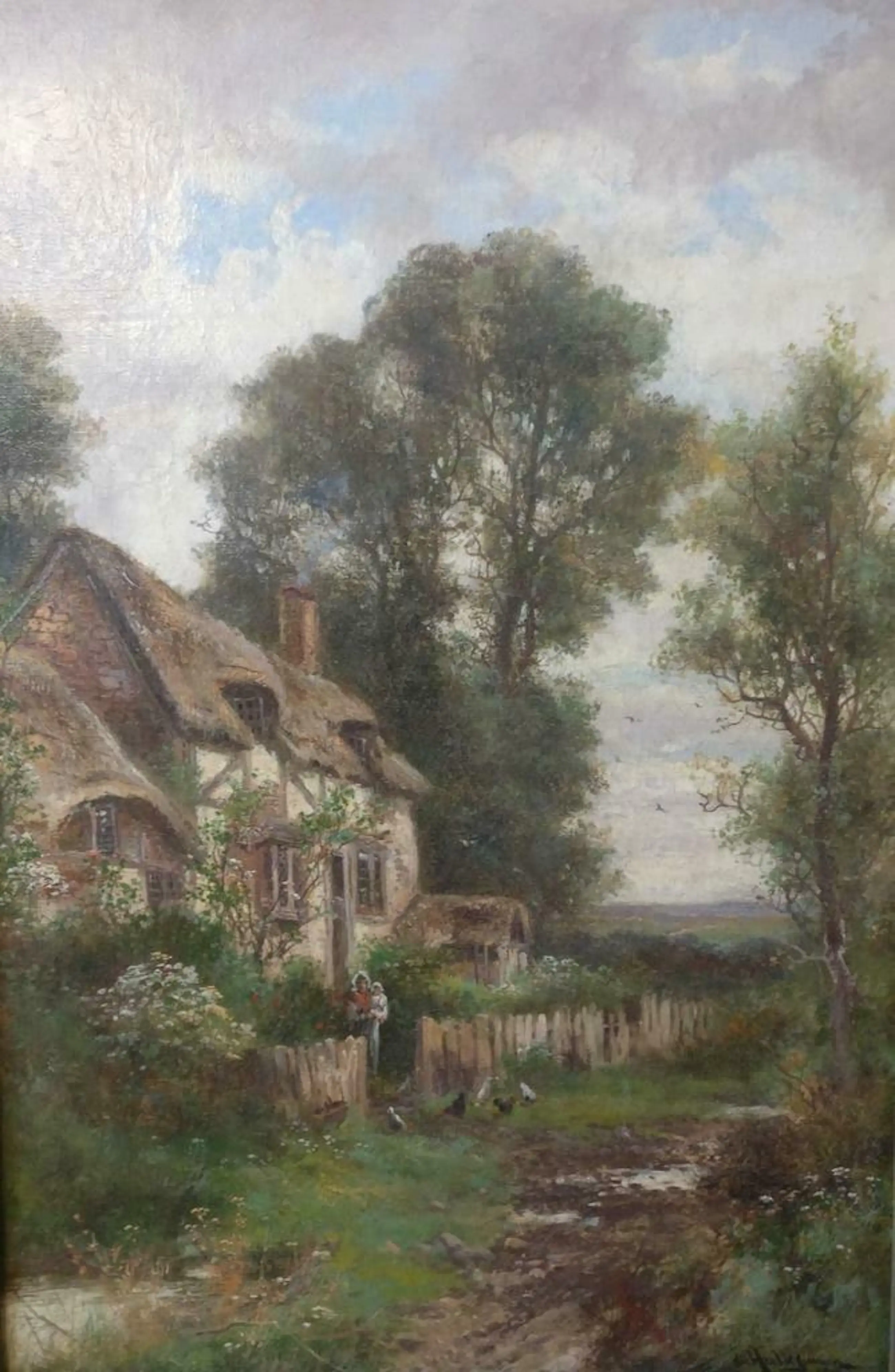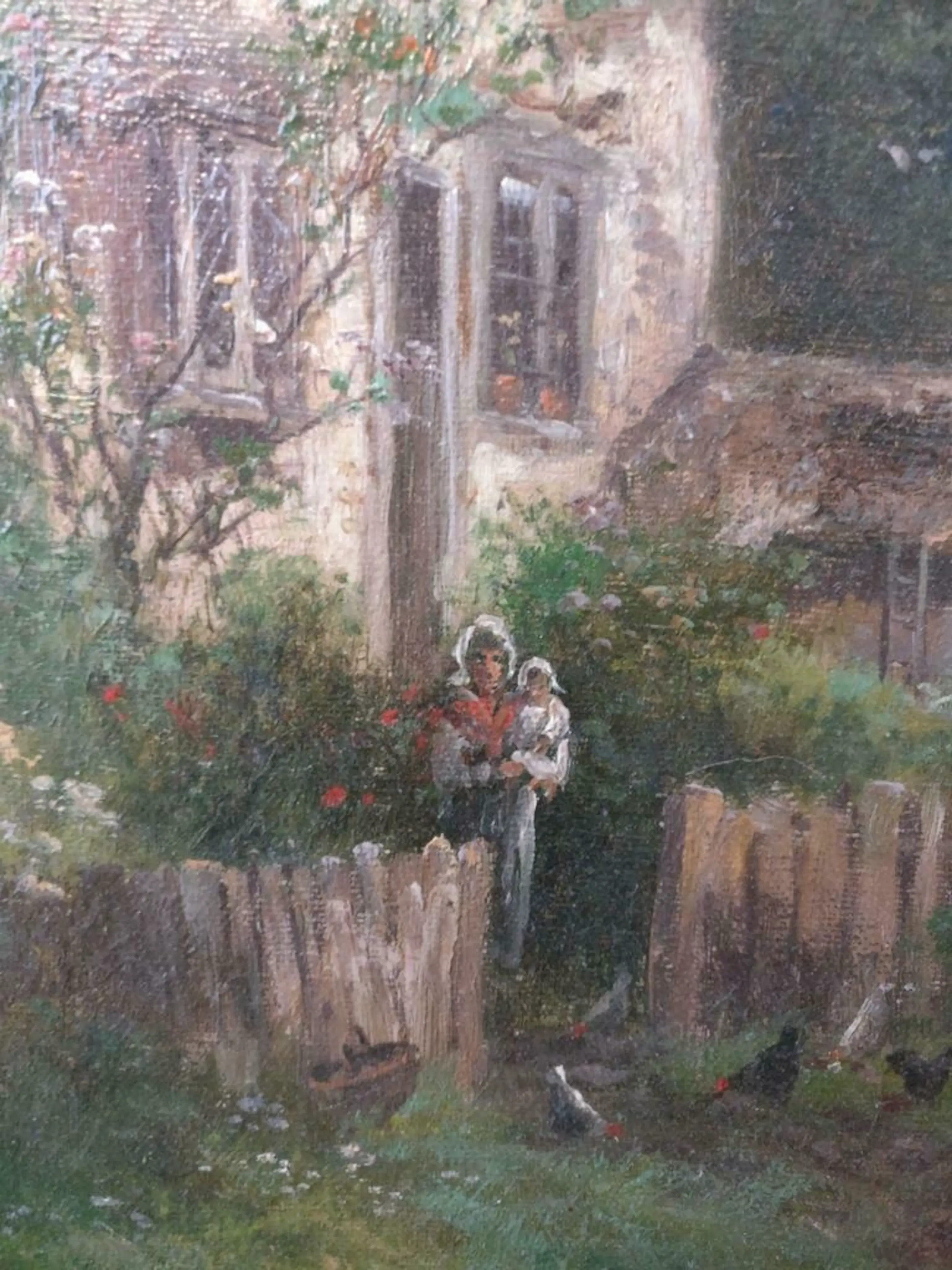 Op dit boerderijzicht speelt zich een waar verhaal af. Kijk naar het zeer knap geschilderde huis, de scharrelende kippetjes, de vogels in de lucht. Het werk kent een grootheid in de samenstelling van de vormen, vol en rijk geschakeerde kleur. De composite is evenwichtig en statig en vol kracht zijn de bomen tegen de achtergrond van de lucht.