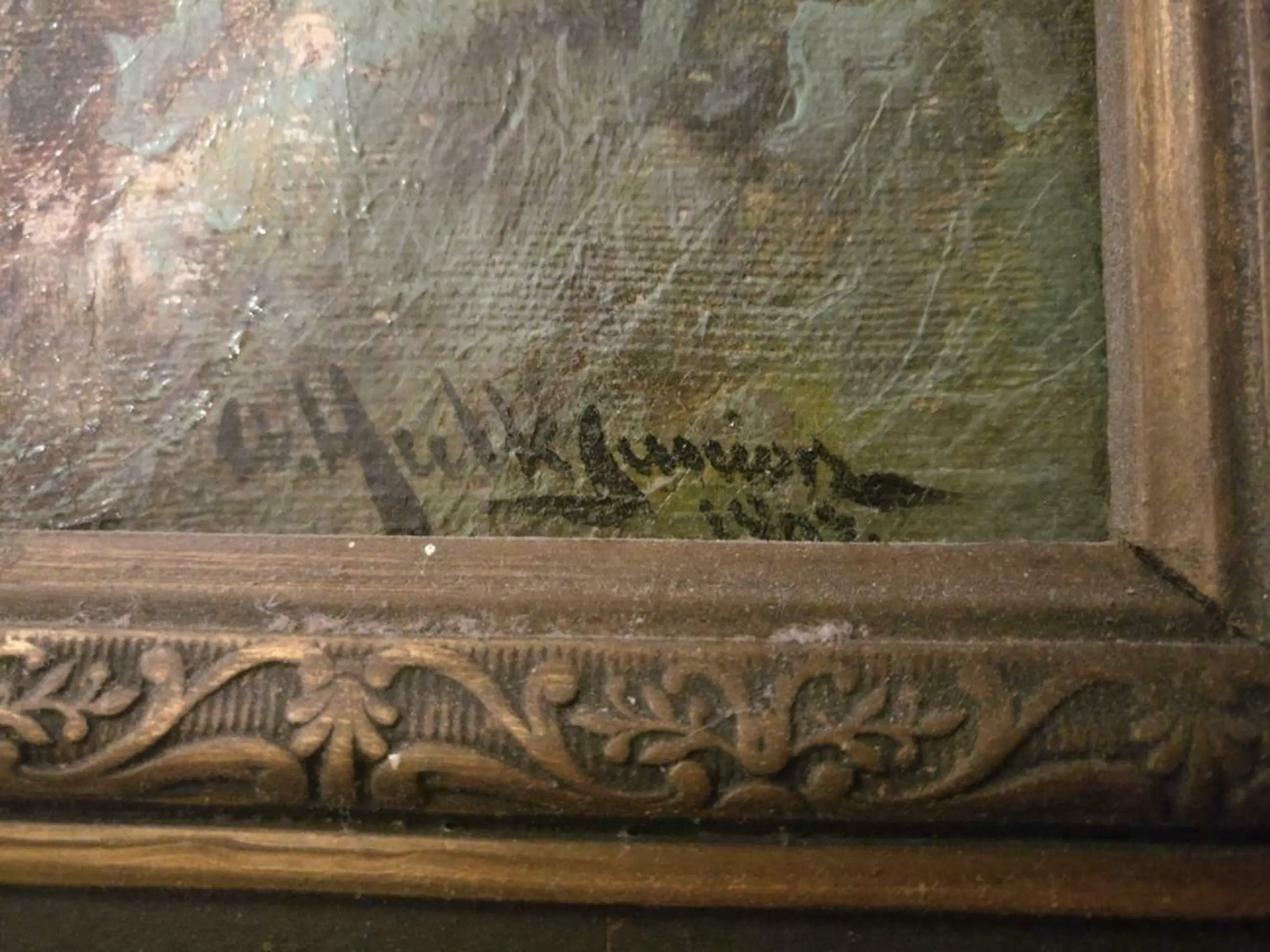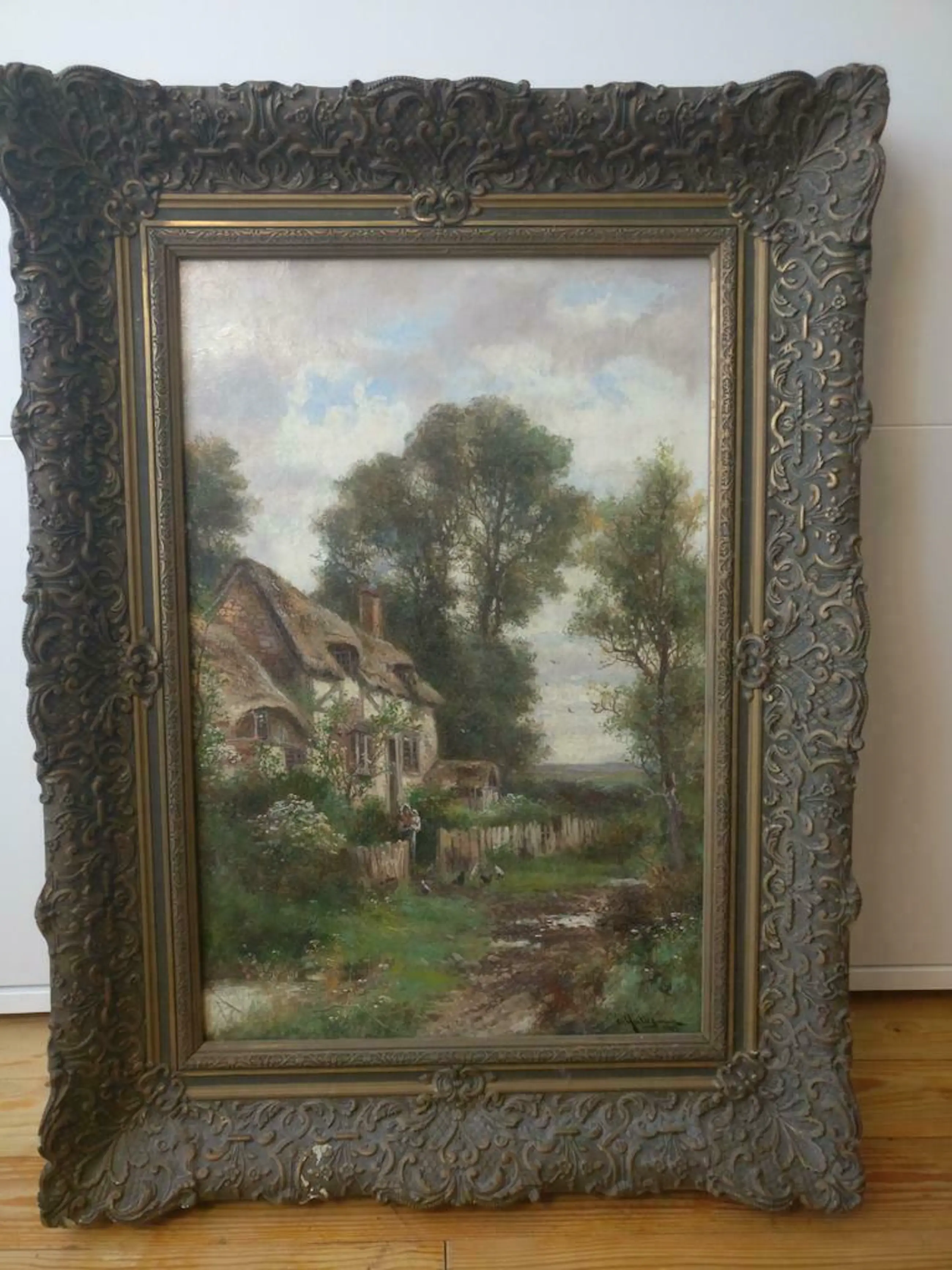 De conditie van het schilderij is uitstekend, de lijst is vrijwel intact en krijgt u er gratis bij.
