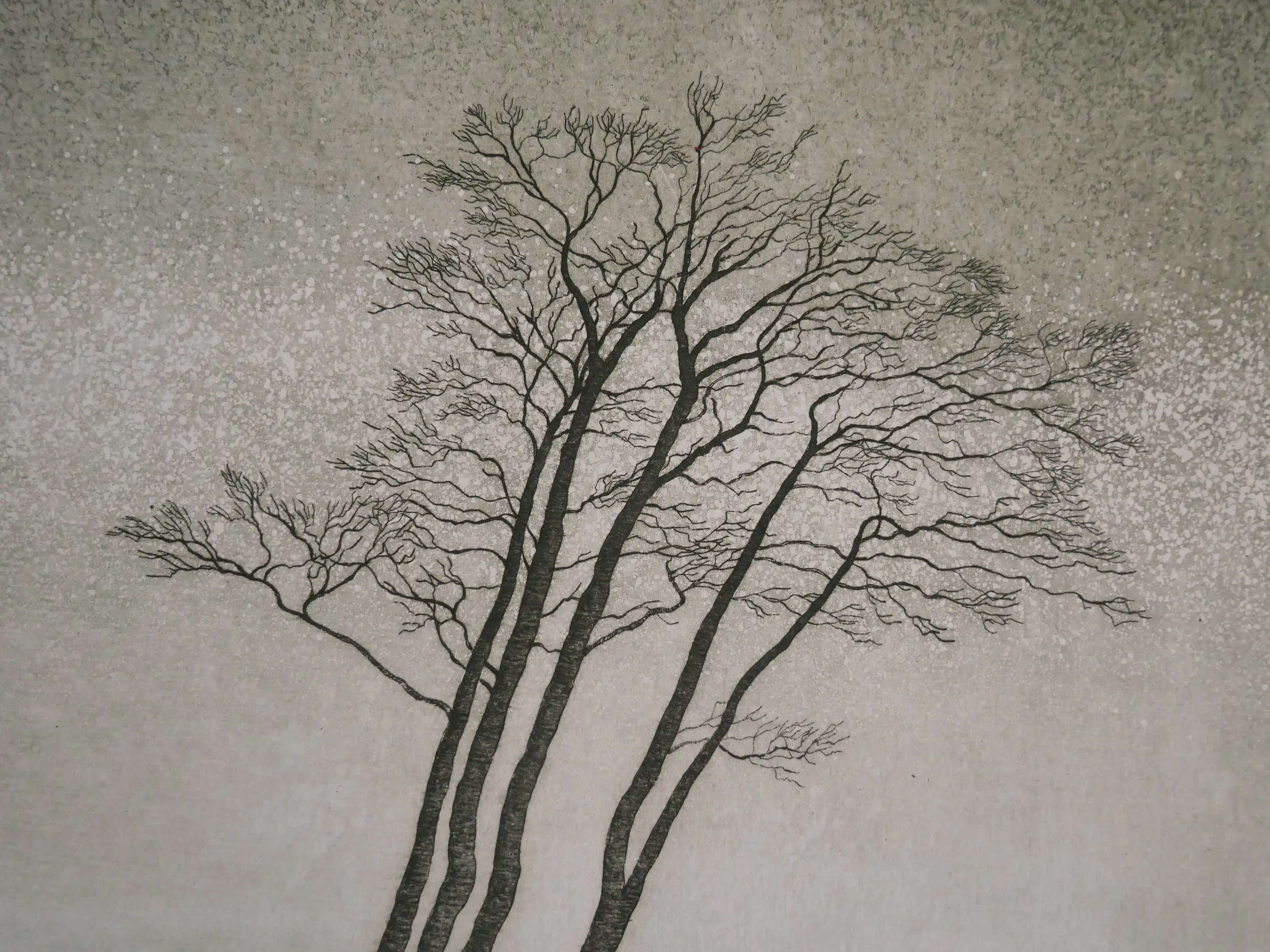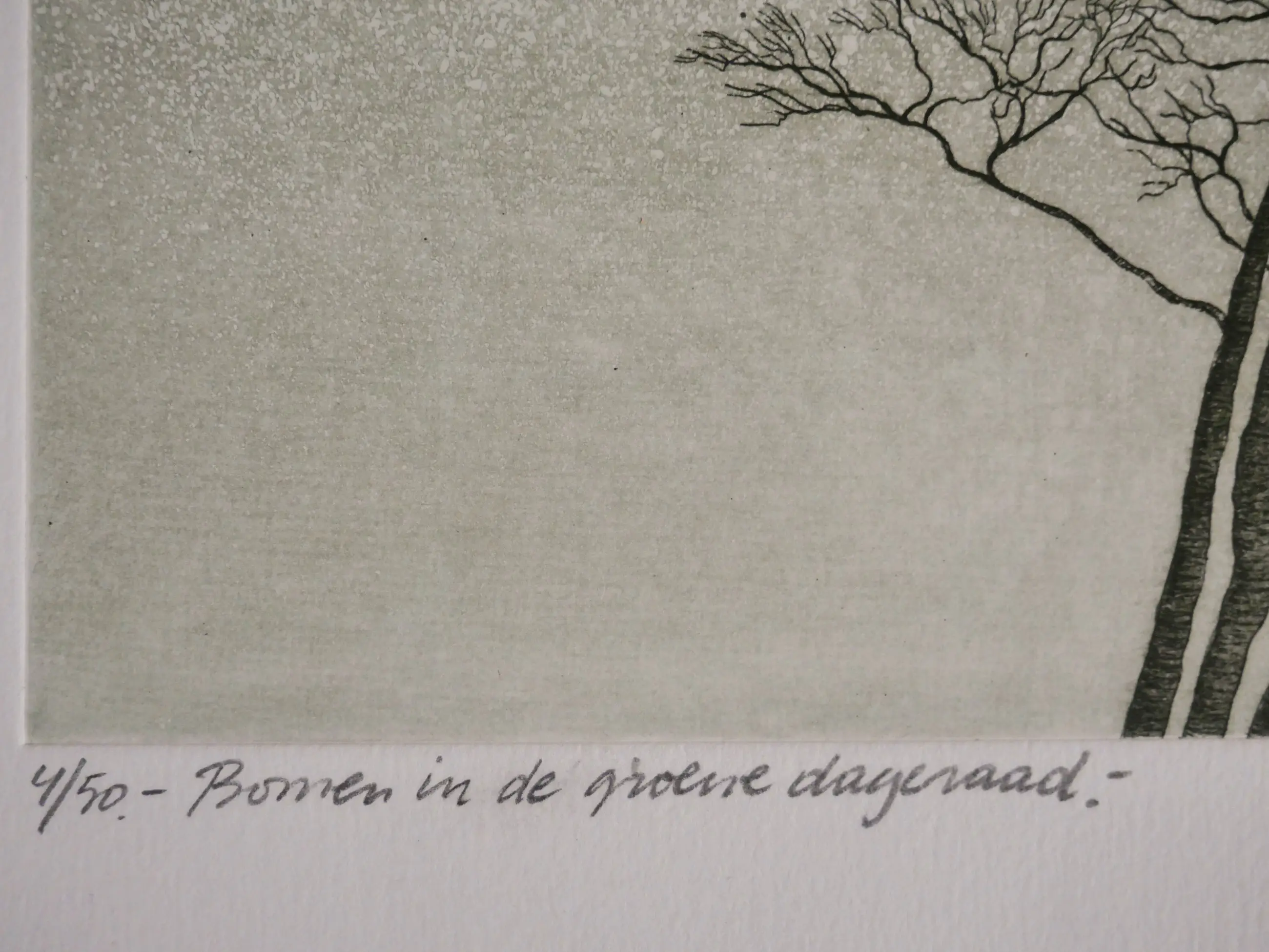Titel: Bomen in de groene dageraad Totale Afmetingen: H 50 cm X B 33 cm Afmetingen beeltenis: H 37 cm X B 27 cm Drager: Papier Gesigneerd: Lüttger Conditie: Uitstekend