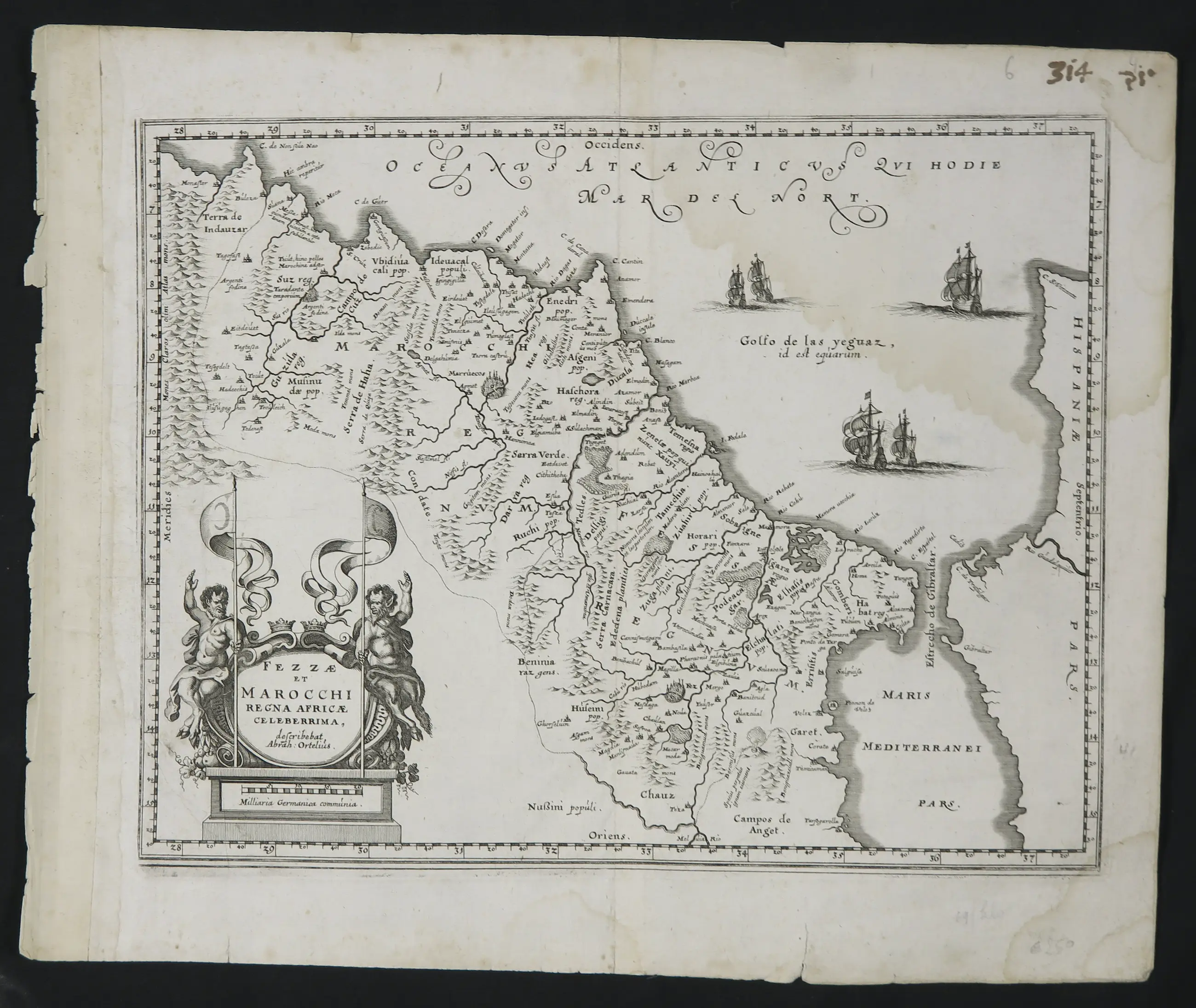 Kopergravure door de zevende-eeuwse cartograaf Abraham Ortelius. Het betreft de kaart van Fez /Marokko.