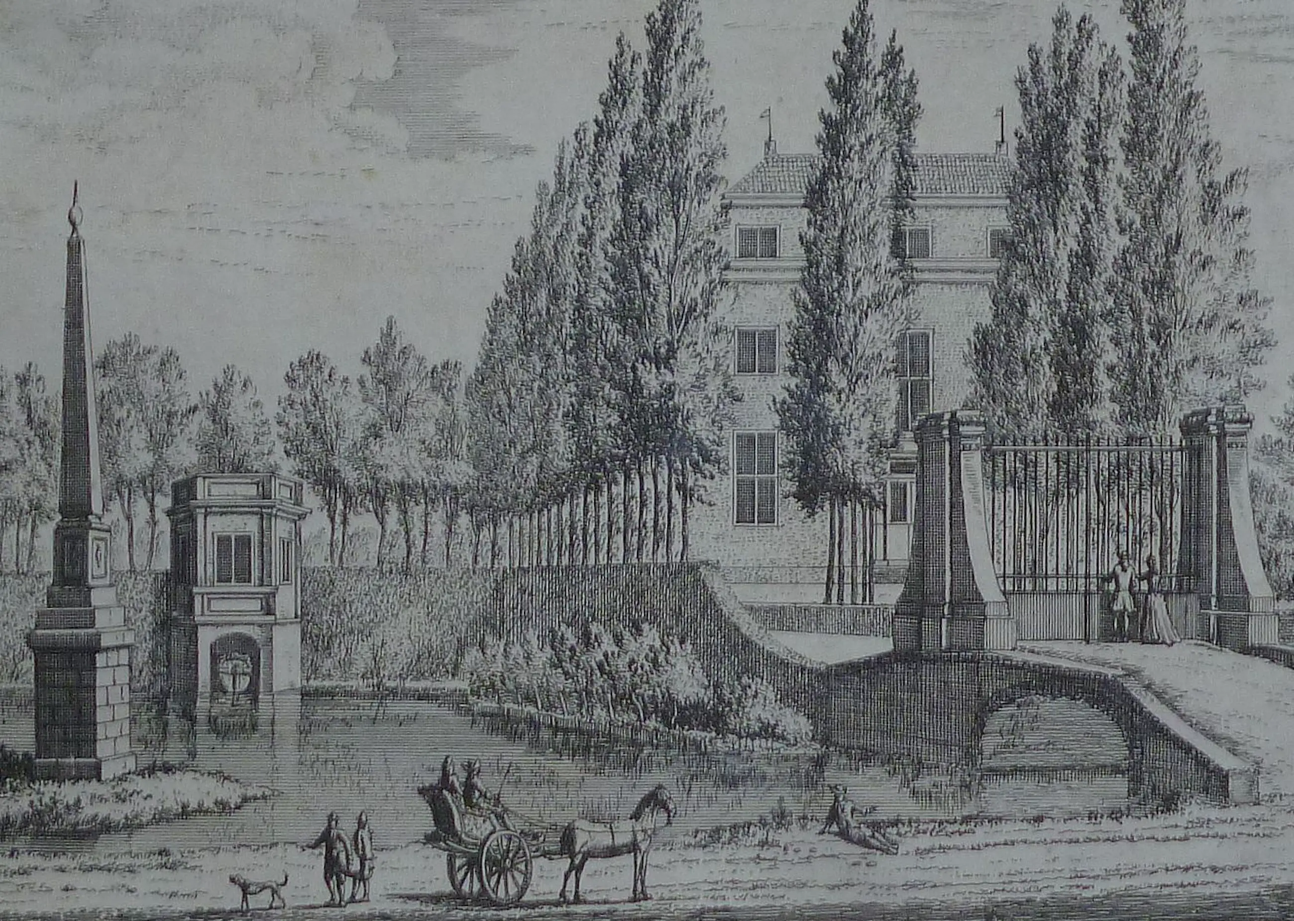 Toegangshek op de brug, links een theekoepel, links op een klein eilandje de mijlpaal (banpaal), die de grens van het rechtsgebied markeert.Huidige locatie van het afgebeelde: Park de Braak, Amstelveen; globaal tussen de Amsterdamseweg en de Keizer Karelweg.