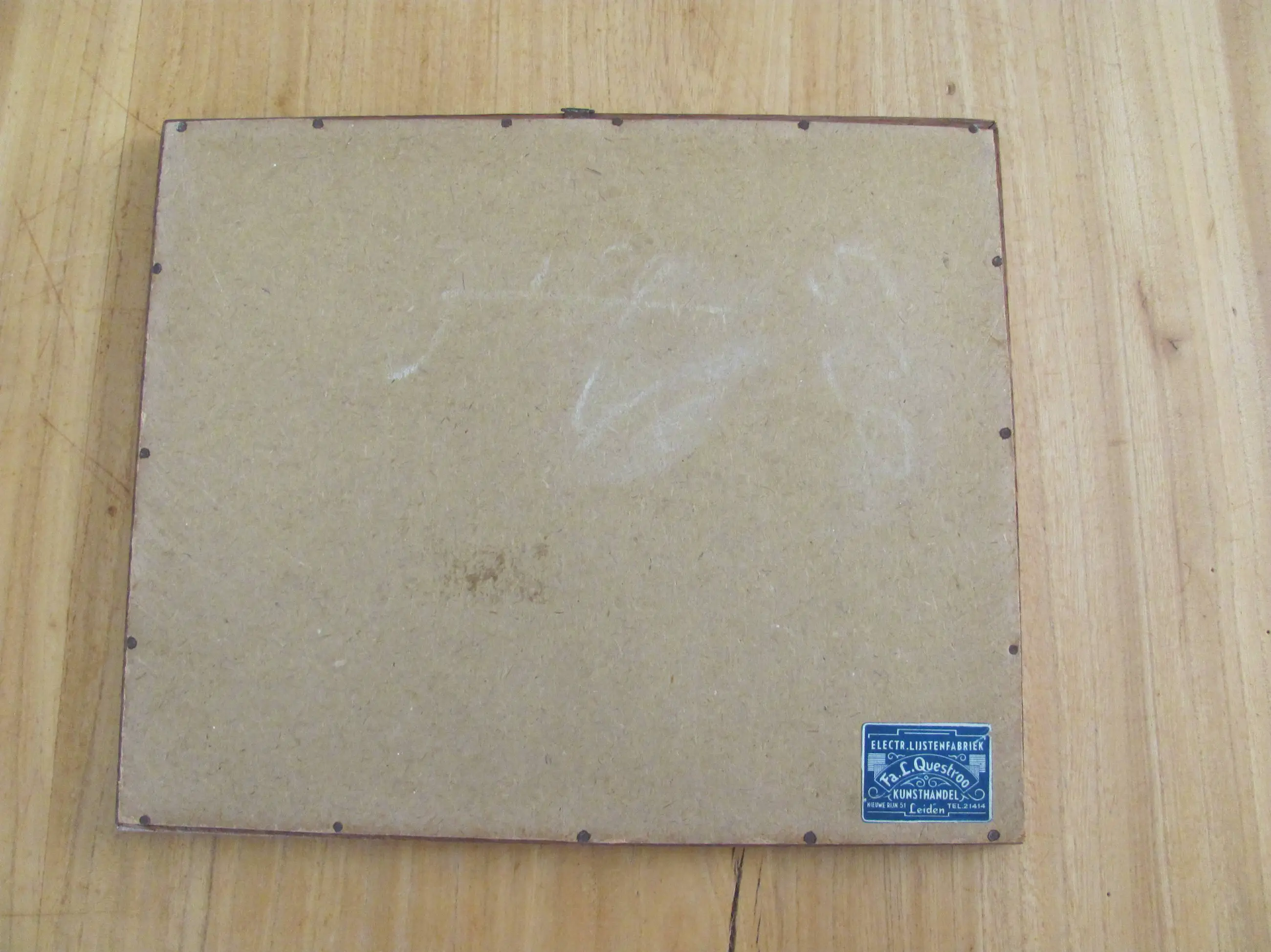 Ingelijst in een houten lijst. Op achterzijde een sticker van Electr. Lijstenfabriek Fa. L. Questroo Kunsthandel in Leiden.