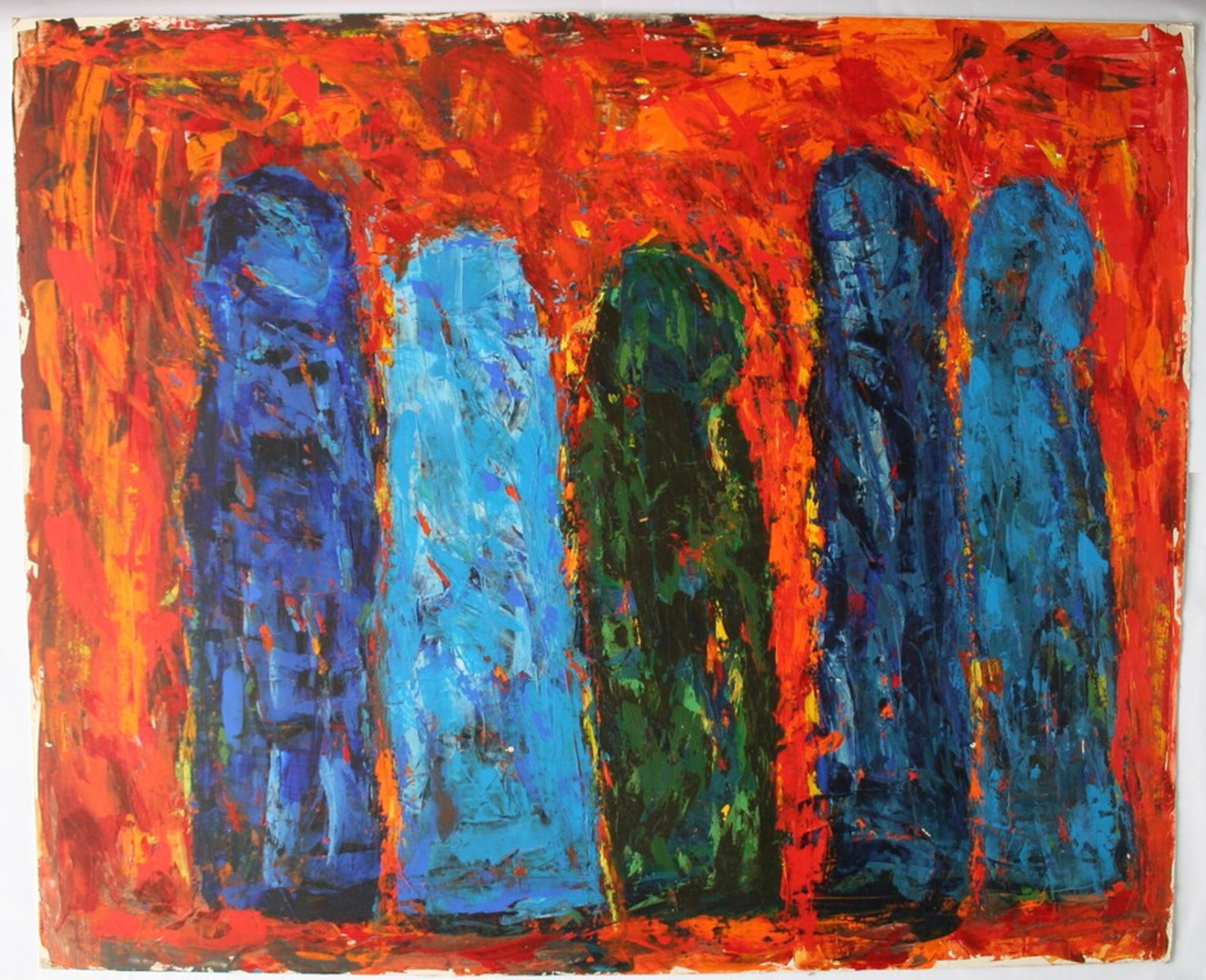 Dit schillderij is rechtsonder, niet leesbaar, gesigneerd. Door de kunstenaar is o.a. een paletmes gebruikt. Afmeting 1 meter bij 82 cm.